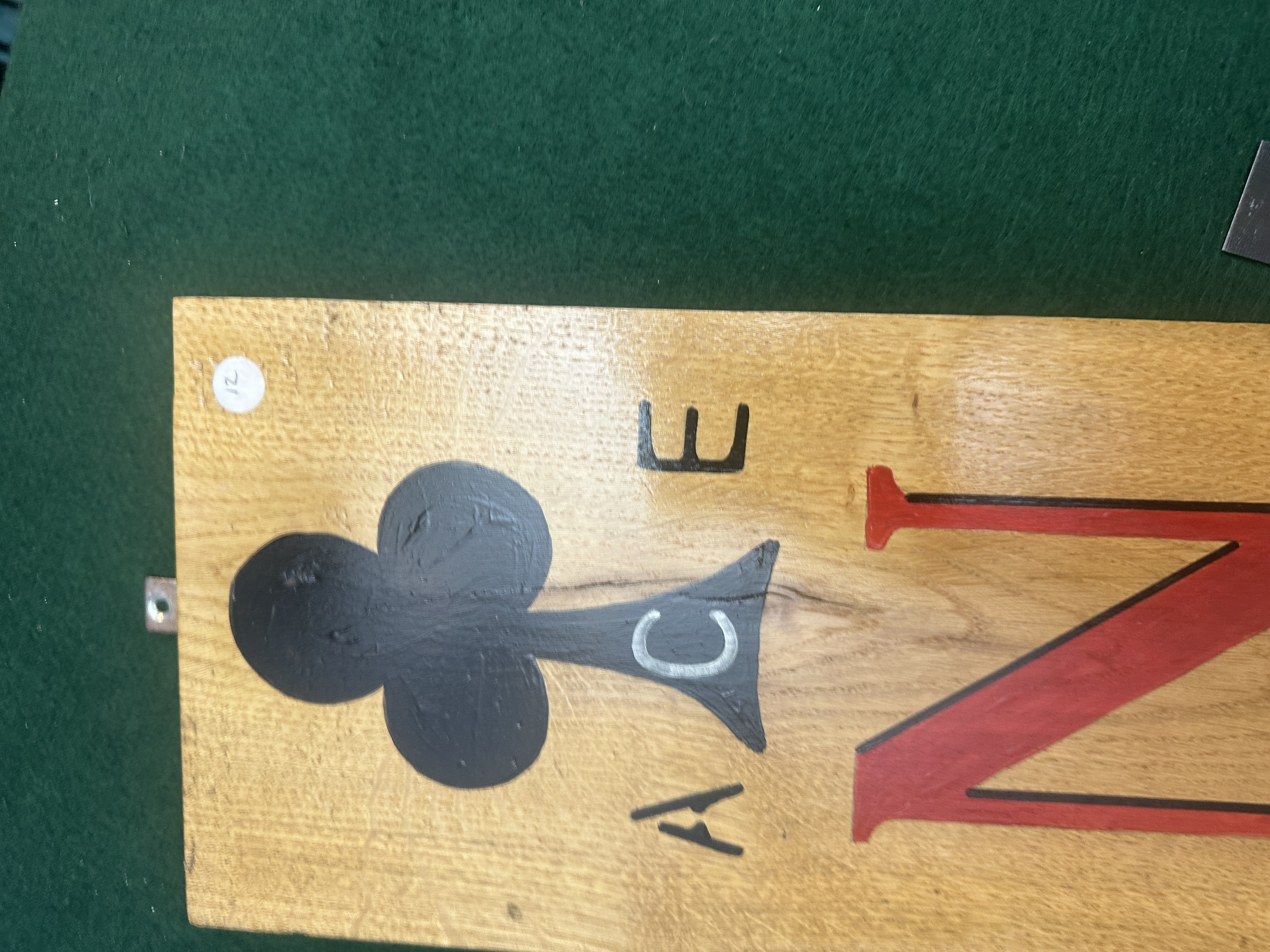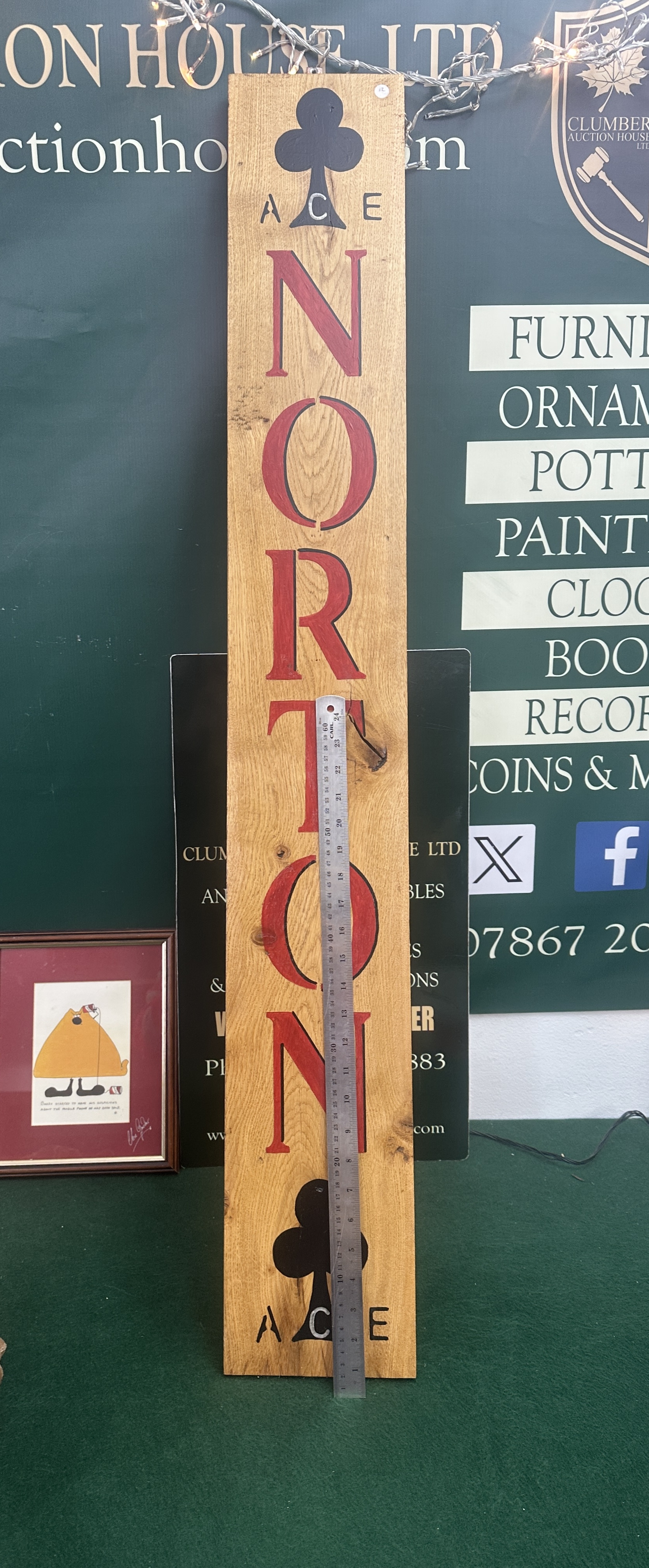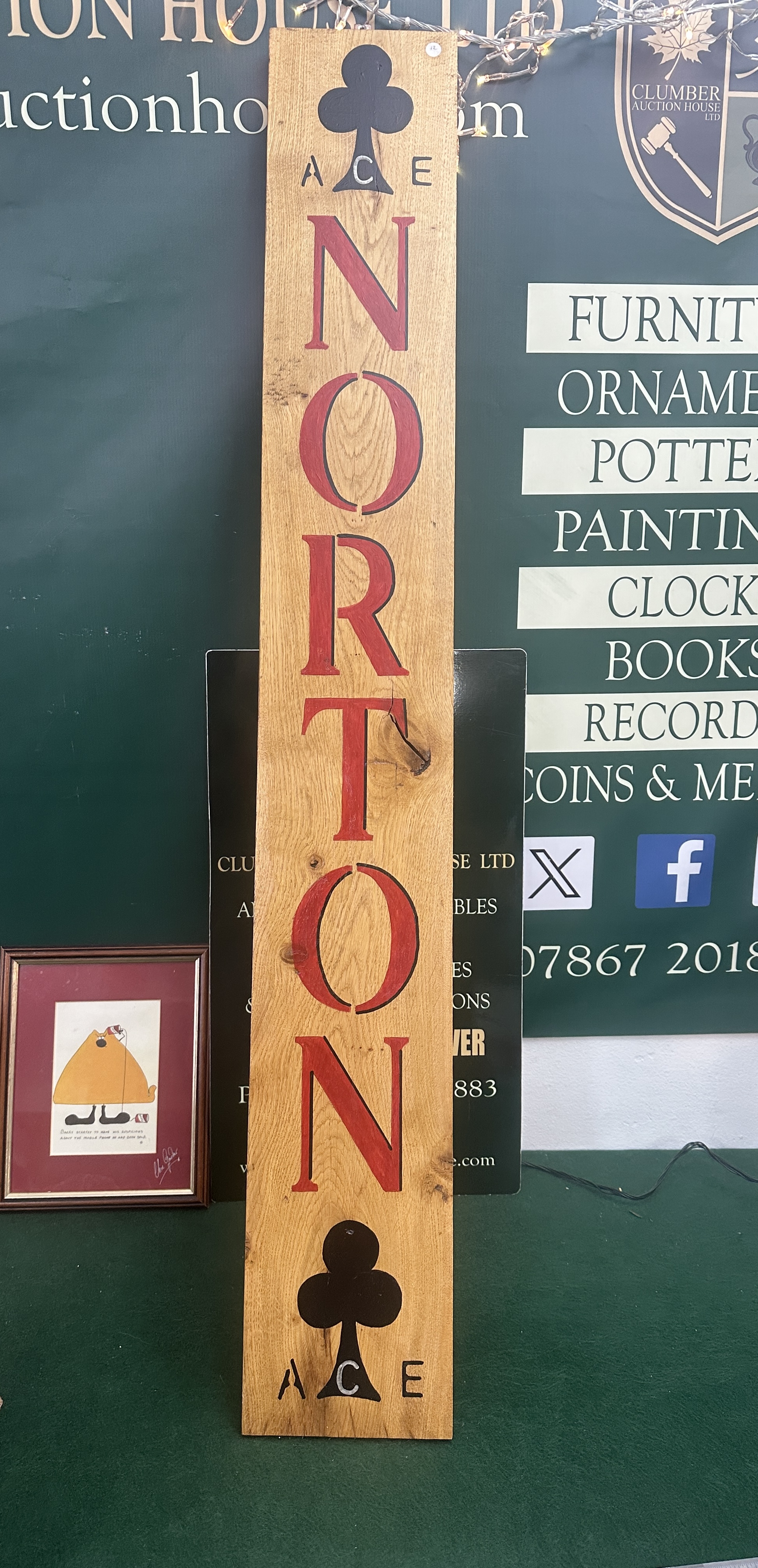 A single, vertically oriented decorative wooden sign crafted in a modern rustic style, likely utilising reclaimed lumber or barrel stave material, consistent with market examples of bar and wine decor. The light-toned wood displays prominent knots and natural grain. The sign features stencilled or painted decoration. The central motif is the vertical text NORTON rendered in large red capital letters. The top and bottom sections are decorated with large black club suit symbols (♣), each accompanied by the smaller painted text ACE. The sign is fitted with small mounting holes near the top edge for hanging.