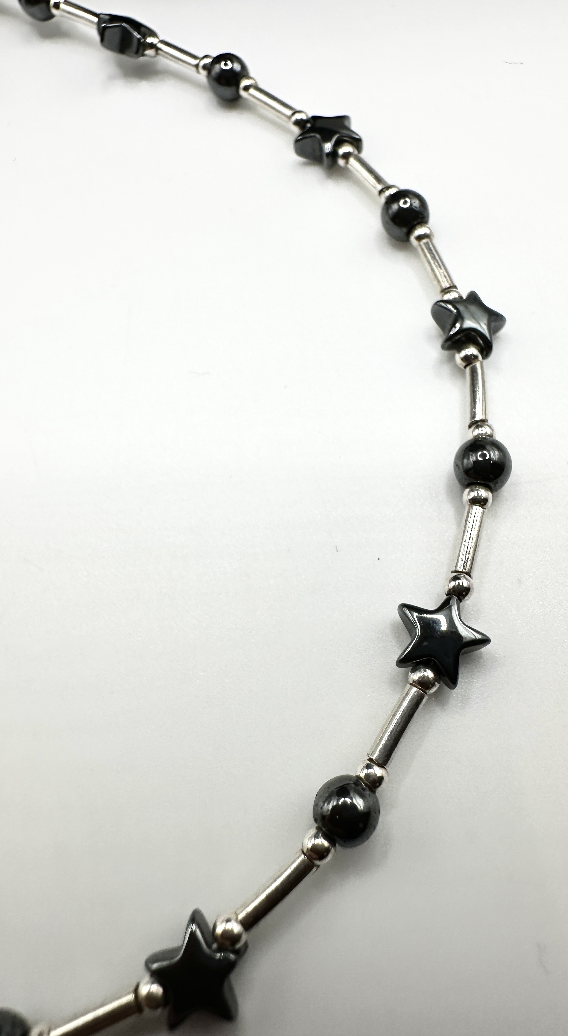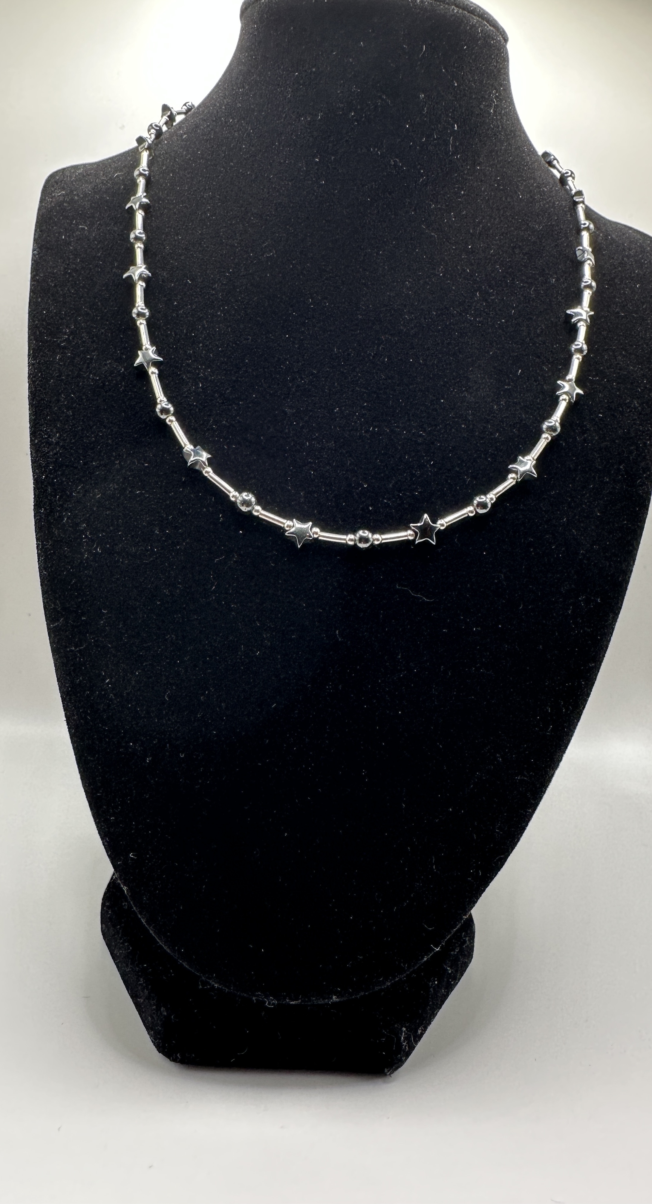 A single contemporary necklace constructed of alternating components set on a wire or cord. The metal components, confirmed as 925 silver, consist of polished cylindrical tube spacers. These spacers alternate with dark, highly polished beads, including small spherical beads and larger star-shaped beads, likely hematite or a similar material. The repeating pattern extends around the entire circumference of the necklace. The piece is displayed on a black velvet mannequin bust.
