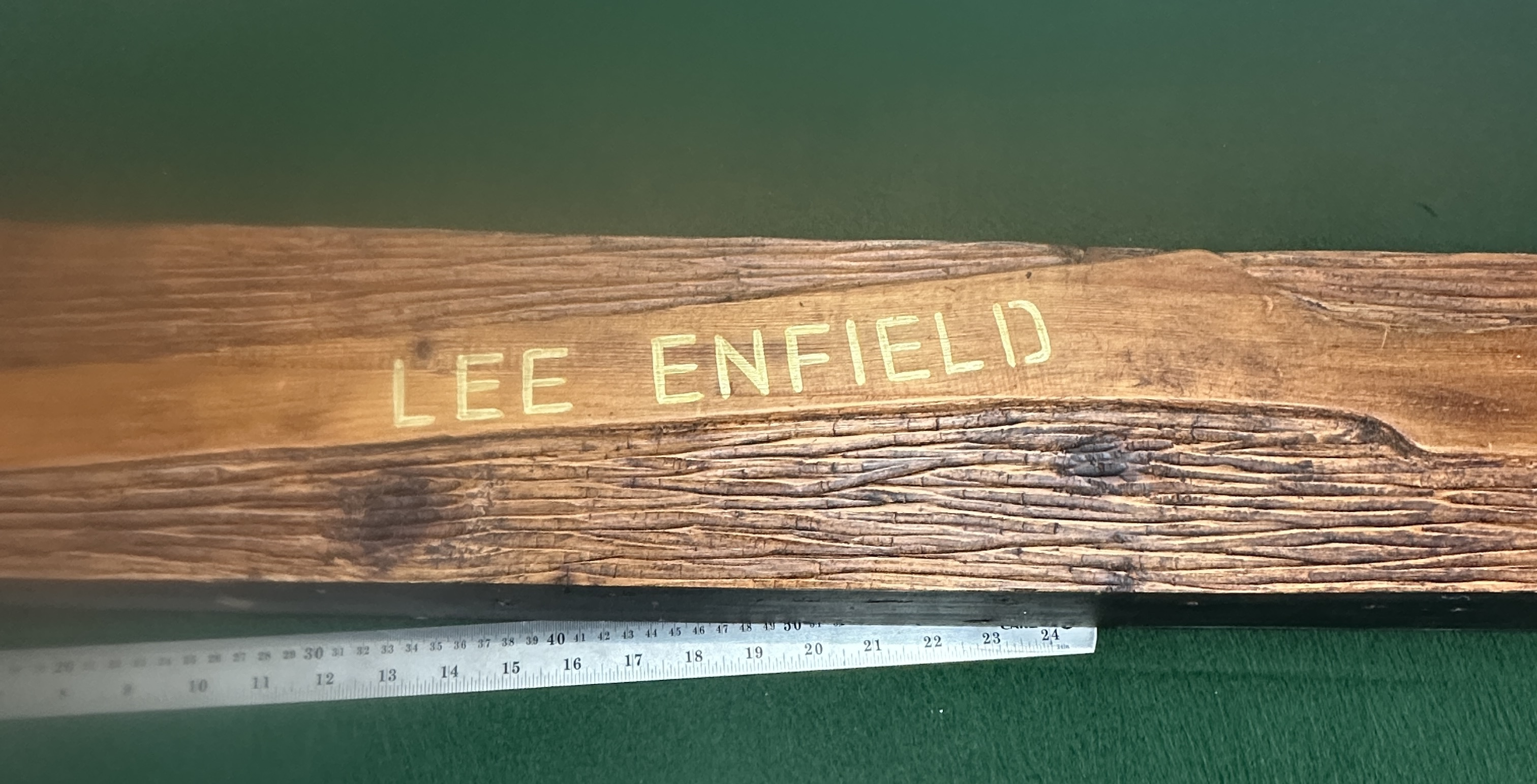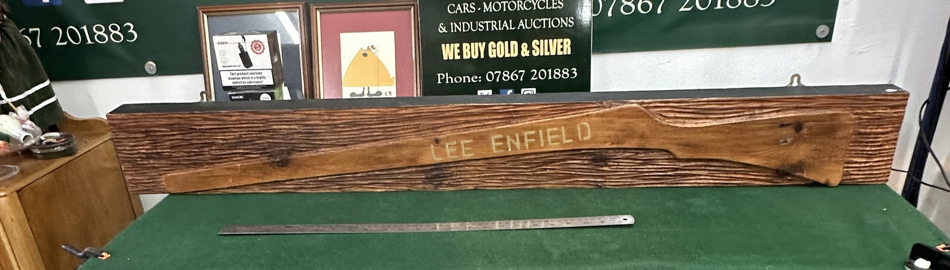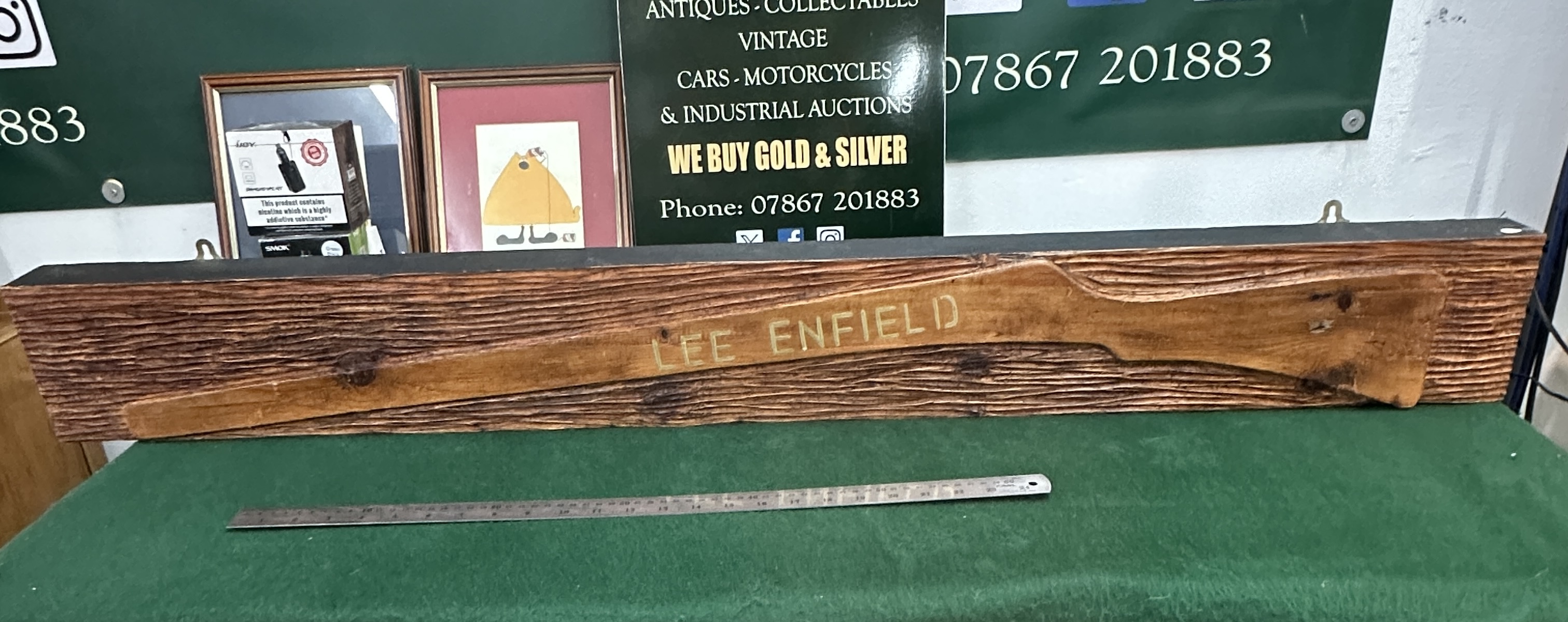 A large, rustic wooden wall plaque constructed from multiple pieces of wood. The background plank features a dark stain and a deeply textured, carved surface resembling rough-hewn timber. This plank is mounted on a black support backing. Applied in high relief is the silhouette of a long-arm rifle, executed in a smoother, lighter wood tone. Centred on the rifle silhouette is the incised inscription LEE ENFIELD, highlighted with a yellow or gold colour fill. The plaque is designed for wall mounting, with visible hanging hardware on the reverse or top edge.