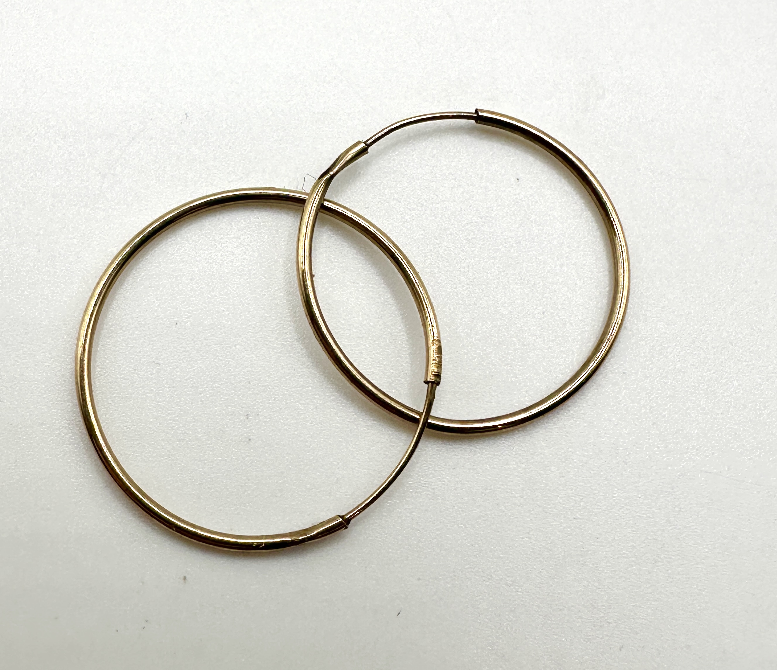 A pair of minimalist sleeper or endless hoop earrings, constructed from thin-gauge 9k gold wire. The hoops feature a smooth, circular form with hinged pin closures designed for seamless wear. Minute, illegible markings, possibly hallmarks, are visible near the connection points on both hoops.