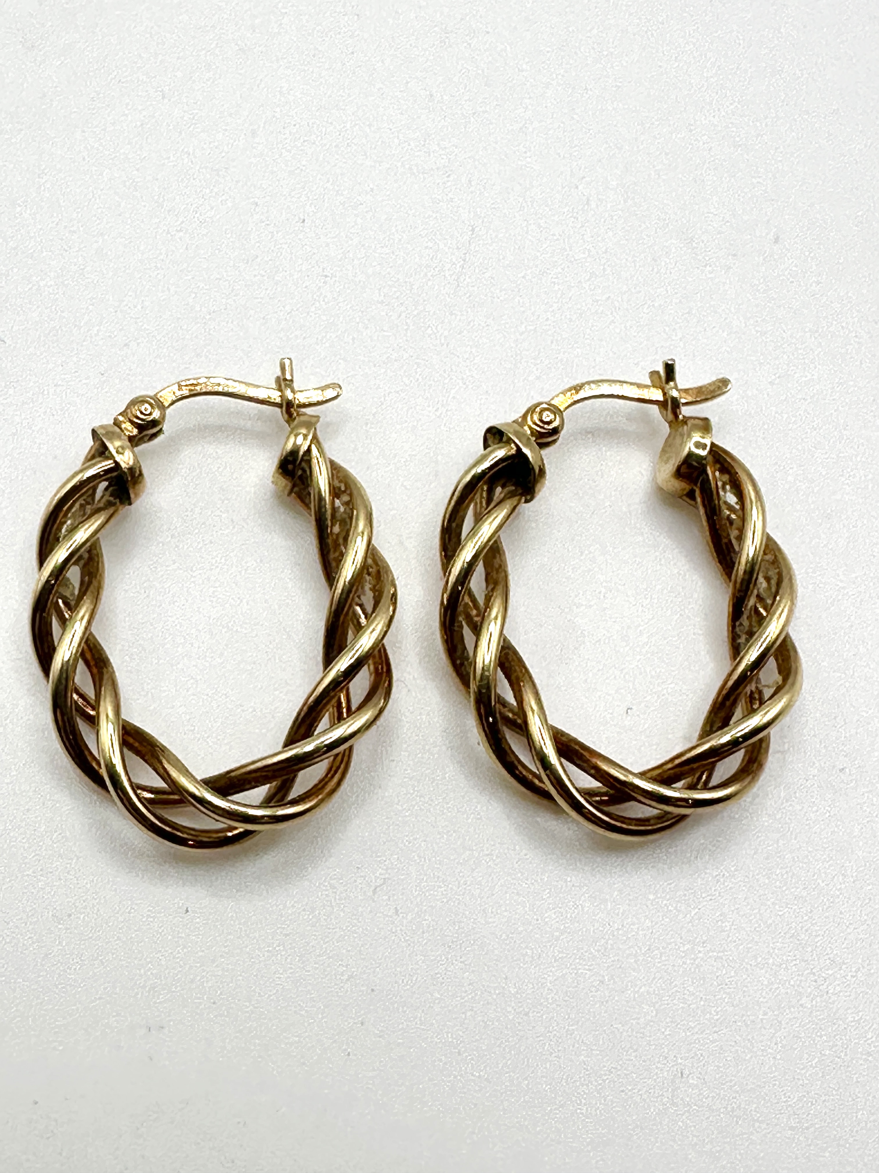 A pair of hoop earrings constructed from confirmed 9k gold. The medium-sized circular hoops feature a twisted rope or cable design, formed by multiple coiled strands creating a substantial profile. The earrings are secured by hinged closures. No identifying hallmarks or maker’s marks are visible.