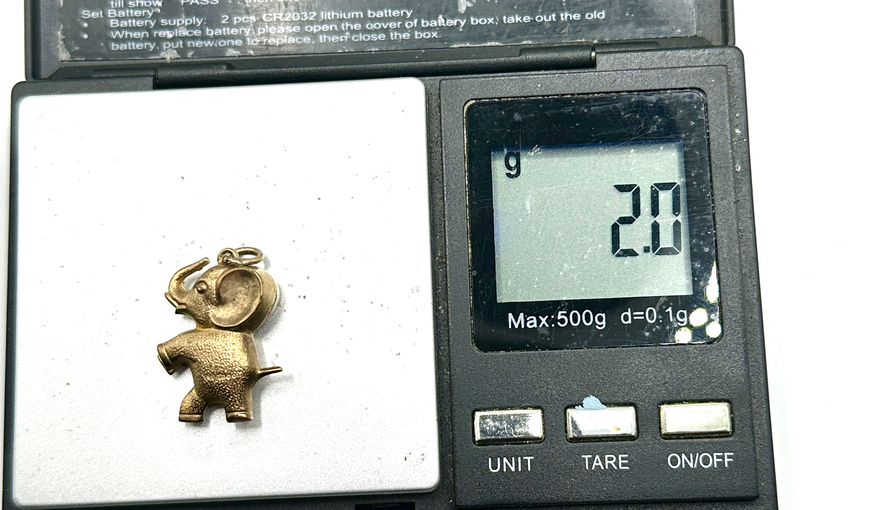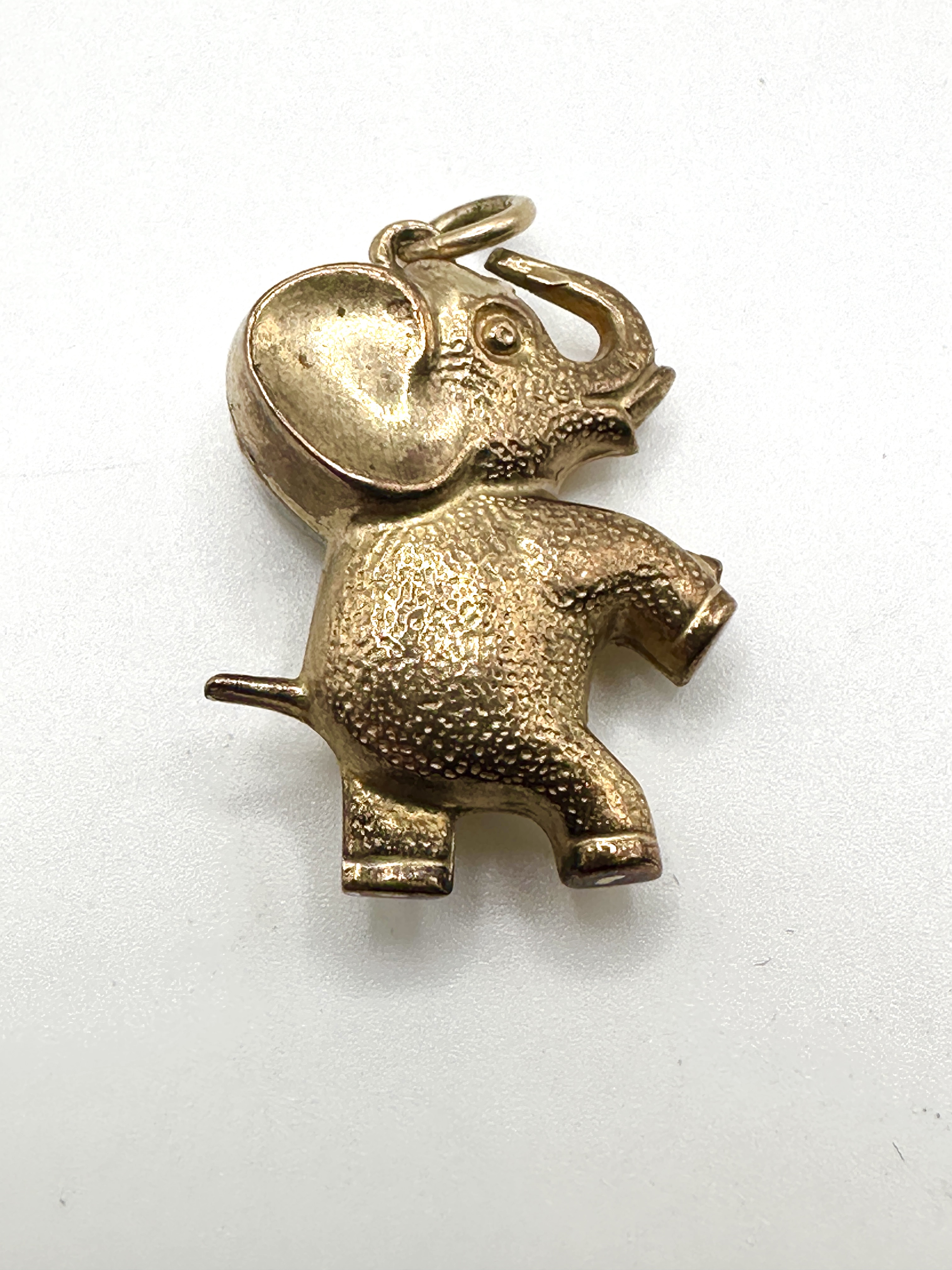 A single figural charm, confirmed to be crafted from 9k gold. The piece is formed as a stylized elephant standing with its trunk raised. The body of the elephant features a dense, granular texture, suggesting a cast or textured finish. A simple jump ring is attached above the head, allowing the item to be worn as a pendant or added to a charm bracelet. No visible hallmarks or maker’s marks are discernible on the surface of the charm.