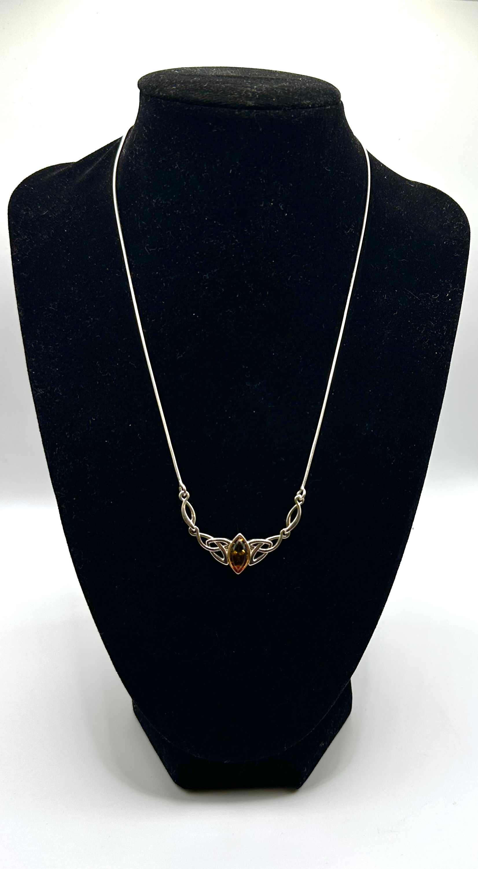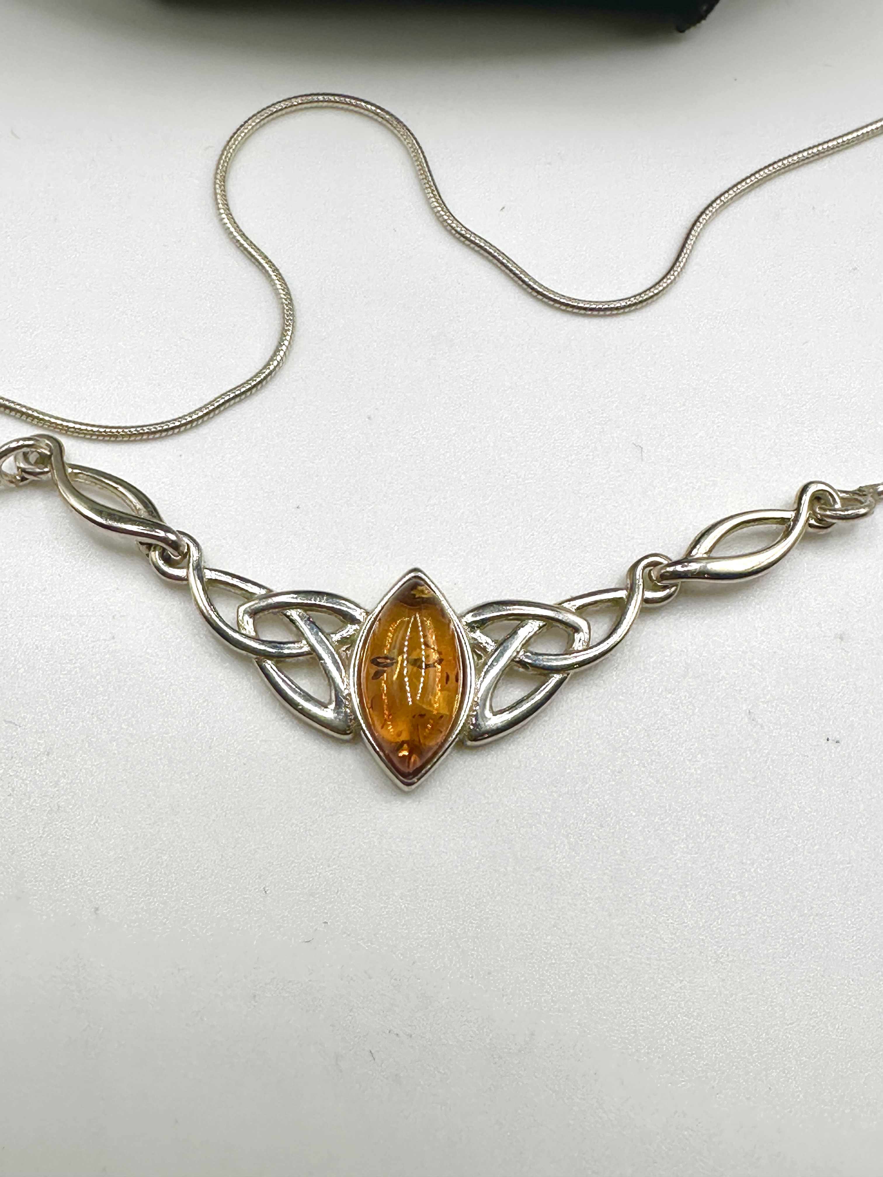 A single necklace constructed of 925 silver, featuring a central decorative element suspended from a fine, flexible snake chain. The design is executed in the Celtic Revival style, incorporating interconnected knot motifs flanking the central stone. The central element holds a marquise-cut cabochon stone of translucent honey-coloured Amber. The Amber exhibits typical internal inclusions. The metalwork is polished and bright. No visible hallmarks or maker’s marks were discernible upon inspection.