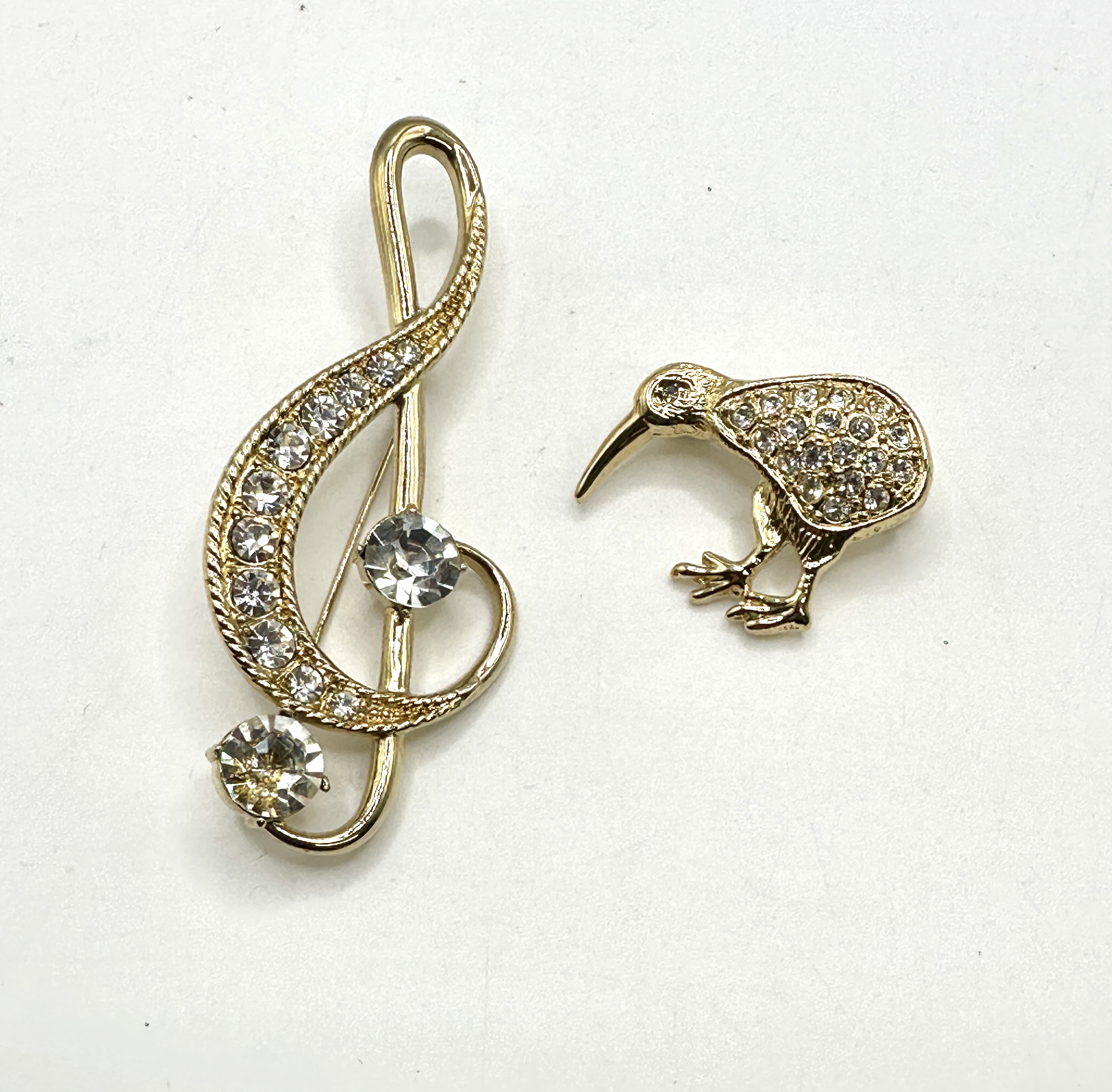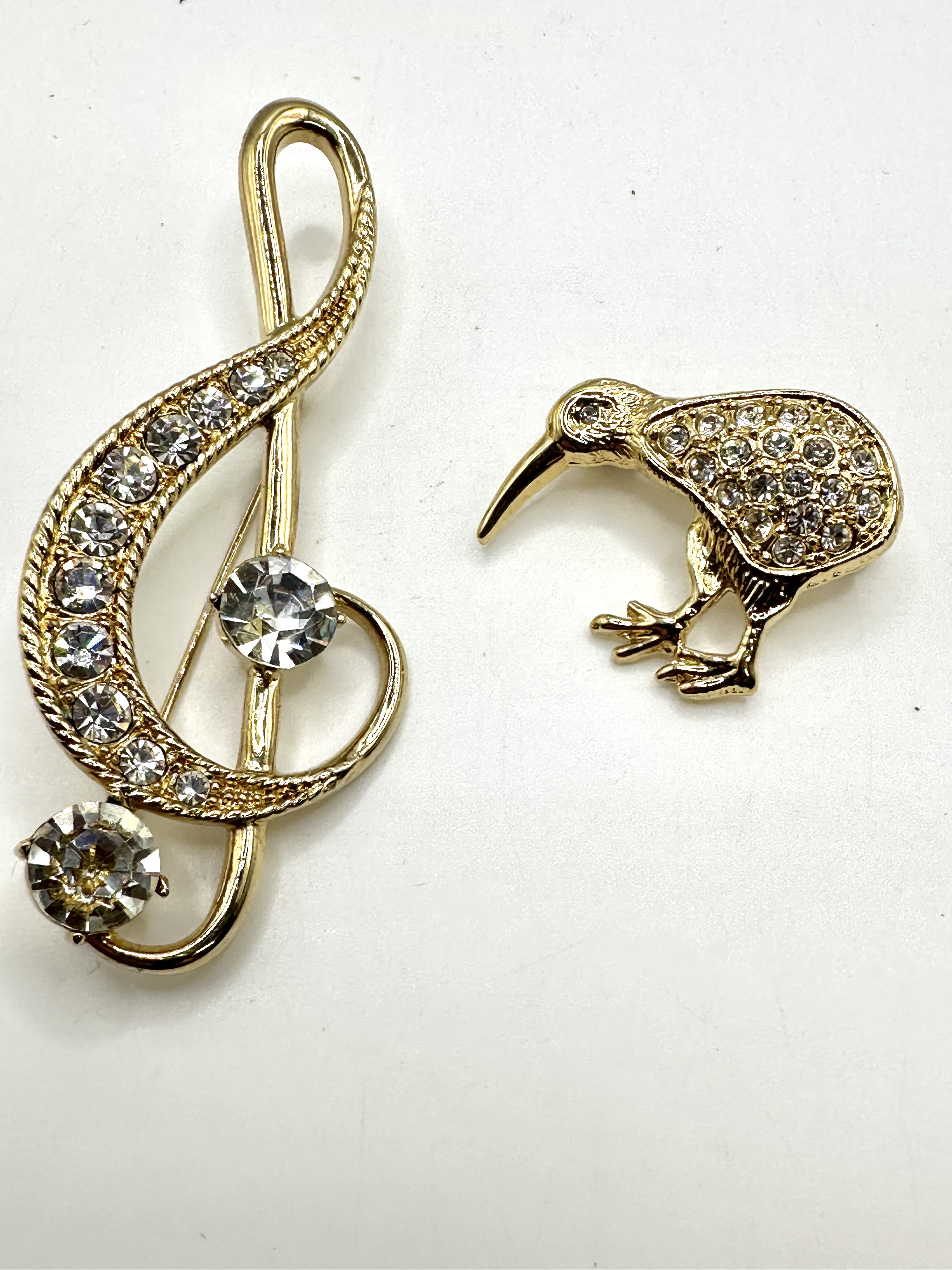 Two costume jewellery brooches comprising a treble clef musical symbol and a kiwi bird. Both pieces are constructed from a yellow-tone base metal and embellished with numerous clear faceted crystals and rhinestones. The treble clef pin features a row of small stones along the main curve, punctuated by two larger round-cut focal stones. The kiwi bird brooch is pavé-set with small stones across the body and includes a single stone representing the eye. Both items feature a textured reverse finish and are equipped with standard hinged pin stems and safety clasps. No maker’s marks or hallmarks are visible.