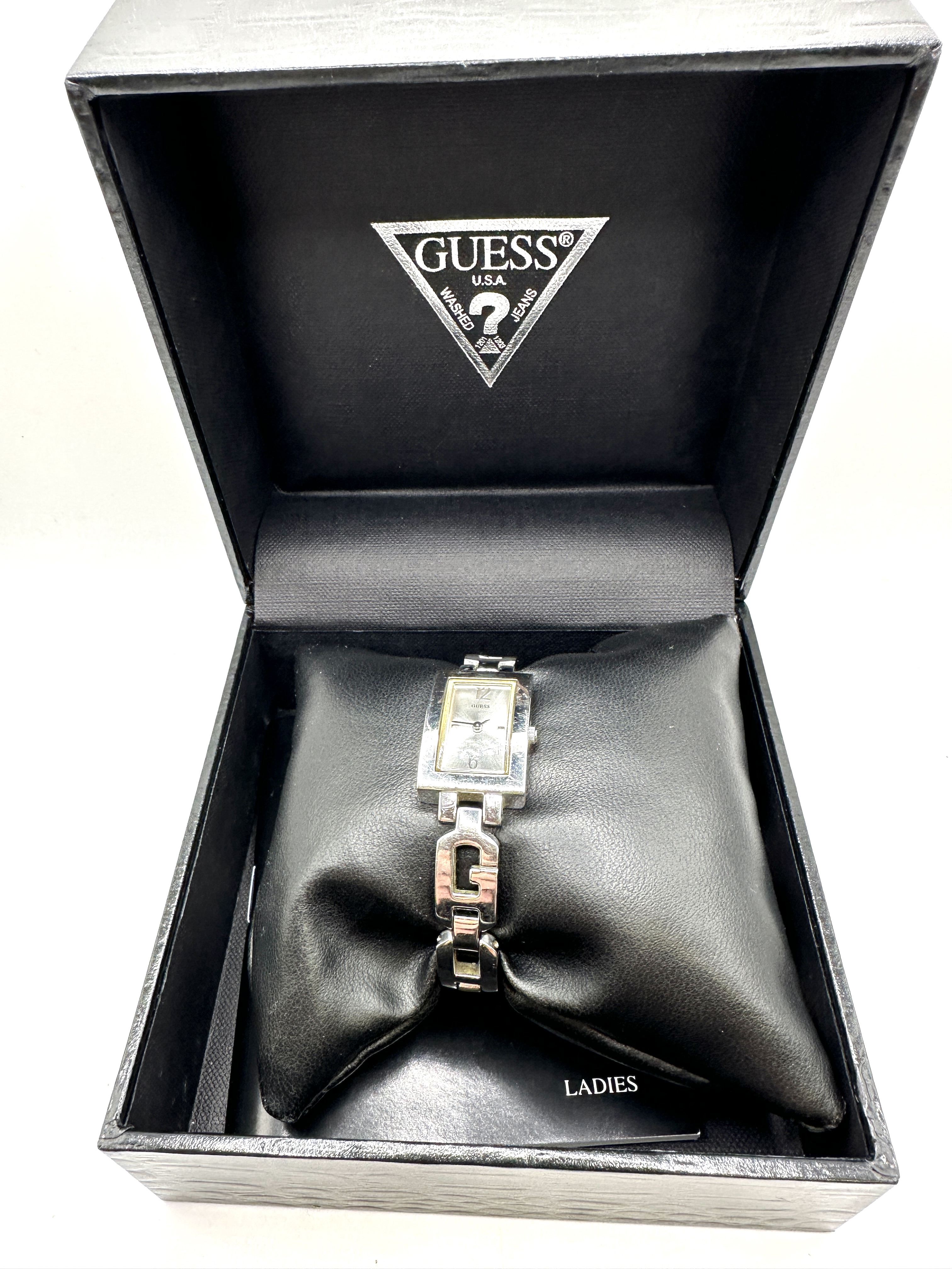 A Guess ladies’ quartz wristwatch featuring a rectangular silver-tone case and an integrated decorative link bracelet with G-logo accents. The light-toned dial displays Arabic numerals at the twelve and six o’clock positions and is signed GUESS. The timepiece is housed in its original black crocodile-embossed presentation box with a silver-tone triangular logo on the interior lid. The lot includes a black faux-leather cushion and a Ladies booklet.