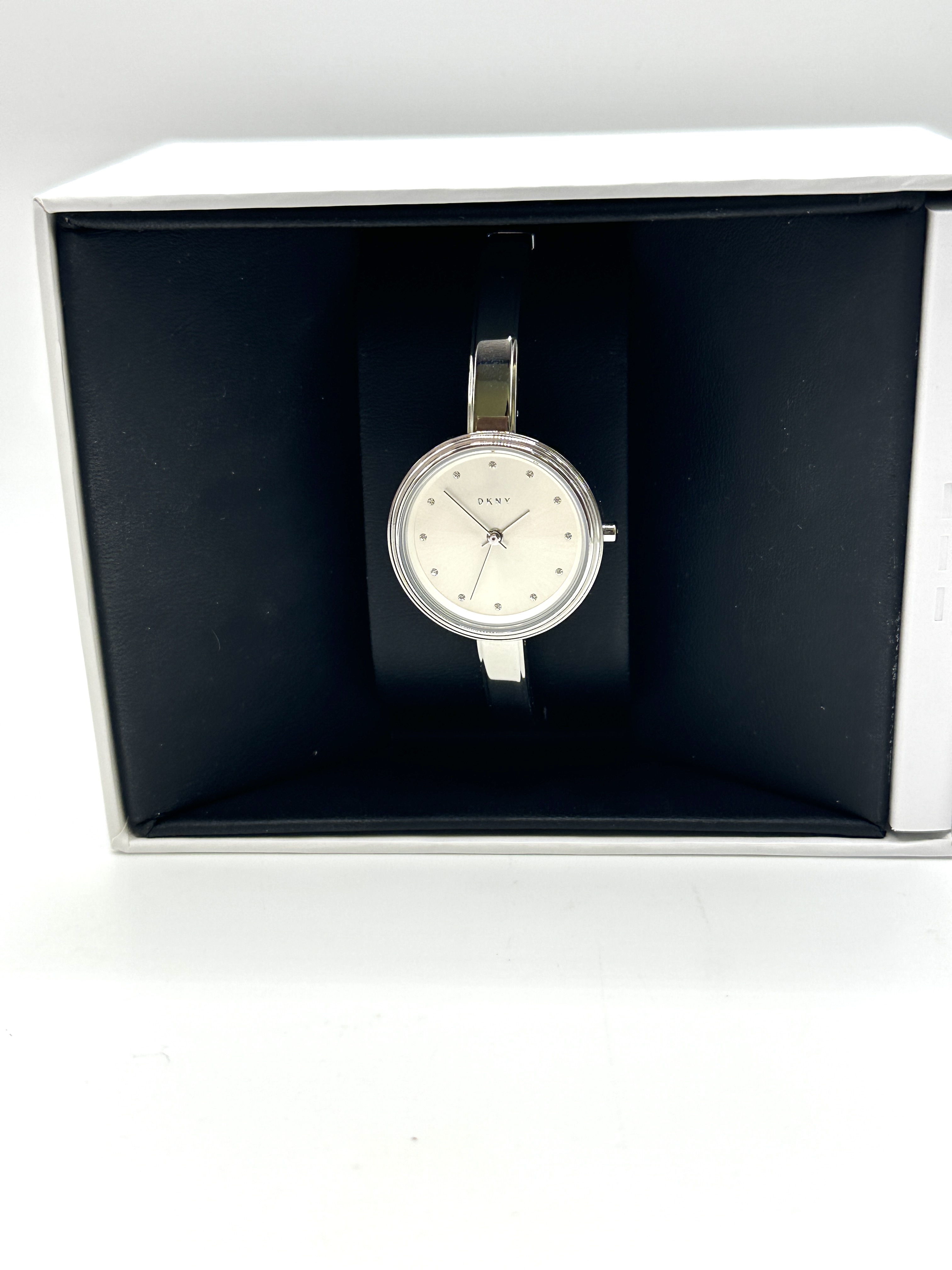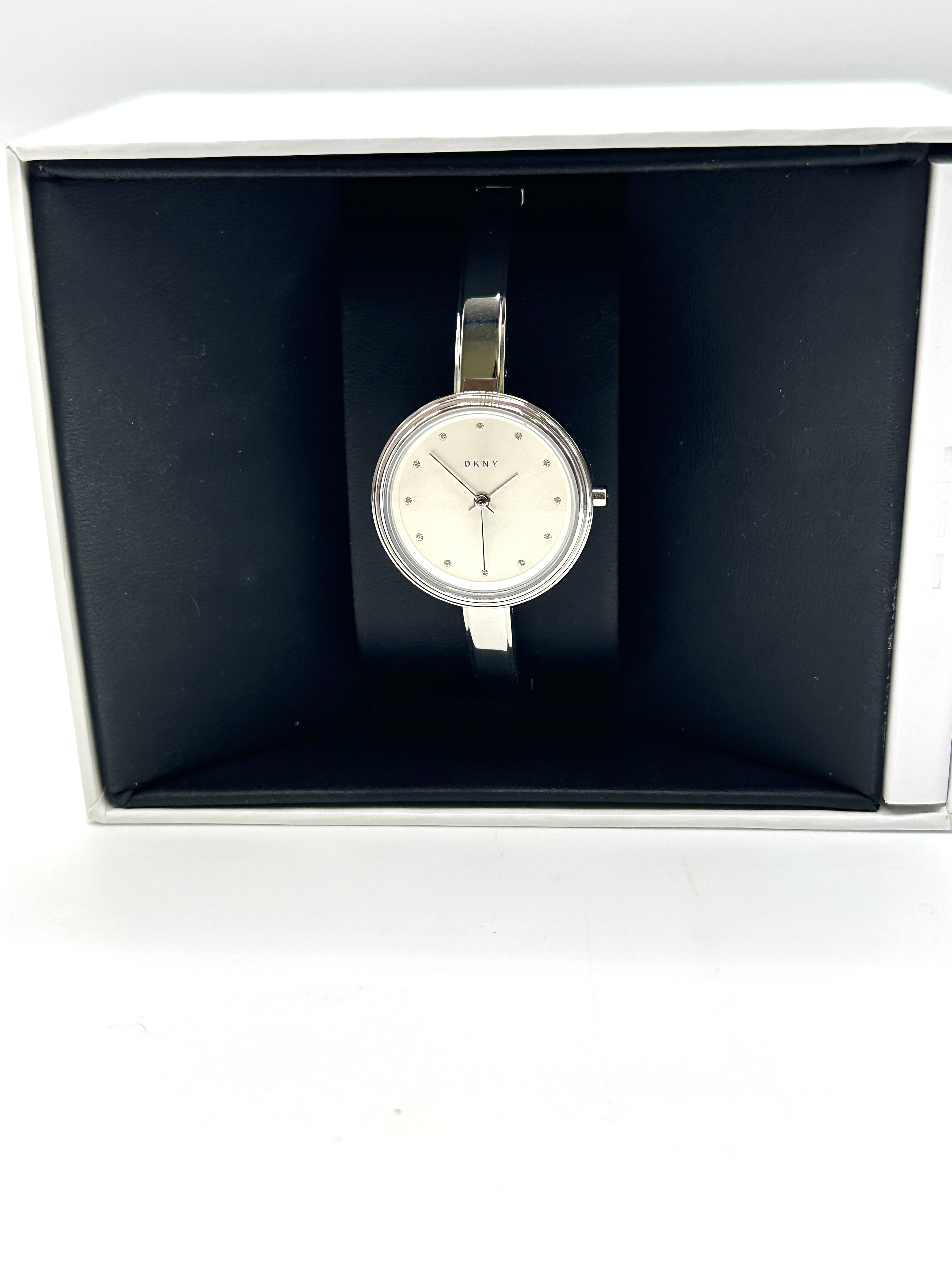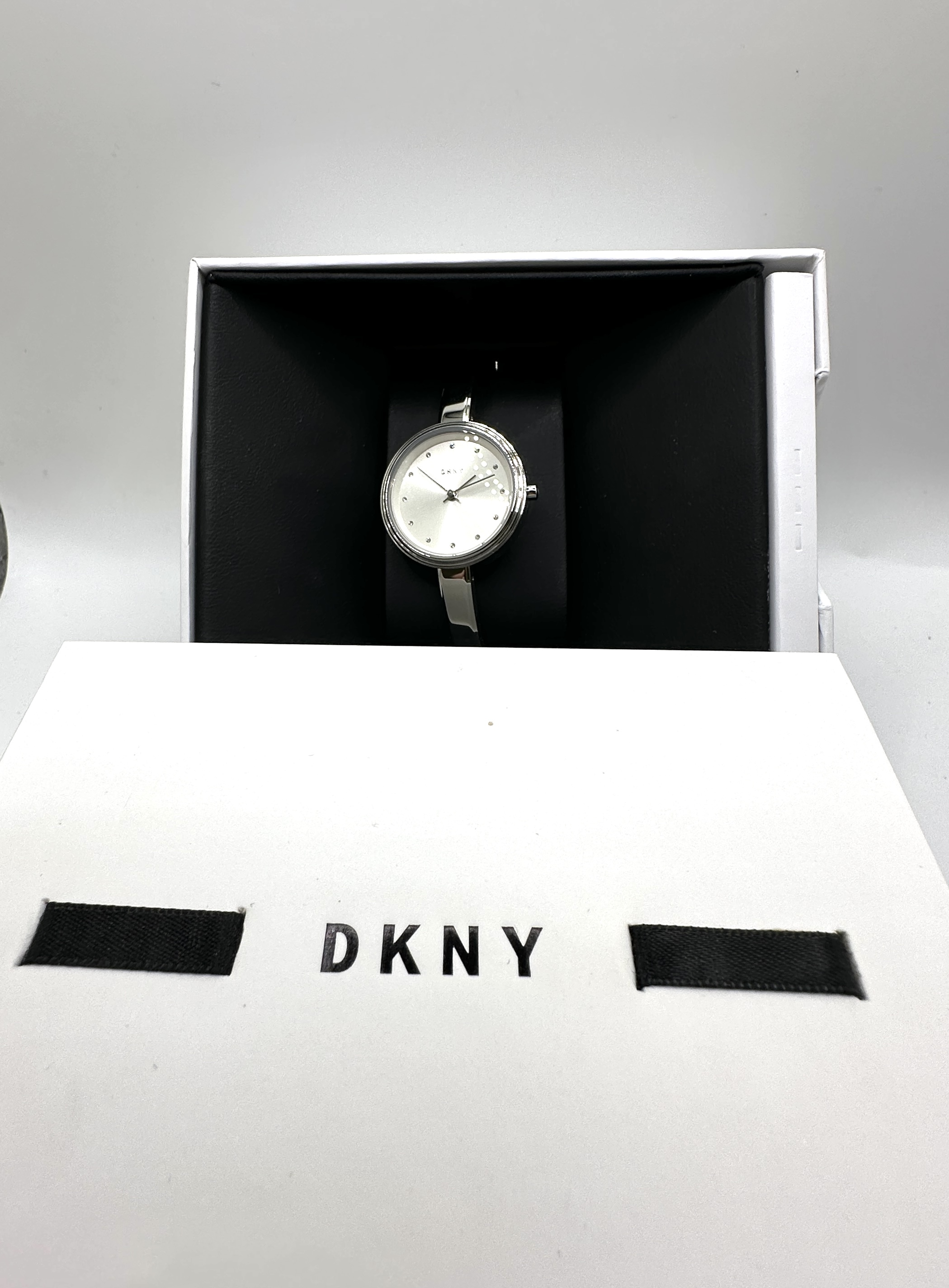 A DKNY Murray model NY2598 women’s wristwatch featuring a circular silver-tone case and a champagne-coloured sunray dial. The dial is accented with crystal-set hour markers and silver-tone hands, with the DKNY branding positioned below the twelve o’clock marker. The timepiece is integrated into a polished, silver-tone bangle-style metal bracelet. The watch is presented in its original white branded presentation box with a black-lined interior.
