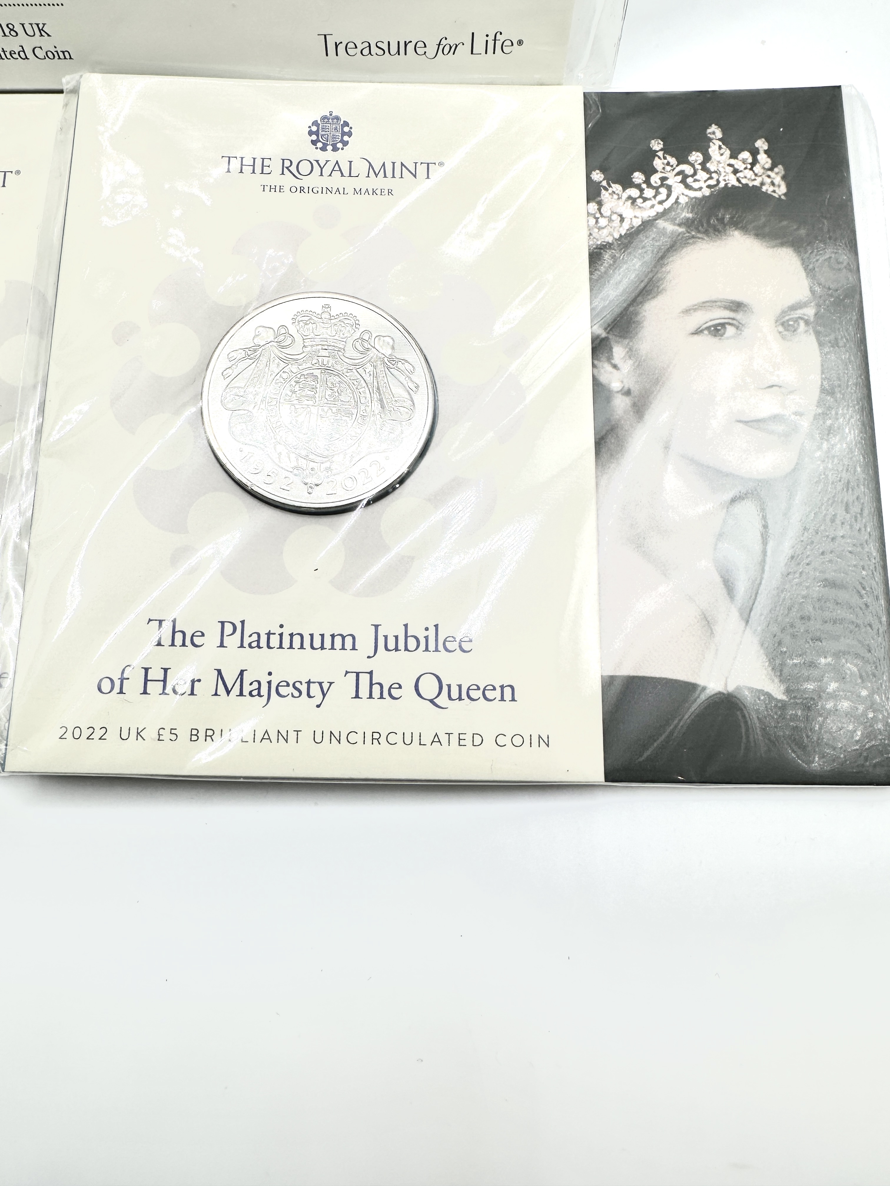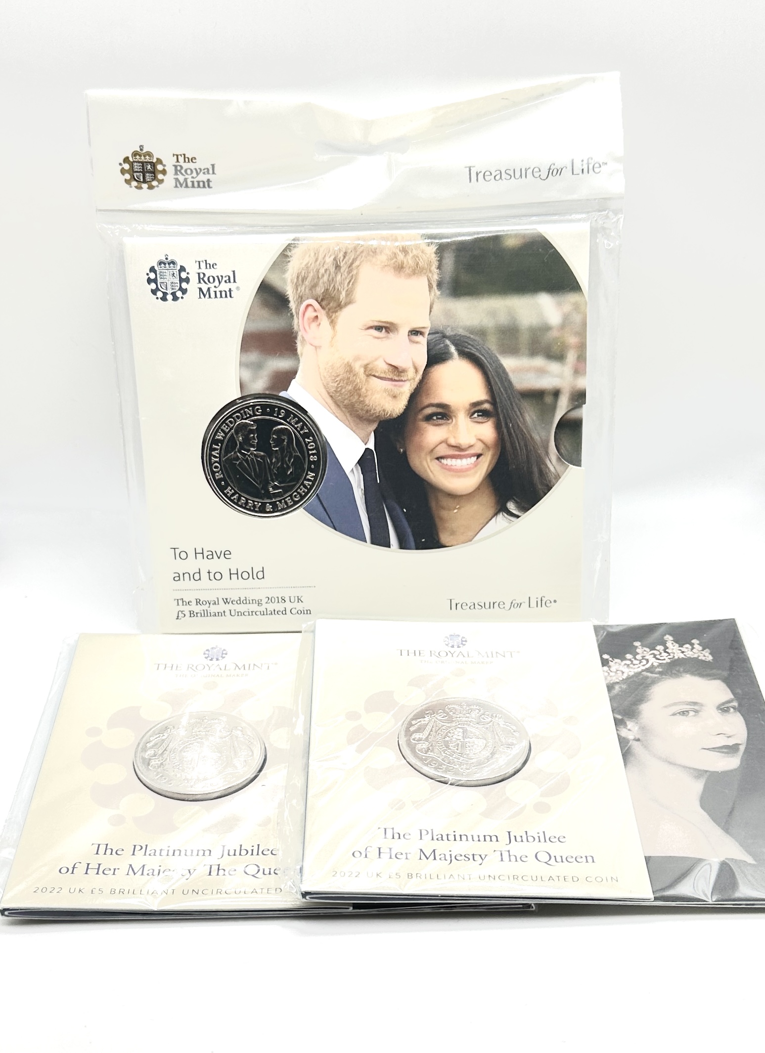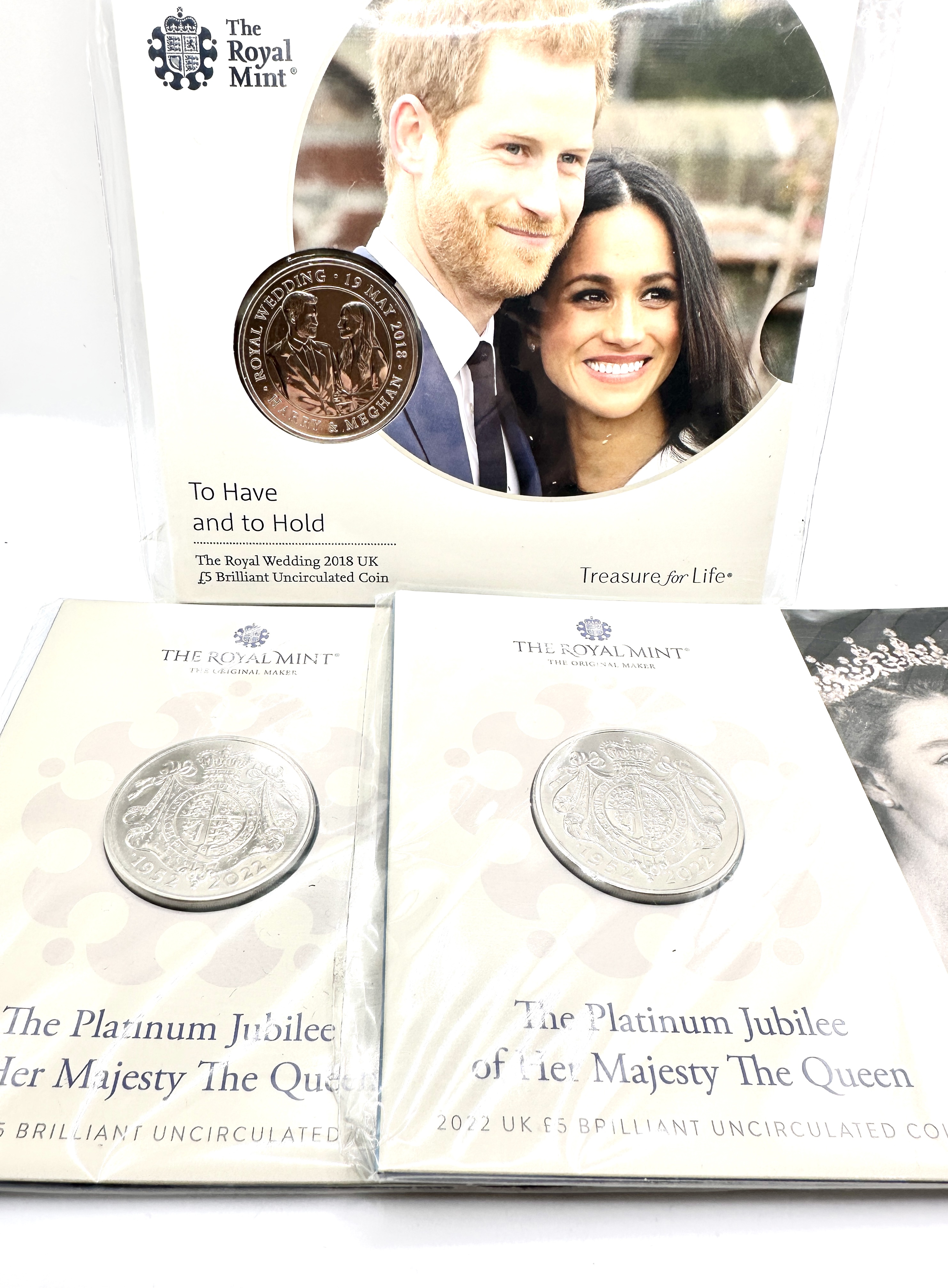 A collection of The Royal Mint commemorative £5 brilliant uncirculated coins in their original presentation packaging. The group includes several The Platinum Jubilee of Her Majesty The Queen 2022 UK £5 coins, featuring a heraldic reverse design with the dates 1952-2022 and accompanying portrait booklets. Also included is The Royal Wedding 2018 UK £5 coin, commemorating the marriage of Prince Harry and Meghan Markle, presented in a photographic card folder. Each coin is housed in its original protective plastic sleeve and exhibits a brilliant uncirculated finish.