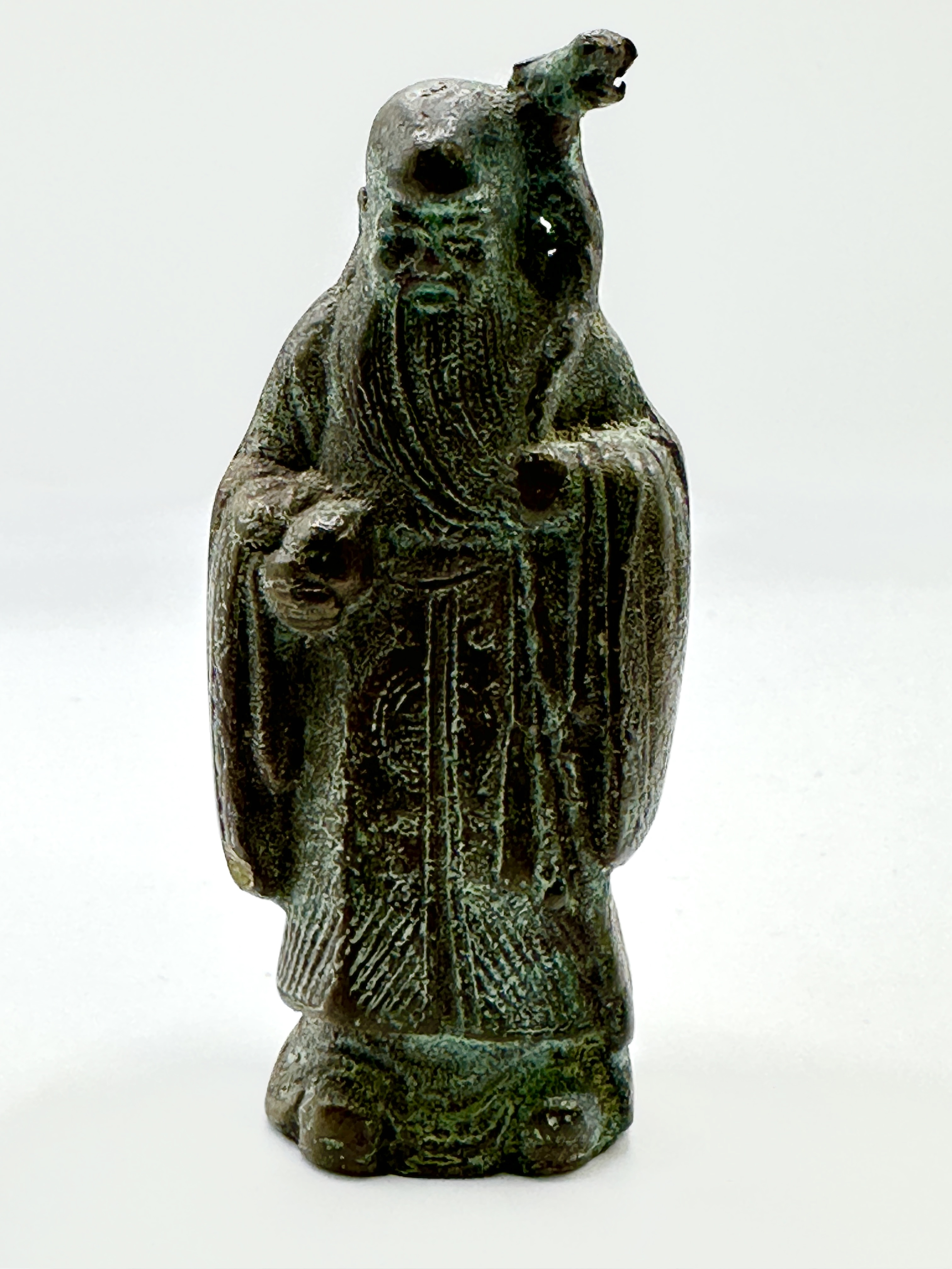 A cast bronze figurine depicting Shoulao, the Chinese God of Longevity. The figure is rendered in a traditional standing posture, featuring a characteristic high forehead, long beard, and flowing robes. The deity holds a peach in his right hand and a staff with a dragon-head finial in his left. A circular shou symbol is visible in relief on the upper back of the figure. The surface is characterised by a heavy, green verdigris patina throughout.