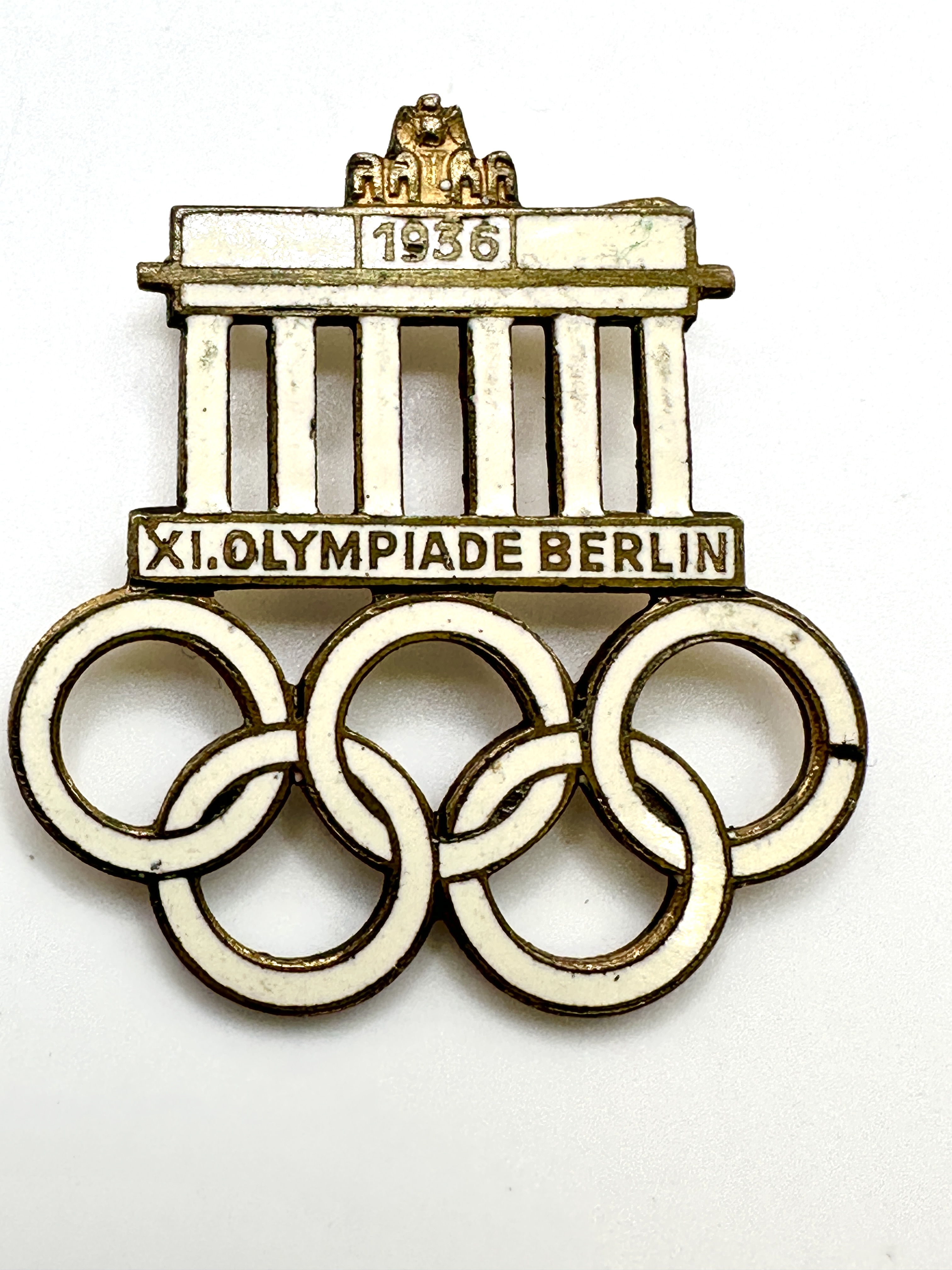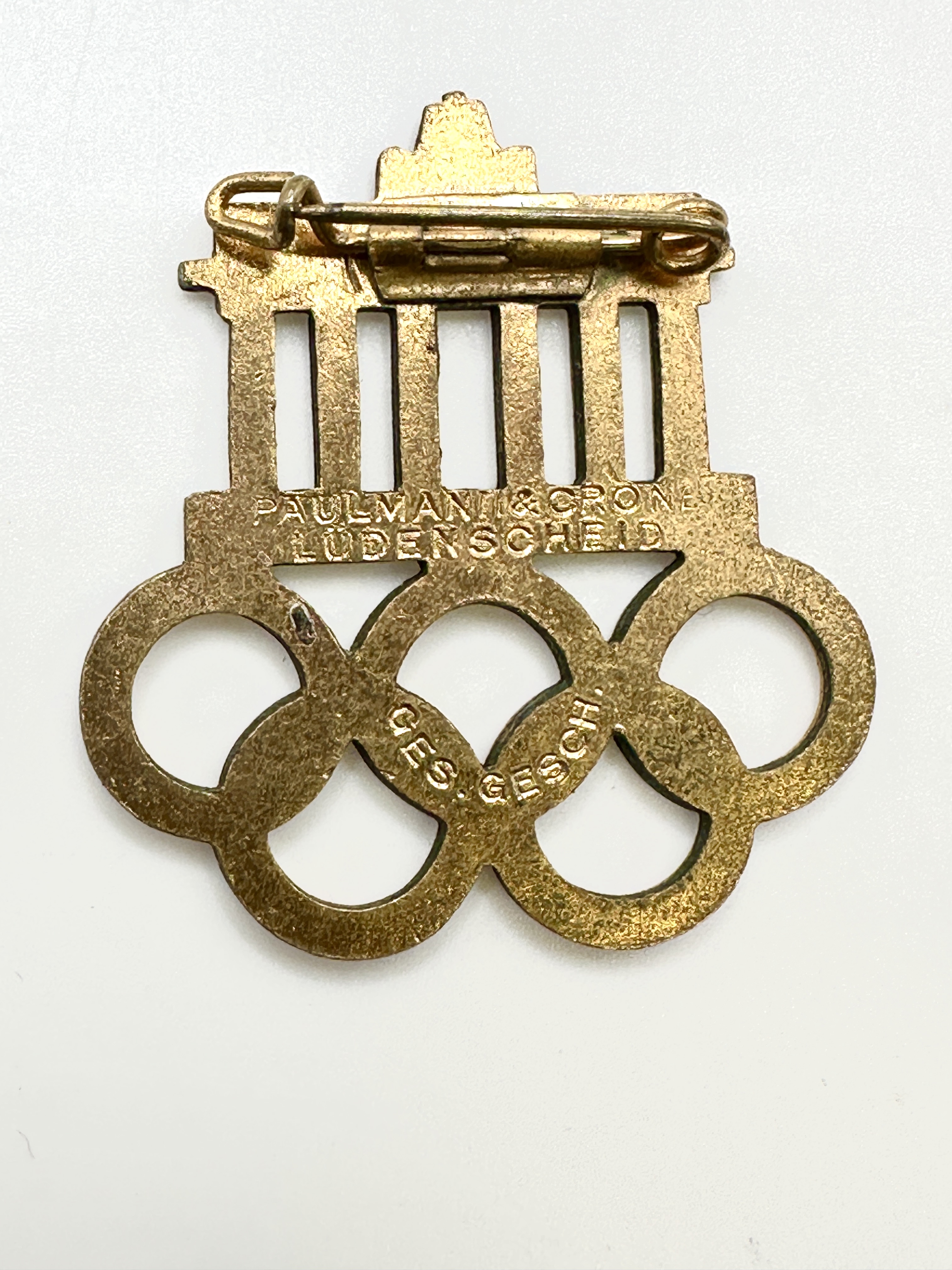 A commemorative visitor pin for the XI Olympiad held in Berlin in 1936. The badge is constructed from metal with white enamel inlay. The obverse design depicts the Brandenburg Gate surmounted by a quadriga, with the date 1936 positioned below the chariot. A horizontal bar is inscribed XI. OLYMPIADE BERLIN, situated above the five interlocking Olympic rings. The reverse features a textured gold-tone finish and is fitted with a pin-back fastening and safety catch. It bears the maker mark PAULMAN and CRONE LUDENSCHEID and the legal protection mark GES. GESCH.
