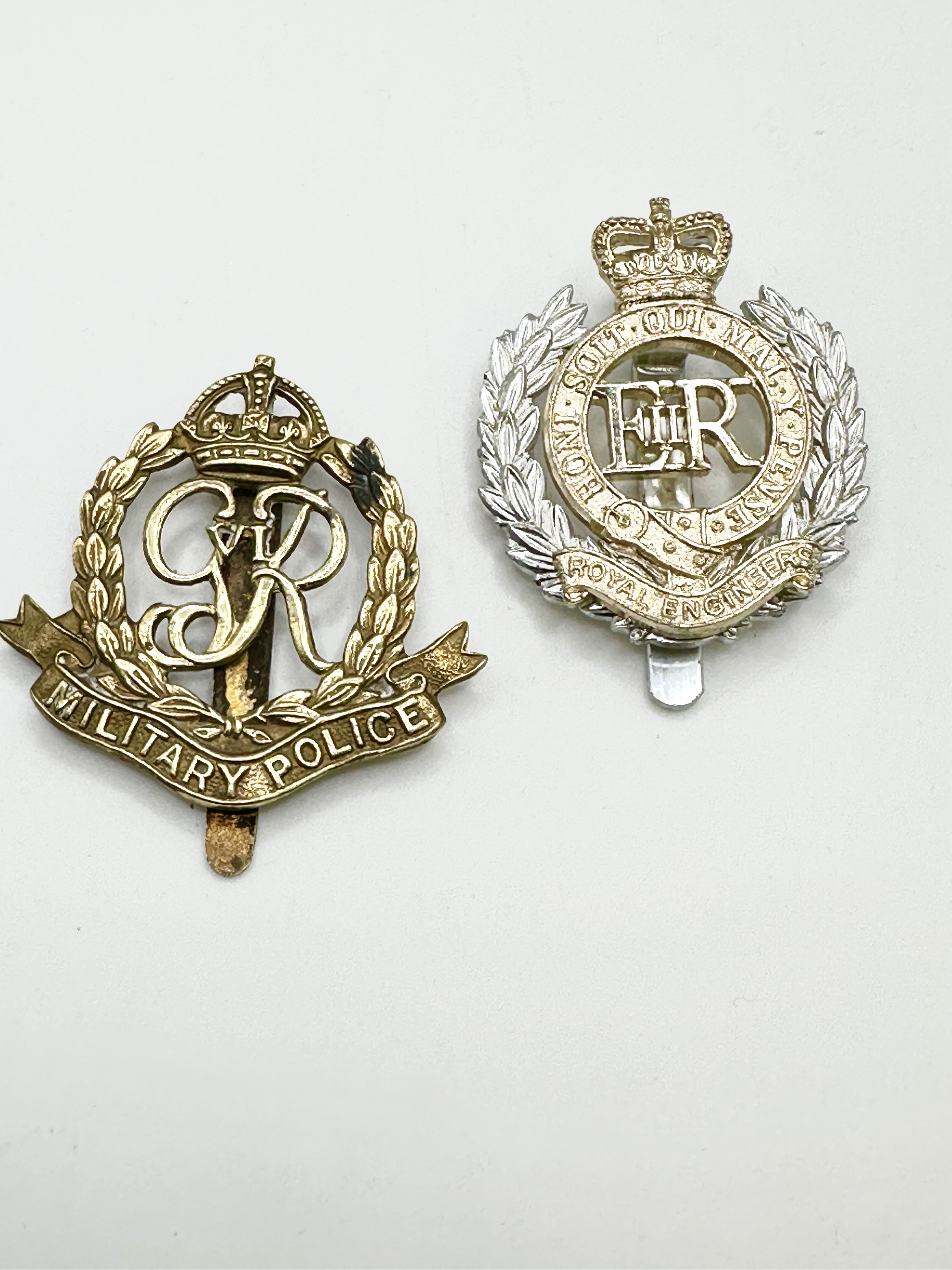 Two British military cap badges. The first is a Royal Engineers beret cap badge of bi-metal construction, featuring the EIIR cypher within a garter bearing the motto HONI SOIT QUI MAL Y PENSE, surrounded by a wreath and surmounted by a crown, with a scroll at the base inscribed ROYAL ENGINEERS. The second is a George VI era Military Police badge, constructed from a gold-toned metal, featuring the GVIR royal cypher within a laurel wreath, surmounted by a crown, and resting above a scroll inscribed MILITARY POLICE. Both items are fitted with vertical sliders to the reverse for attachment.