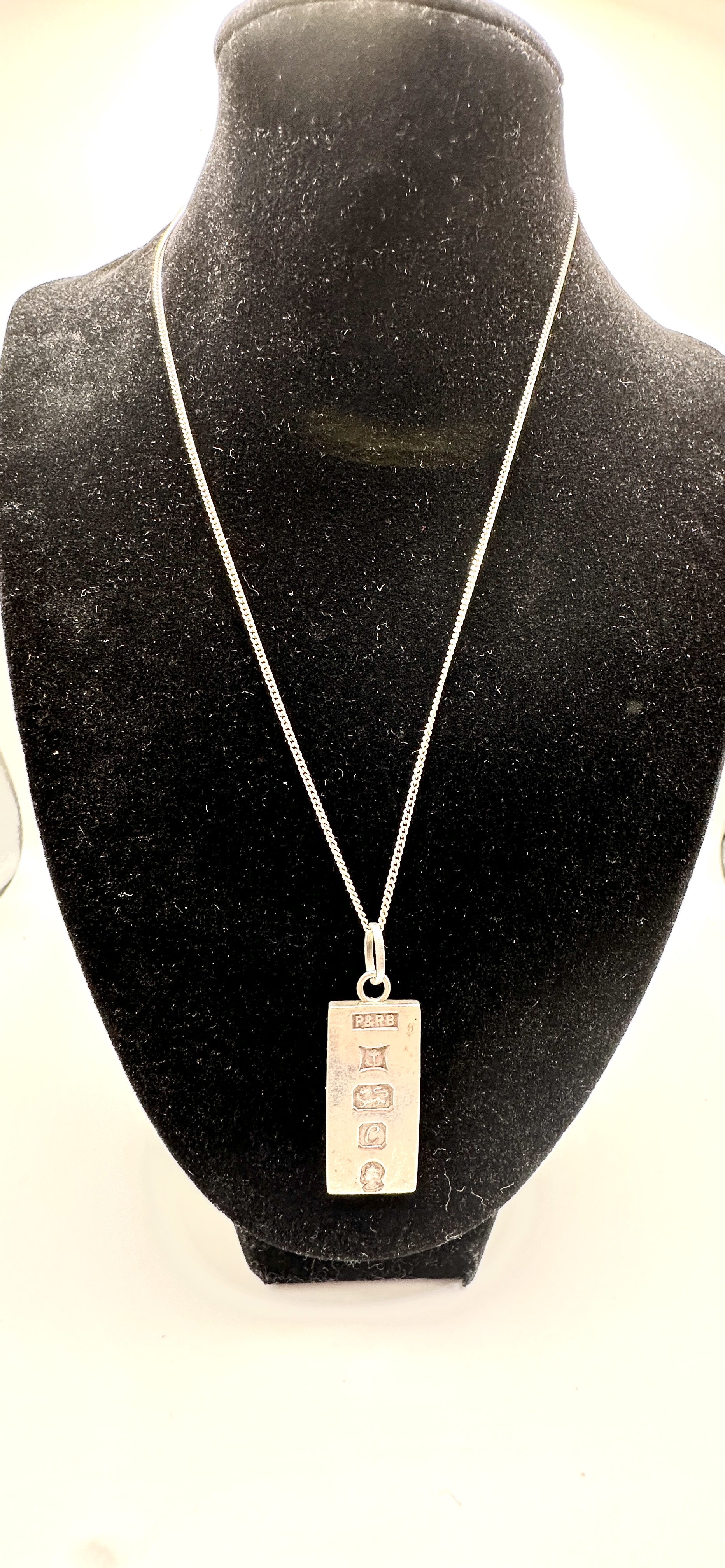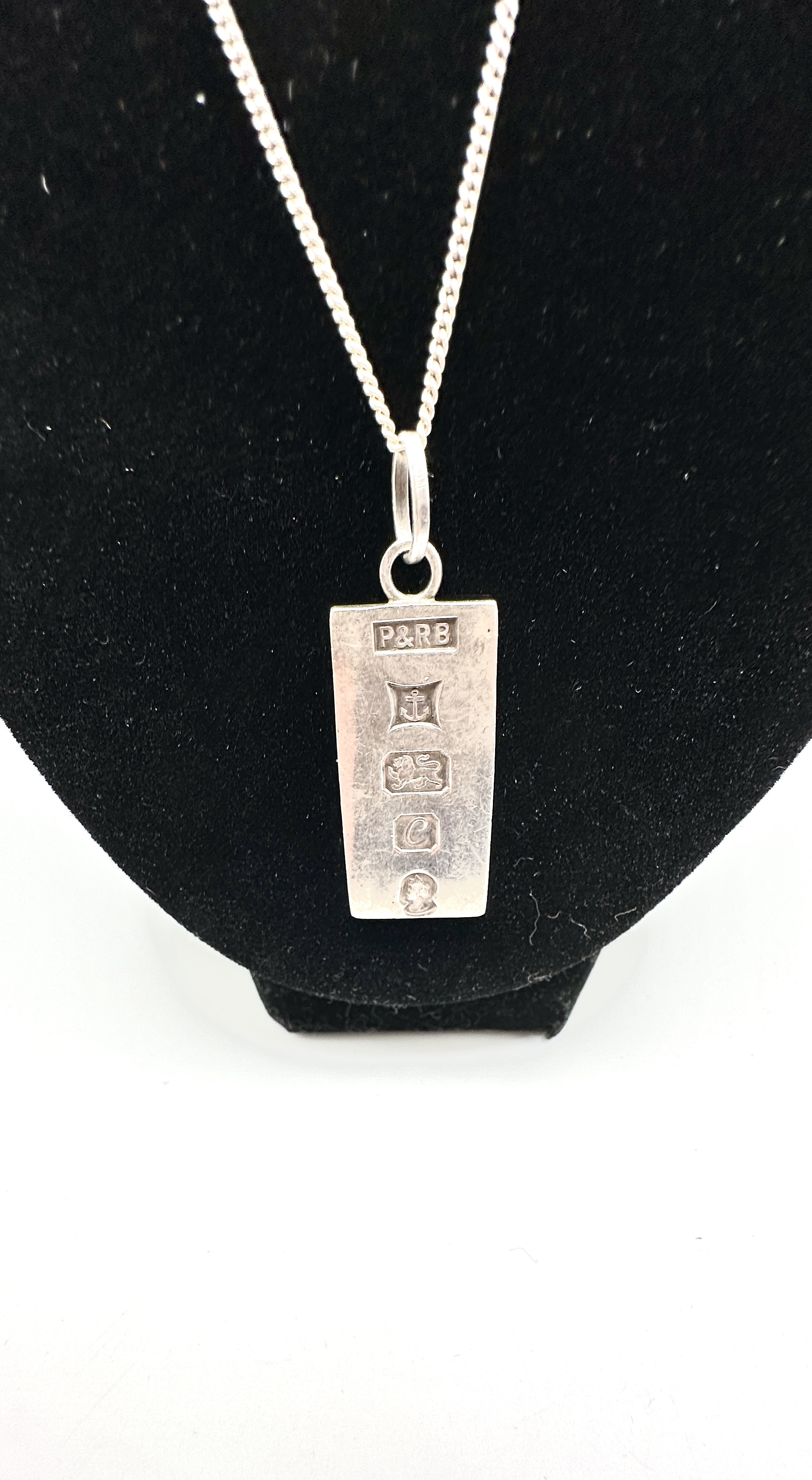 A sterling silver ingot pendant necklace featuring a rectangular ingot suspended from a fine curb link chain. The pendant is struck with a full set of British hallmarks to the front face, including the maker mark P&RB, the anchor for the Birmingham assay office, the lion passant for sterling silver, and the date letter c for 1977. Additionally, the piece bears the commemorative profile mark for the Silver Jubilee of Queen Elizabeth II.