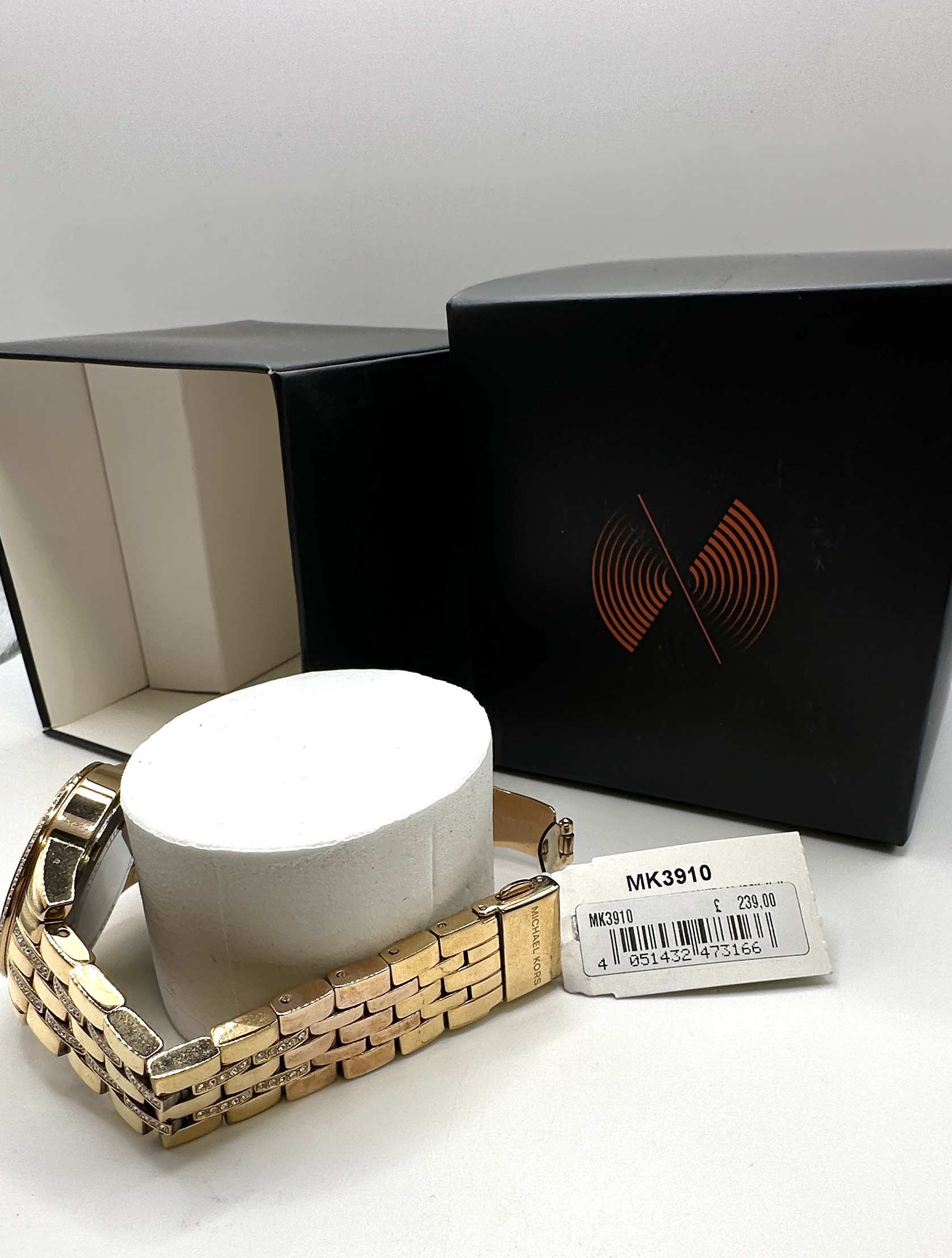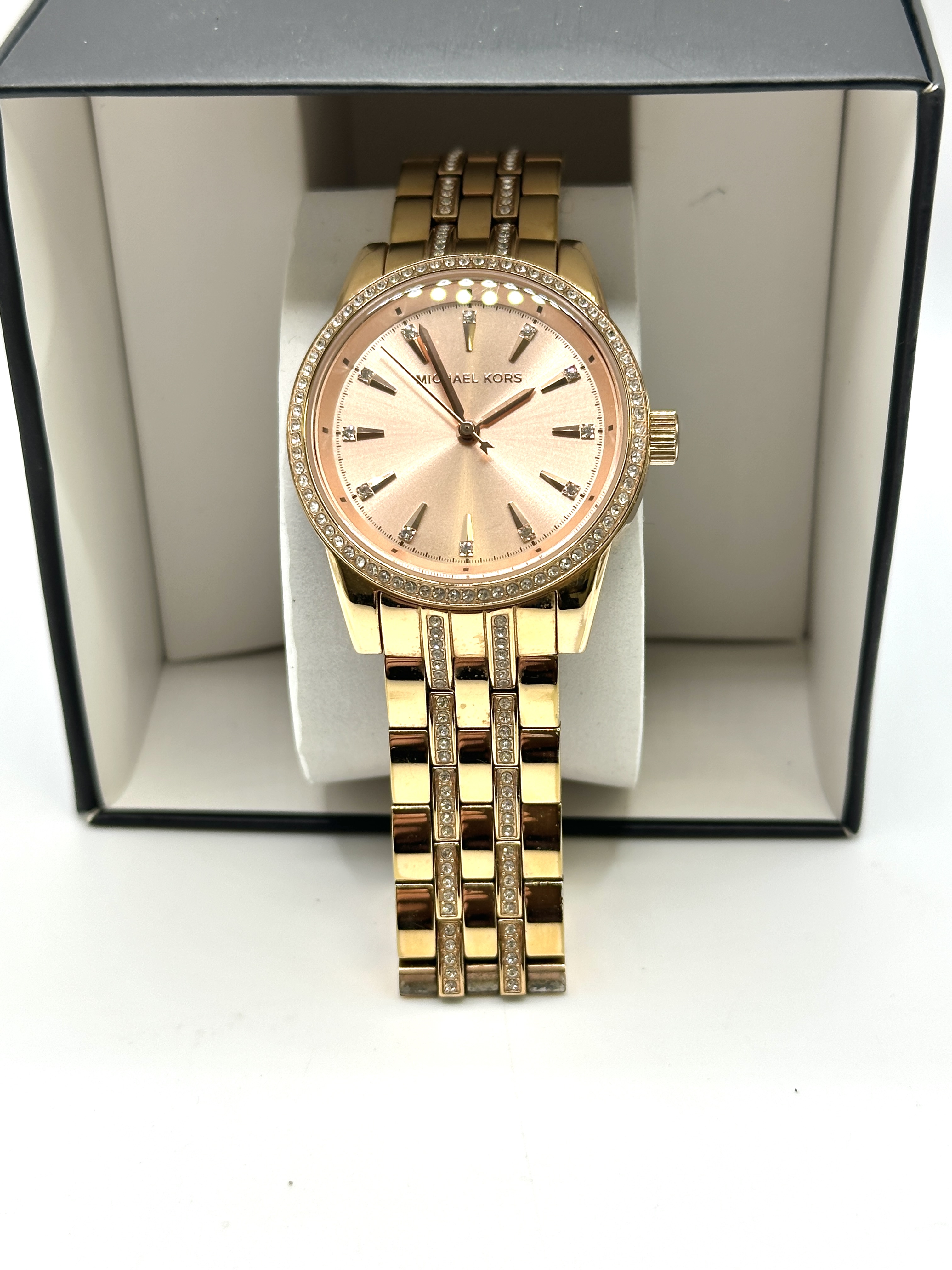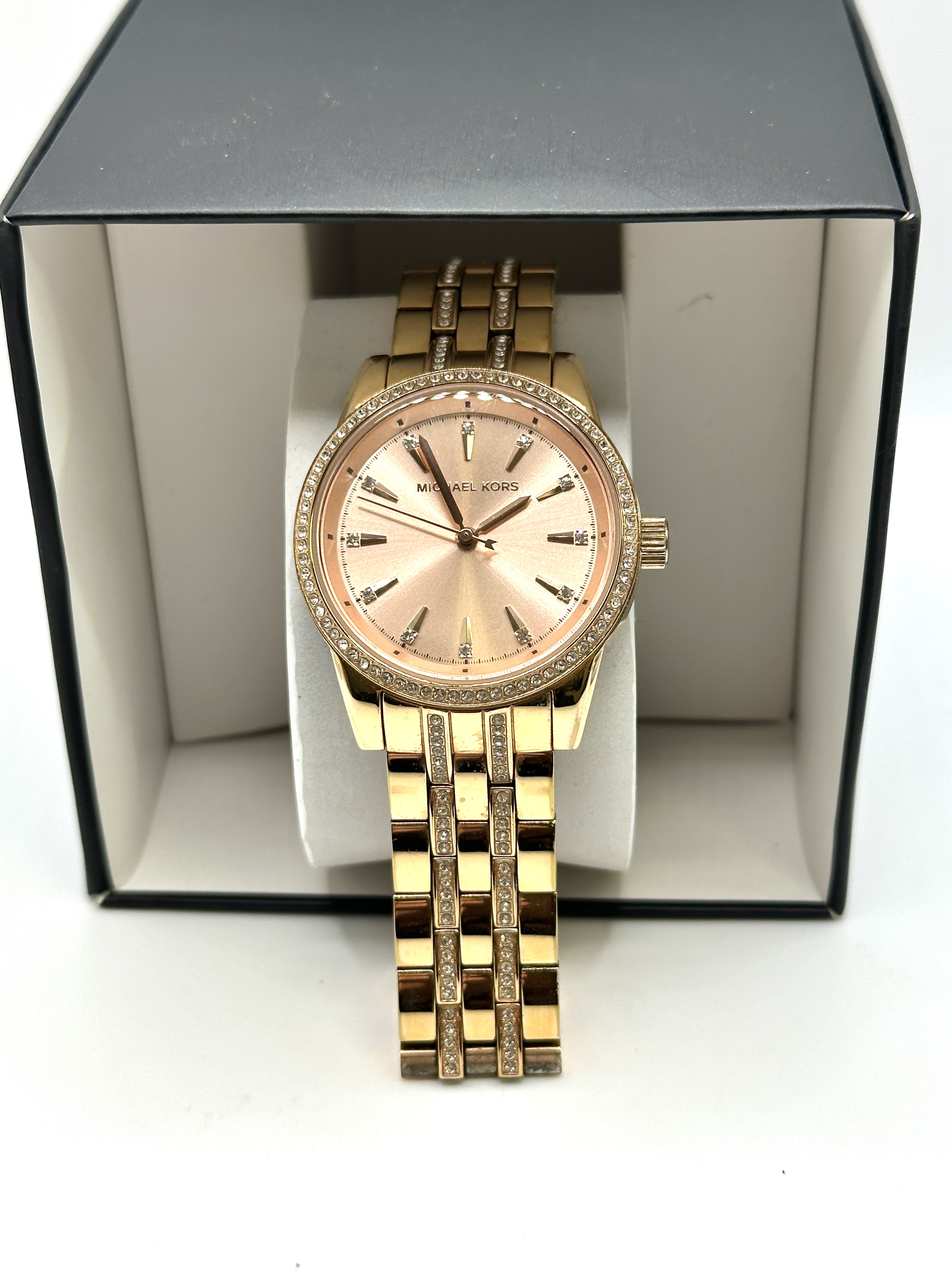A Michael Kors Mini Ritz rose gold-tone ladies wristwatch, model MK3910. The timepiece features a rose gold-tone sunray dial with stick and crystal-set hour markers and a three-hand movement. The round case is accented by a crystal-encrusted bezel and is attached to a matching multi-link bracelet with crystal-set centre rows and a signed fold-over clasp. The watch is presented in its original black branded box with a white display pillow and an attached retail tag indicating the model number.