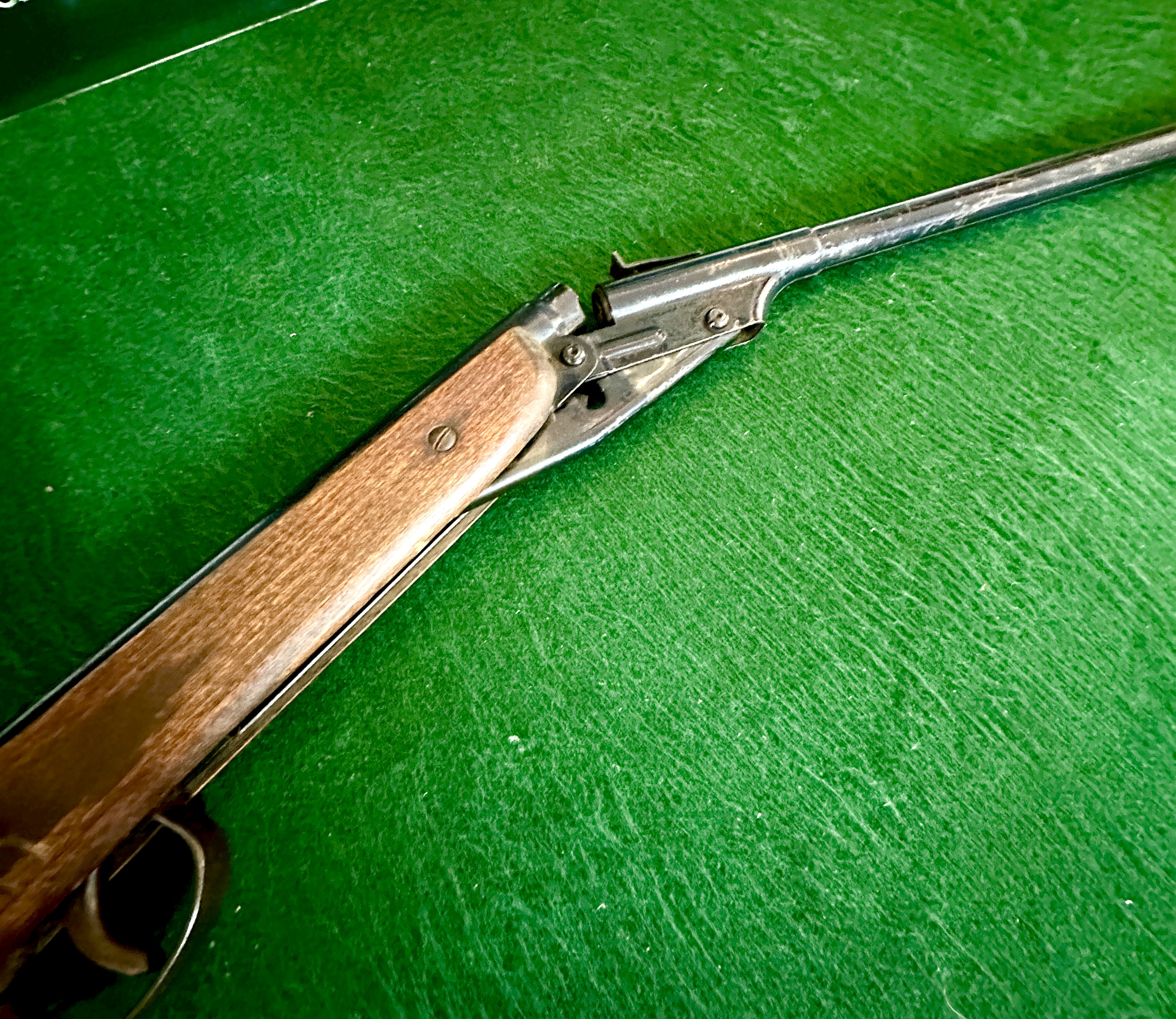A Diana Model 16 air rifle featuring a break-barrel cocking and loading mechanism. The piece is constructed with a hardwood stock and a metal barrel and action. The design incorporates a curved metal trigger guard and integrated sights. No manufacturer markings are visible on the exterior surfaces. The rifle is depicted with the action in the open position.