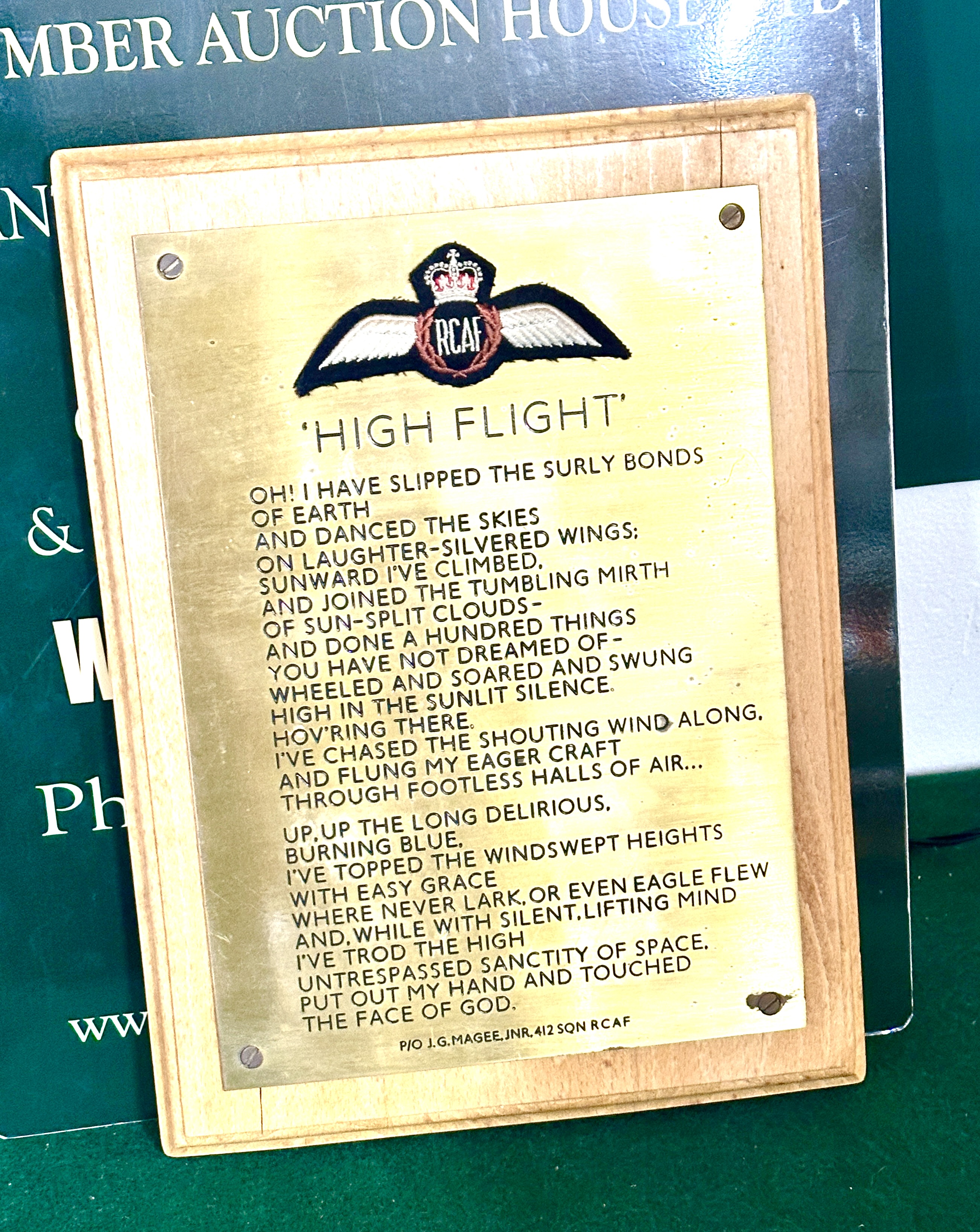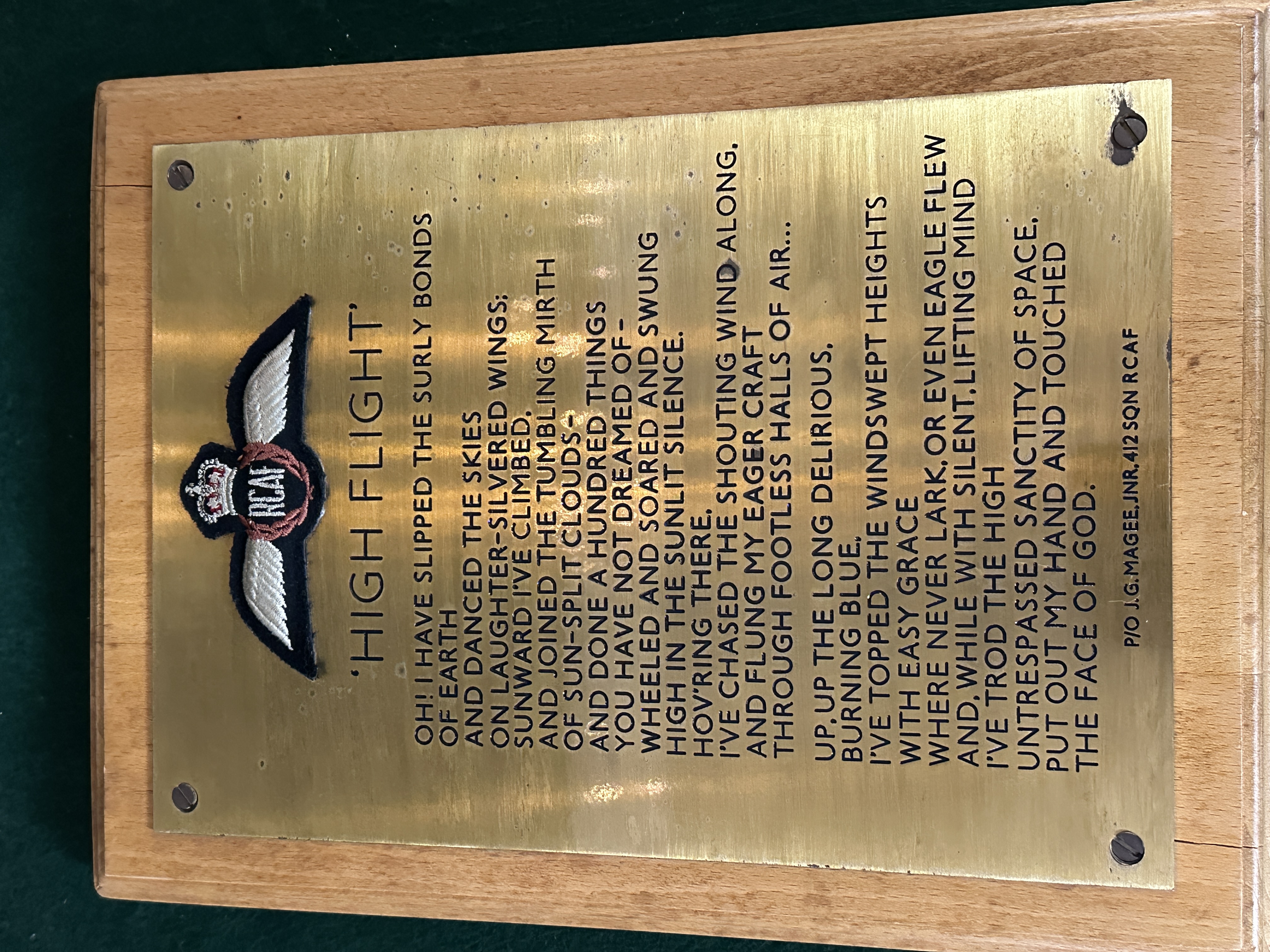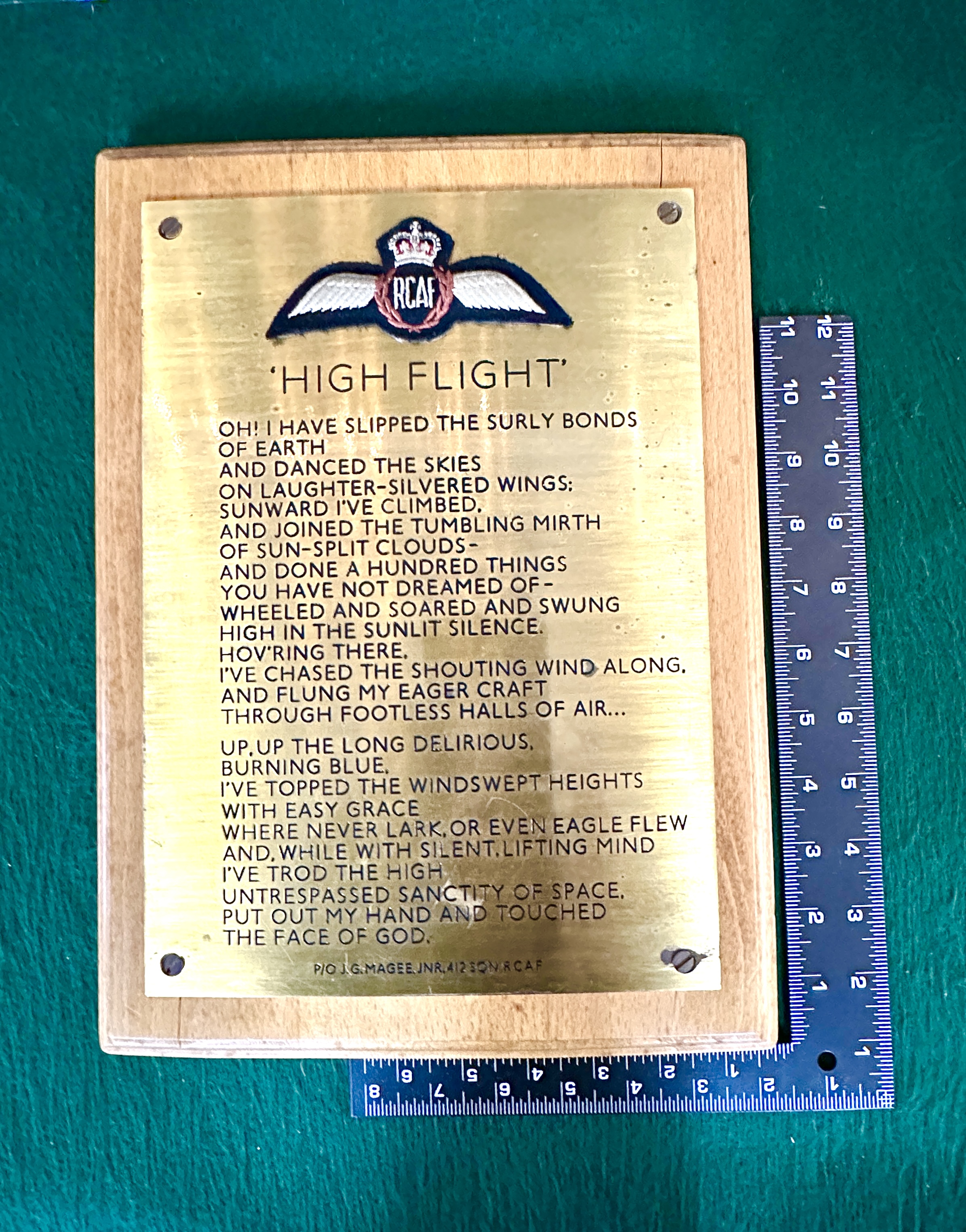 A commemorative wall plaque featuring the poem High Flight by Pilot Officer John Gillespie Magee Jr. The item comprises an engraved brass-toned metal plate mounted onto a light-coloured wooden base. The plate is inscribed with the full text of the poem and is marked P/O J.G. MAGEE, JNR, 412 SQN RCAF at the lower right. An embroidered Royal Canadian Air Force pilot wing patch is affixed to the upper portion of the plate, featuring a central crown and the initials RCAF. The metal plate is secured to the wooden mount by four flat-head screws.