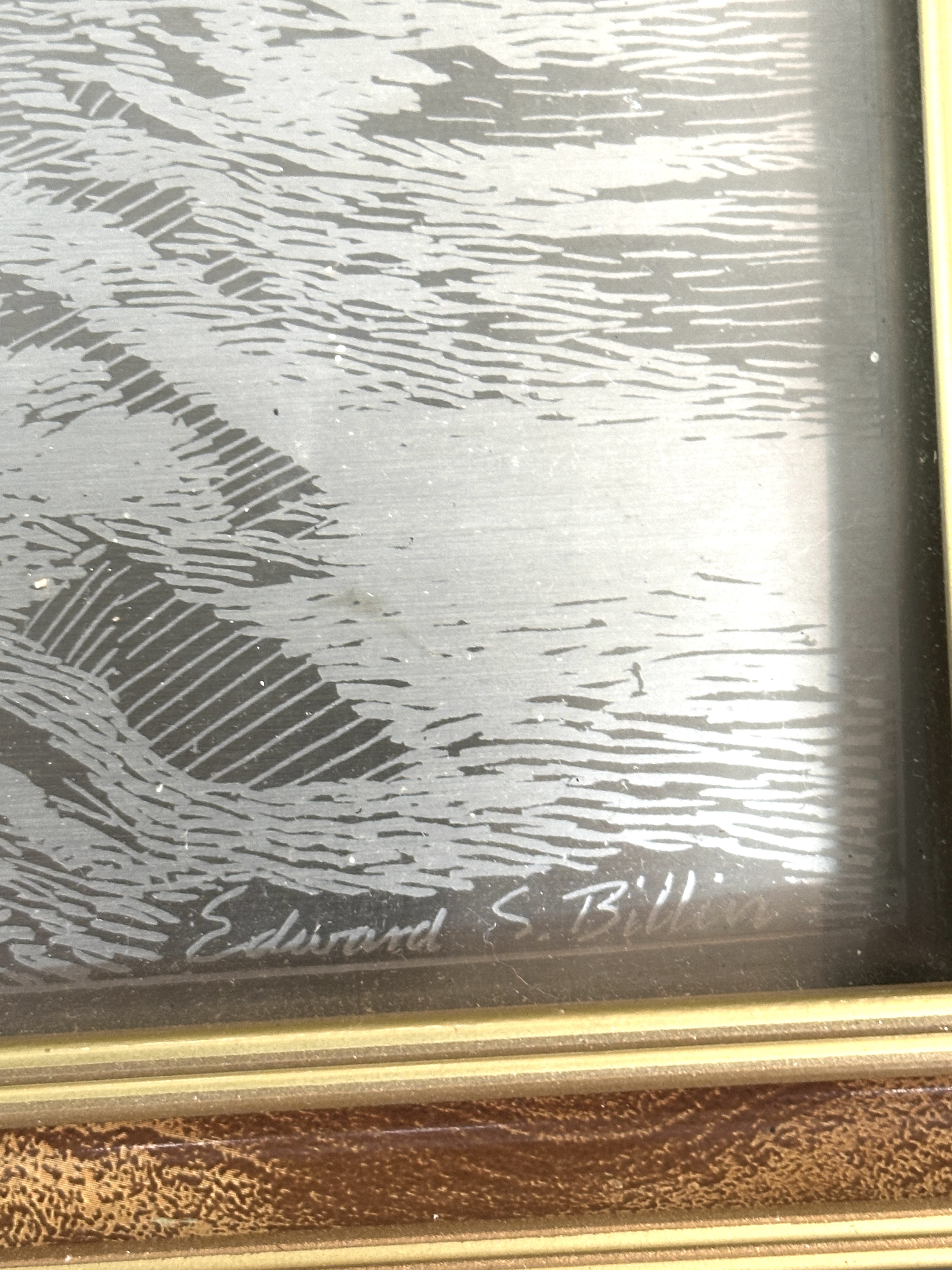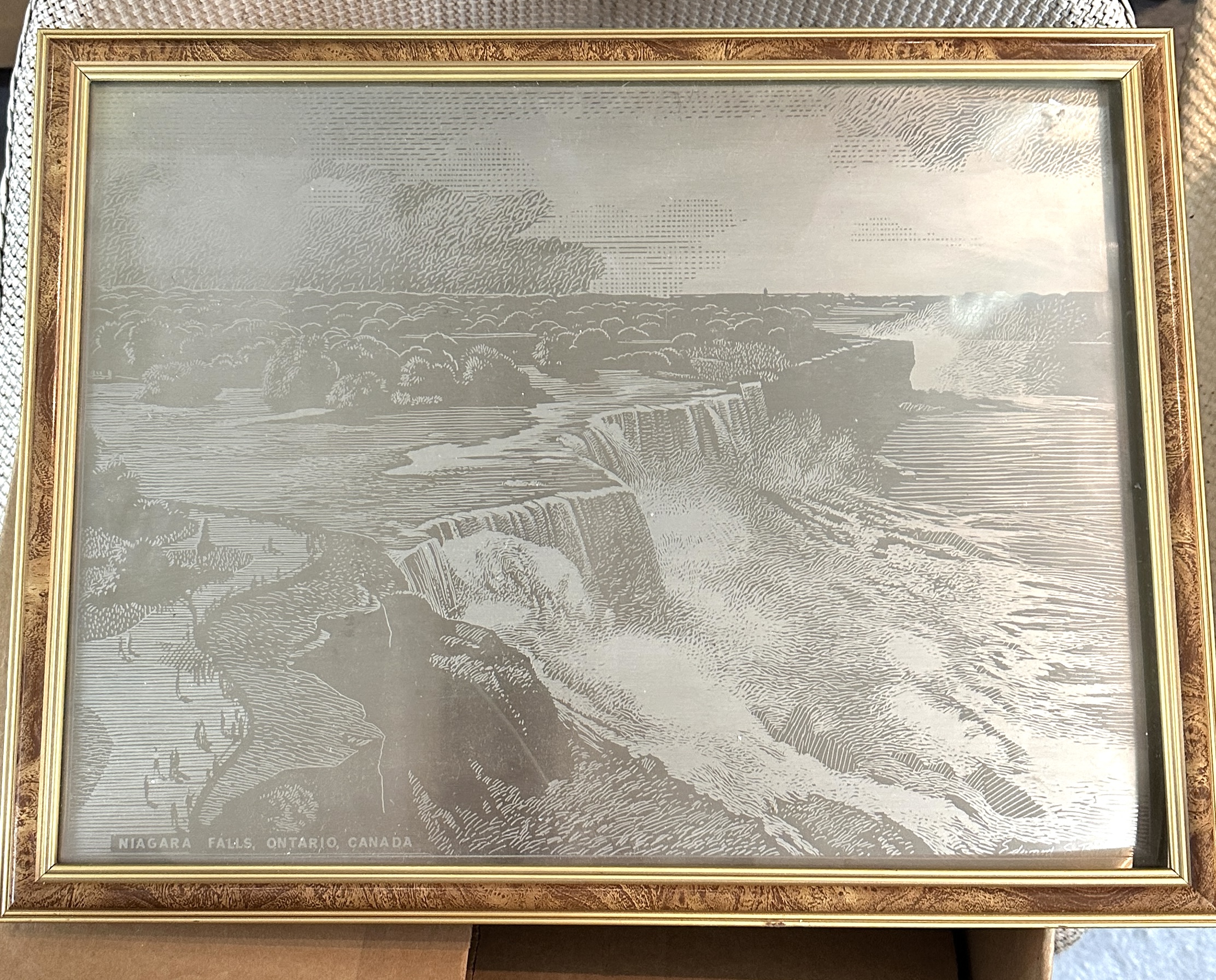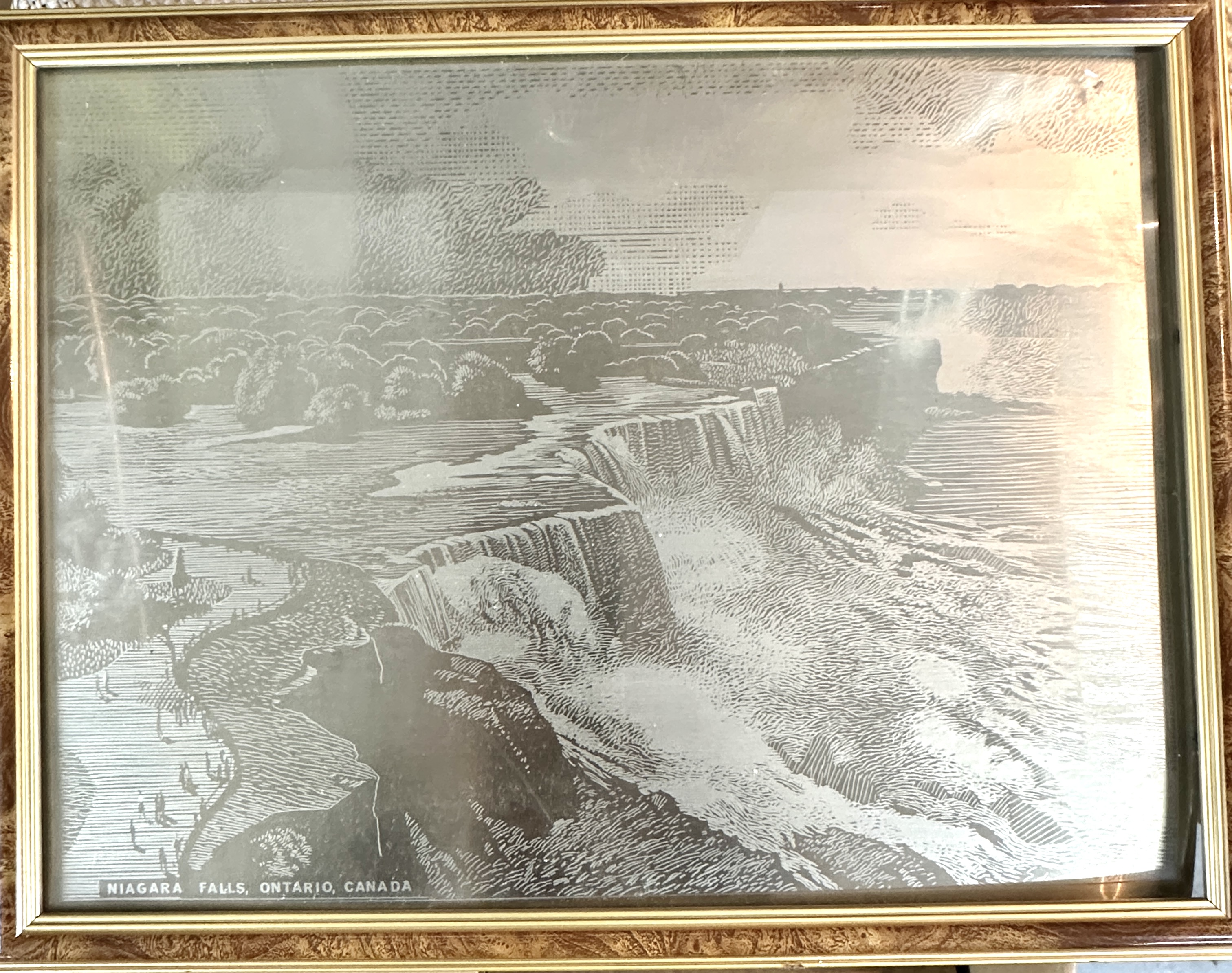 An etched metal artwork depicting a panoramic view of Niagara Falls, Ontario, Canada. The piece features an intricate, monochromatic etched design on a polished silver-toned metal plate. The artwork is signed Edward S. Billin in the lower right corner and titled NIAGARA FALLS, ONTARIO, CANADA at the lower left. The plate is housed in a vintage-style wood frame with a decorative marbled brown finish and a gilt inner border, protected under glass. The construction consists of the etched plate secured within the frame with a dark backing board and metal glazing clips.