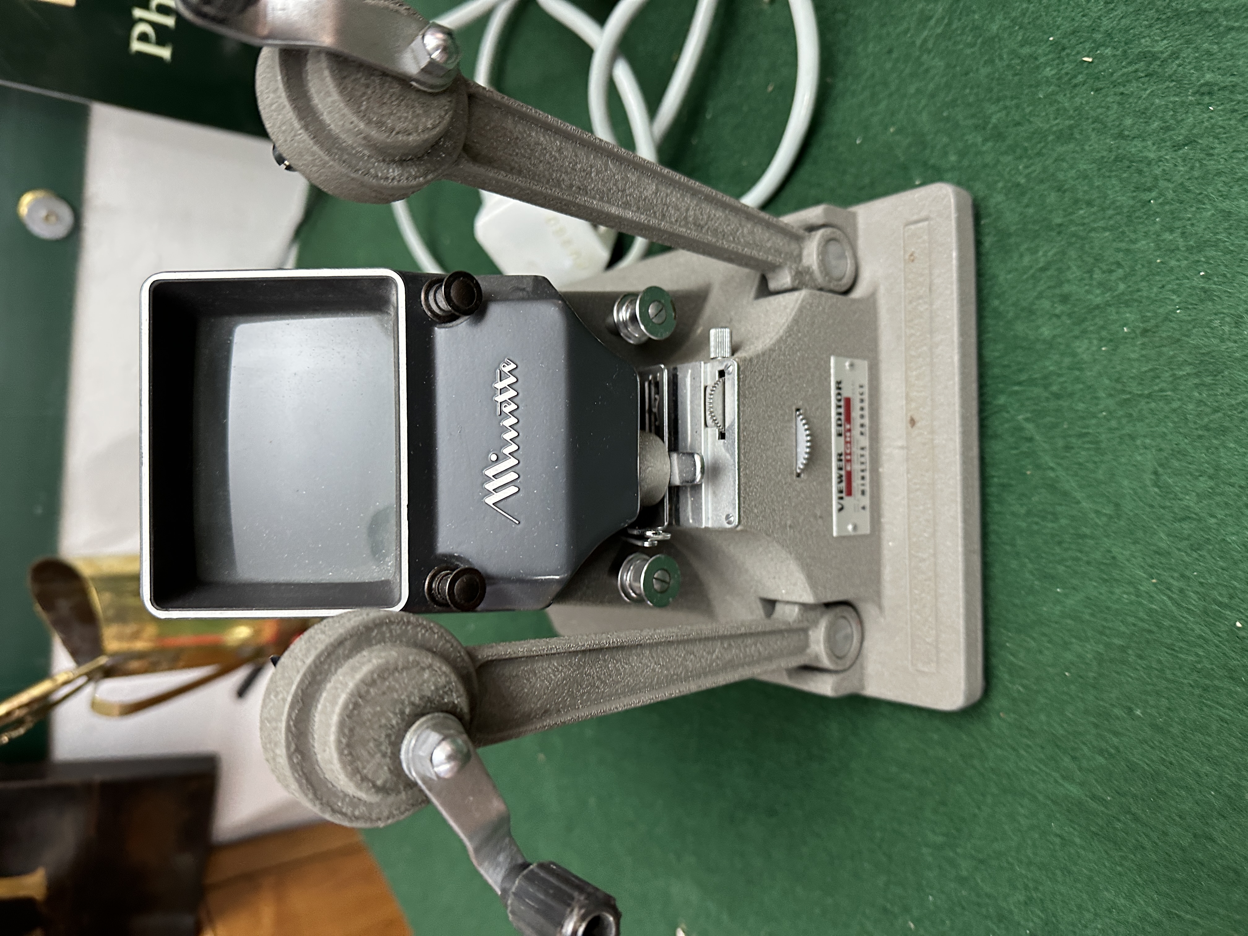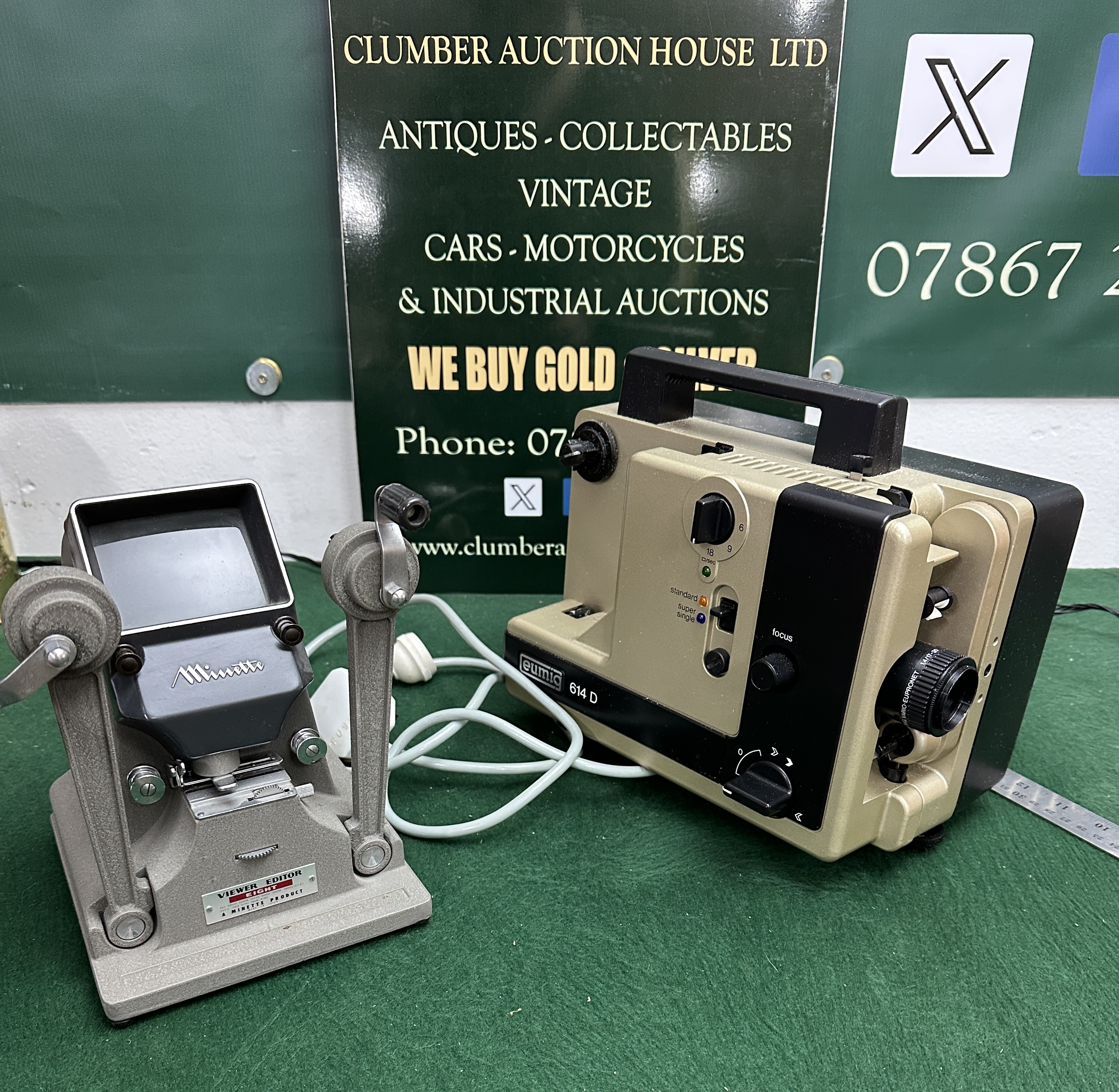 A Eumig 614 D dual-format 8mm cine film projector and a Minette Viewer Editor Eight. The Eumig projector, manufactured in Austria, is housed in a beige and black casing with an integrated carrying handle and features a Vario-Eupronet lens. Control dials allow for focus adjustment and variable projection speeds of 6, 9, and 18 frames per second, with a dedicated toggle for standard, super, and single film types. The unit includes its associated power cabling. The Minette Viewer Editor Eight is constructed with a hammer-tone grey metal body and features manual film winding cranks and an integrated viewing screen. The base is marked with a manufacturer label stating Viewer Editor Eight, A Minette Product.