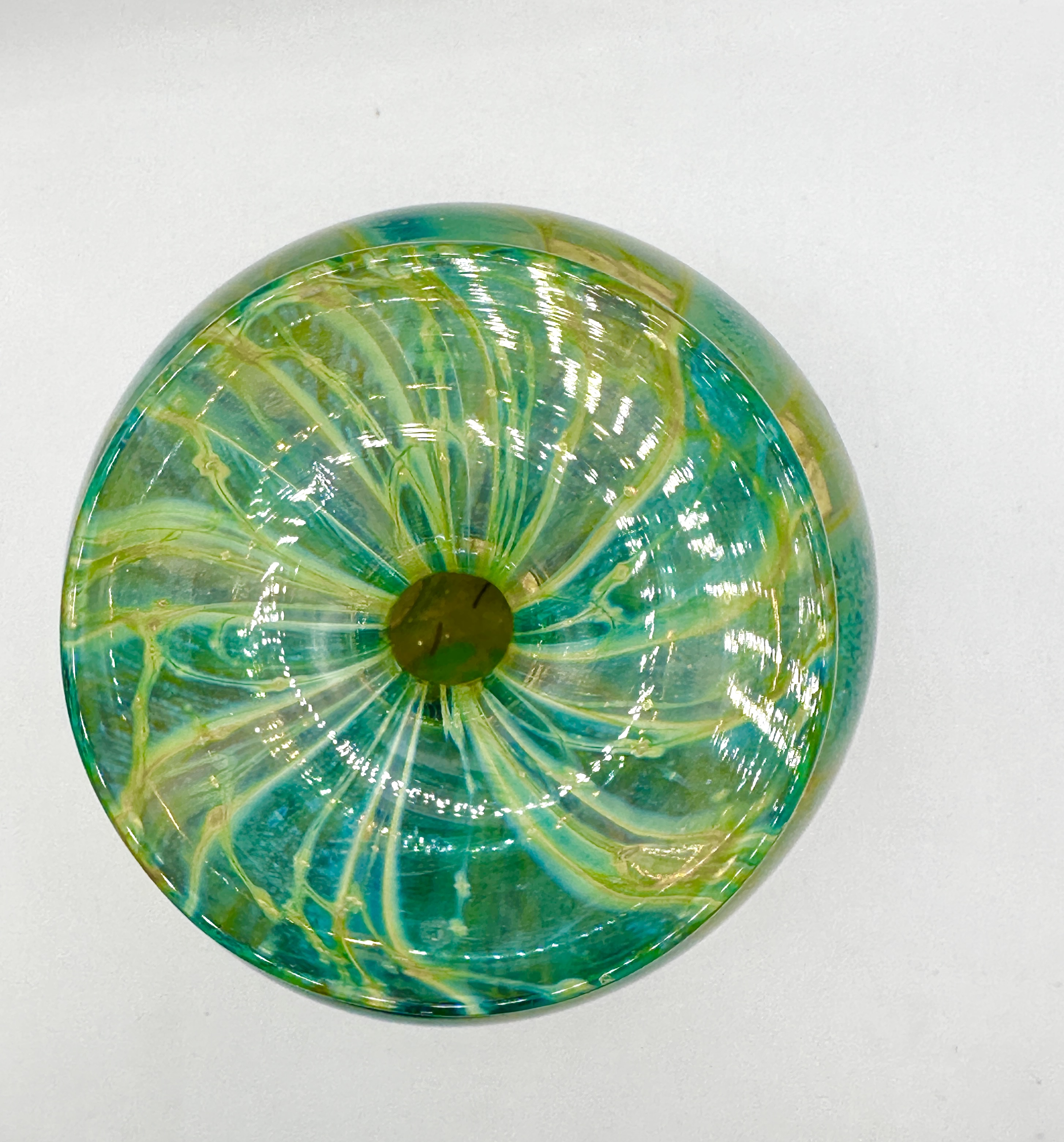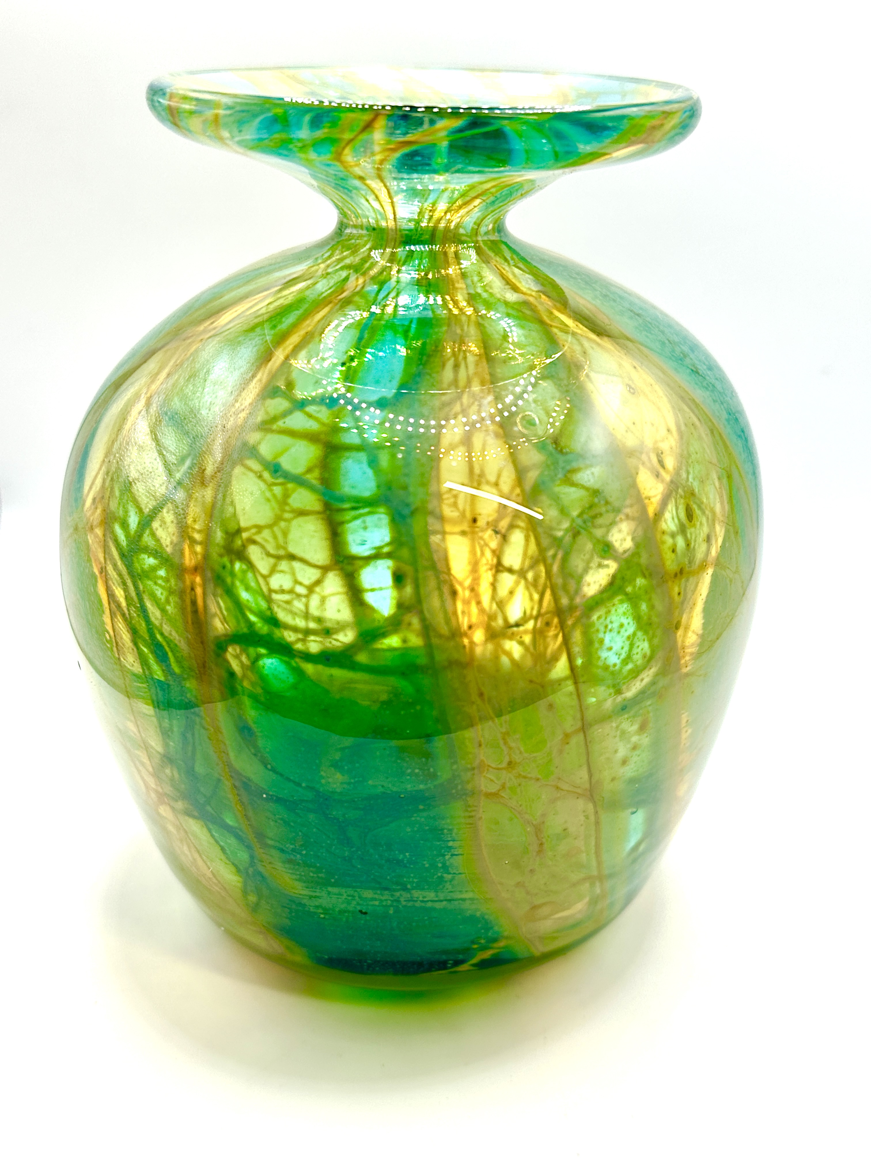 A hand-blown art glass vase by Mdina Glass, Malta. The vessel features a bulbous body tapering to a narrow neck and a broad, flat rim. The glass displays a palette of emerald green, teal, and golden yellow colours, integrated into an organic, swirled design with intricate veining reminiscent of marble or natural mineral formations. The piece has a high-gloss finish. No visible markings or signatures are present.