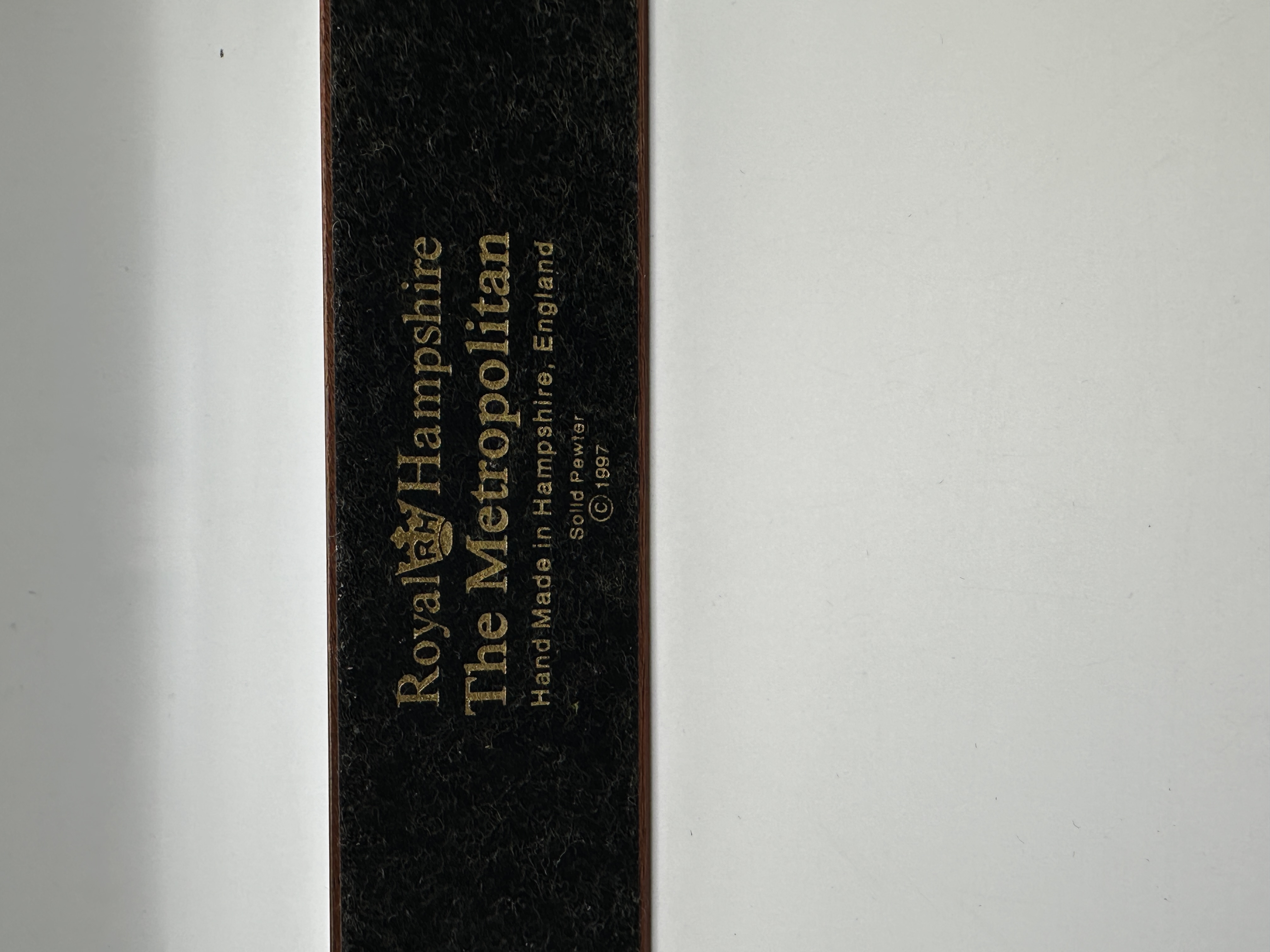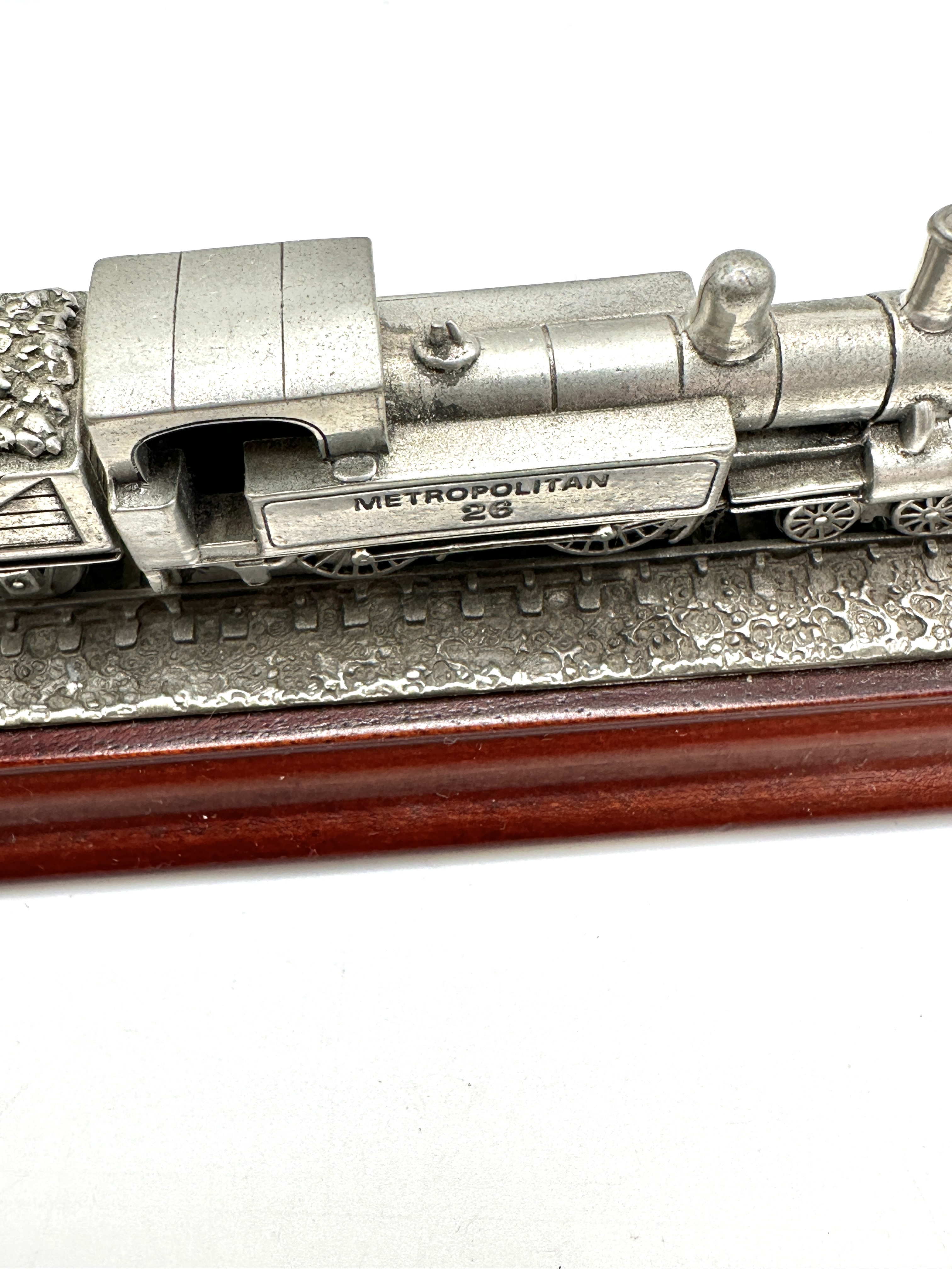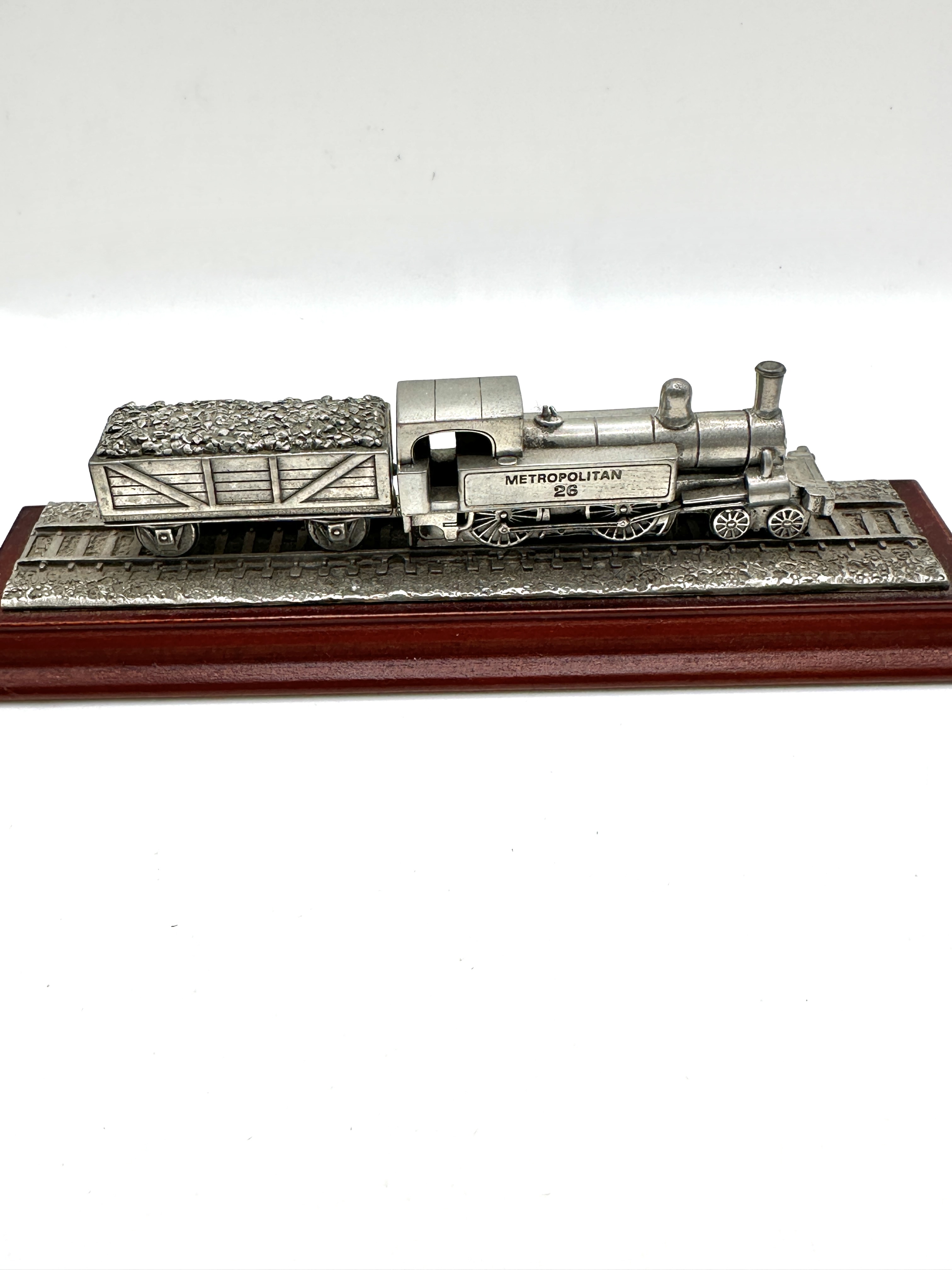 A solid pewter scale model depicting the Metropolitan 26 steam locomotive and accompanying coal tender, produced by Royal Hampshire. The locomotive features embossed lettering reading METROPOLITAN 26 on the side of the water tank. Both the engine and tender are mounted upon a section of pewter track, which is set into a rectangular wooden base with a reddish-brown finish. The underside of the base is fitted with a black felt pad bearing gold-coloured inscriptions for Royal Hampshire, The Metropolitan, and Hand Made in Hampshire, England, alongside the designation Solid Pewter and a copyright date of 1997.