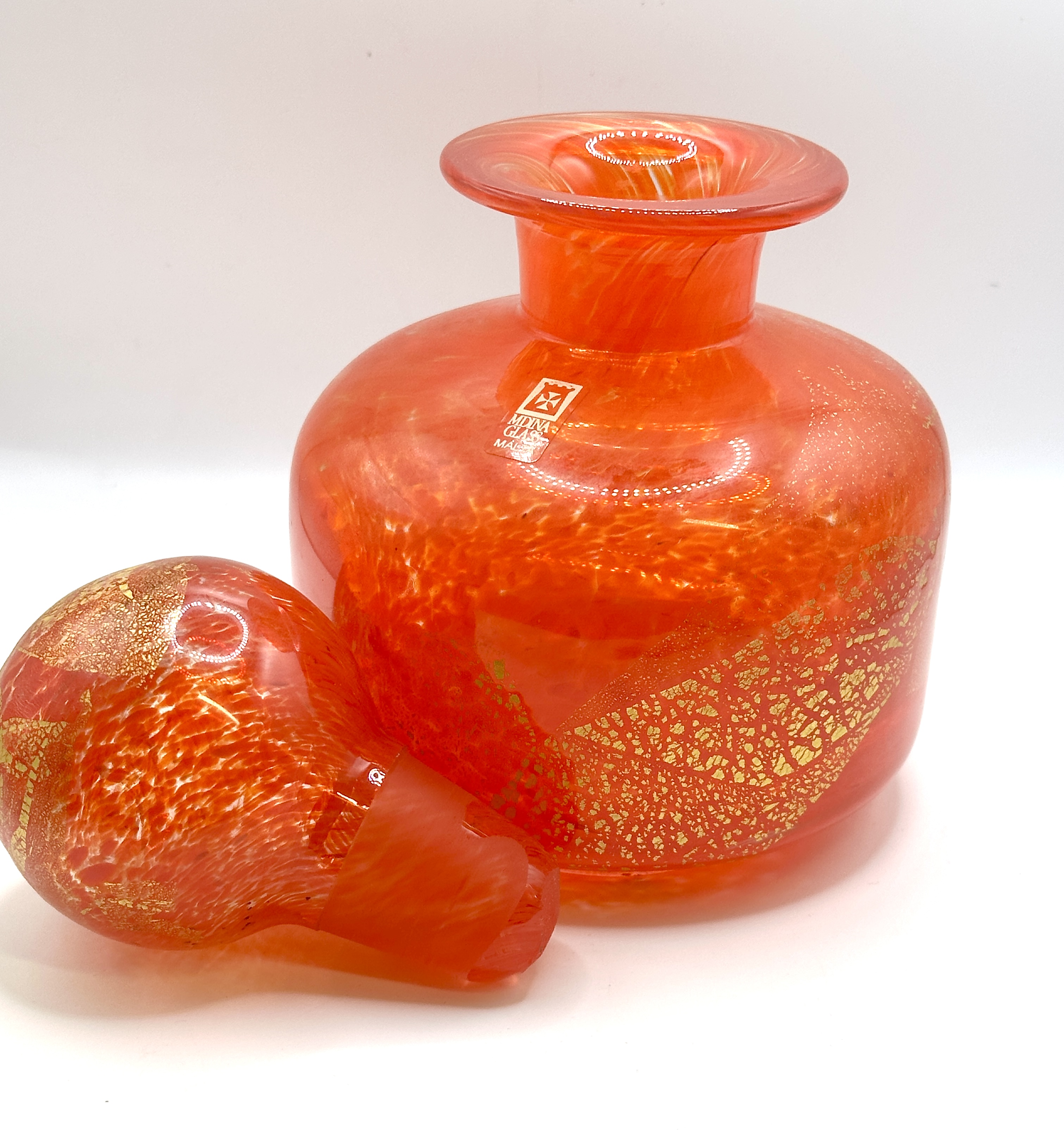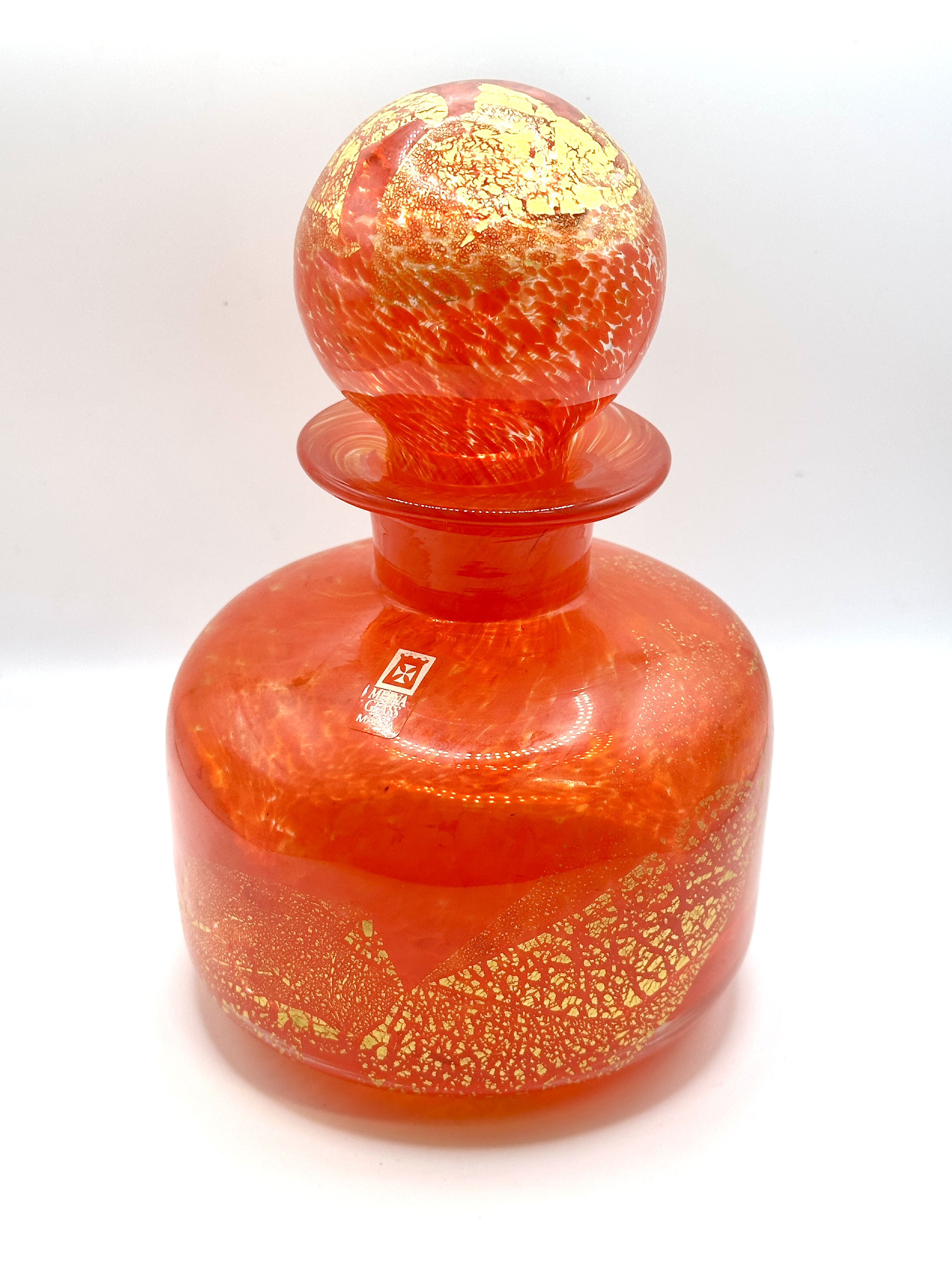 A hand-blown art glass scent bottle produced by Mdina Glass, Malta. The vessel is crafted in an orange-red colourway featuring internal gold leaf inclusions throughout the body and stopper. The piece is designed with a squat, cylindrical body, a short neck, and a wide, flat rim. It is accompanied by a matching spherical stopper with a ground-glass neck to ensure a secure fit. An original silver foil label is adhered to the shoulder, printed with the company logo and the text MDINA GLASS MALTA.