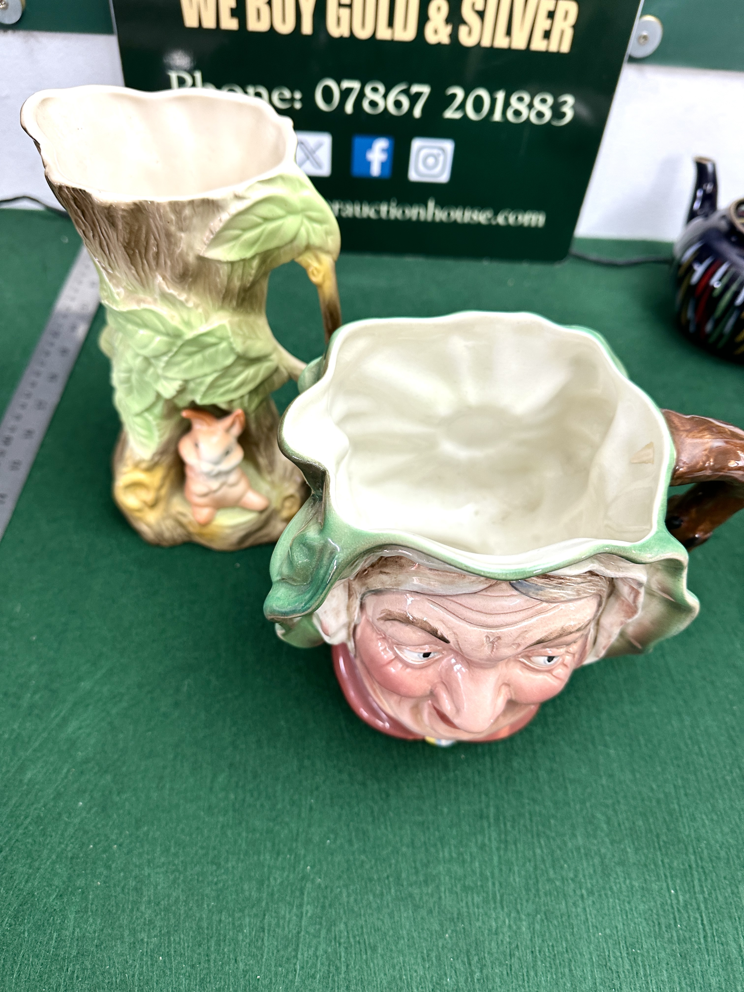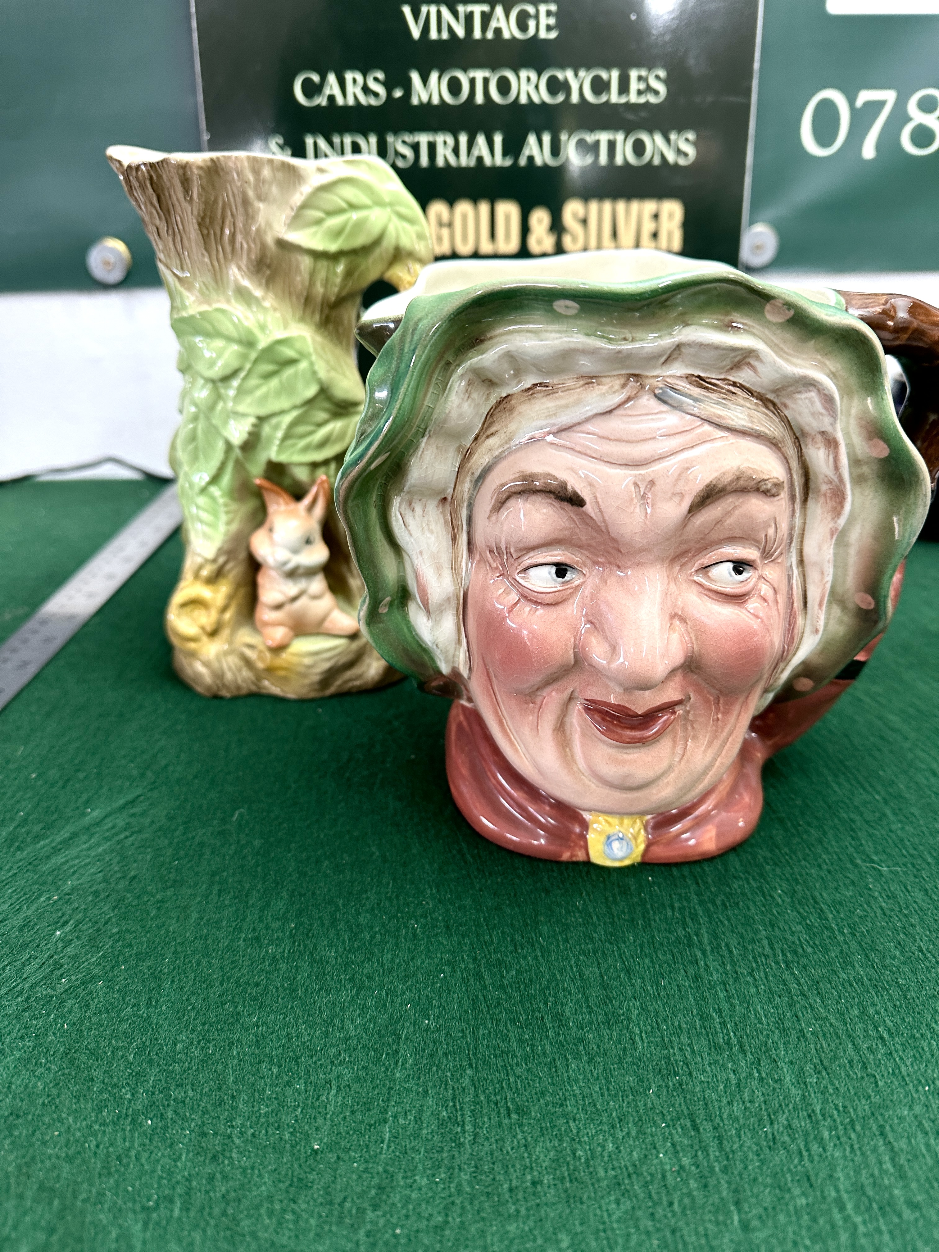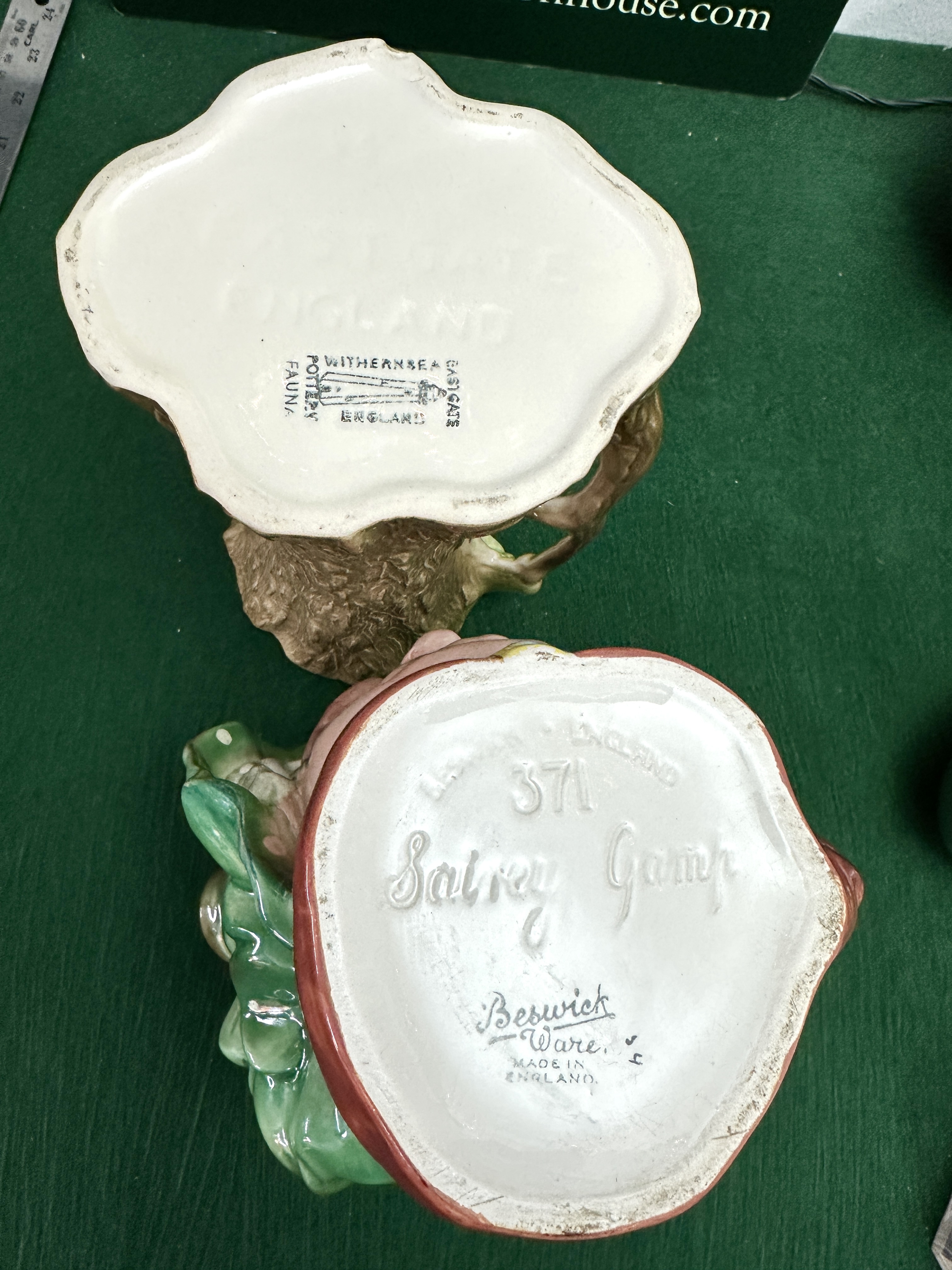 A Beswick Ware Sairey Gamp character jug and a Withernsea Pottery Fauna series vessel. The Beswick jug, model number 371, depicts the literary character wearing a green-frilled bonnet with pale spotting and a red shawl. The underside features impressed marks for the model number 371, the name Sairey Gamp, and MADE IN ENGLAND, alongside a stamped Beswick Ware Made in England manufacturer mark. The Withernsea Pottery jug is modelled as a textured tree trunk adorned with green leaves and a small seated rabbit figure at the base. The underside bears the stamped mark WITHERNSEA POTTERY EASTGATE FAUNA ENGLAND. Both items are constructed from glazed ceramic.