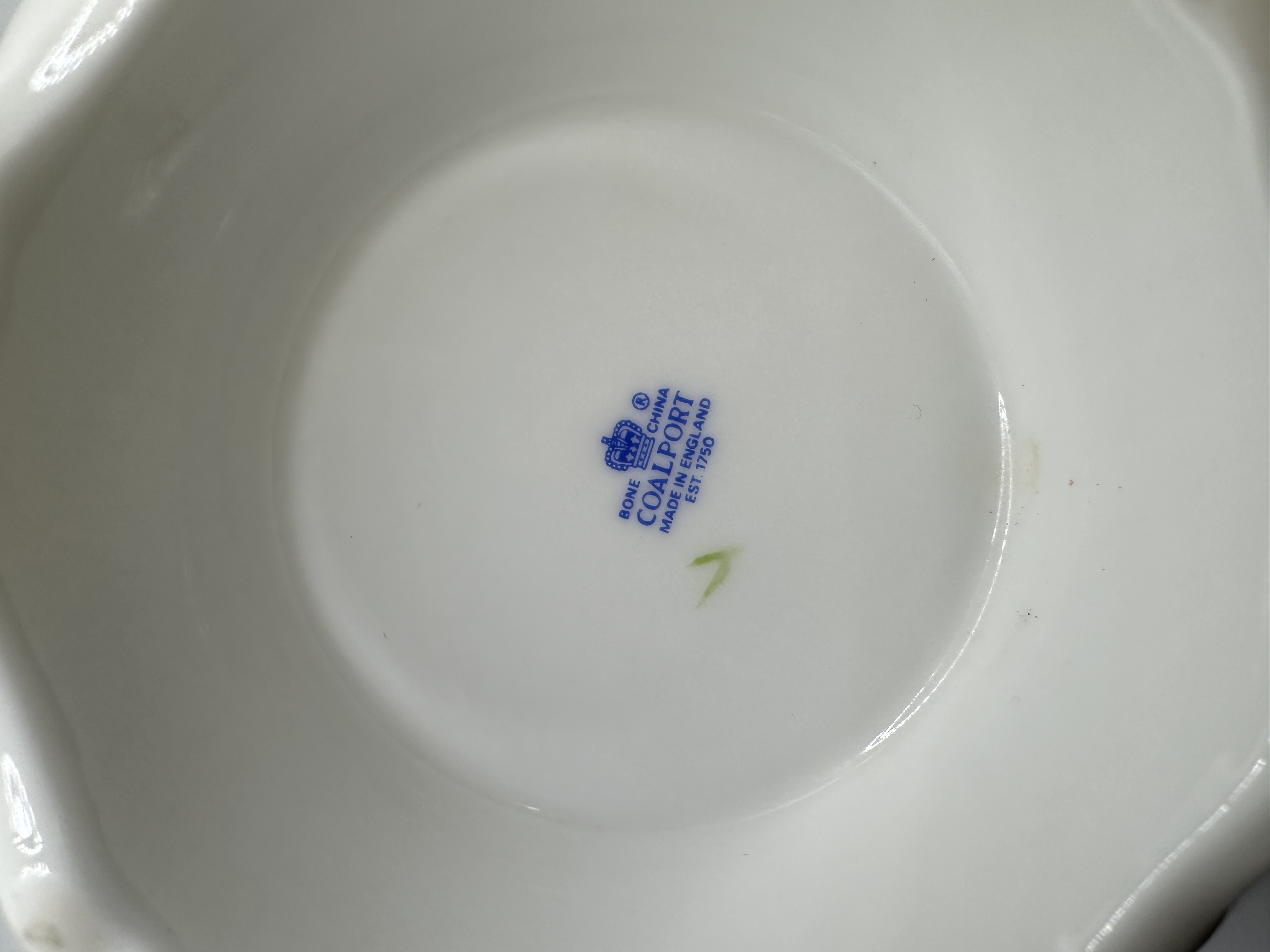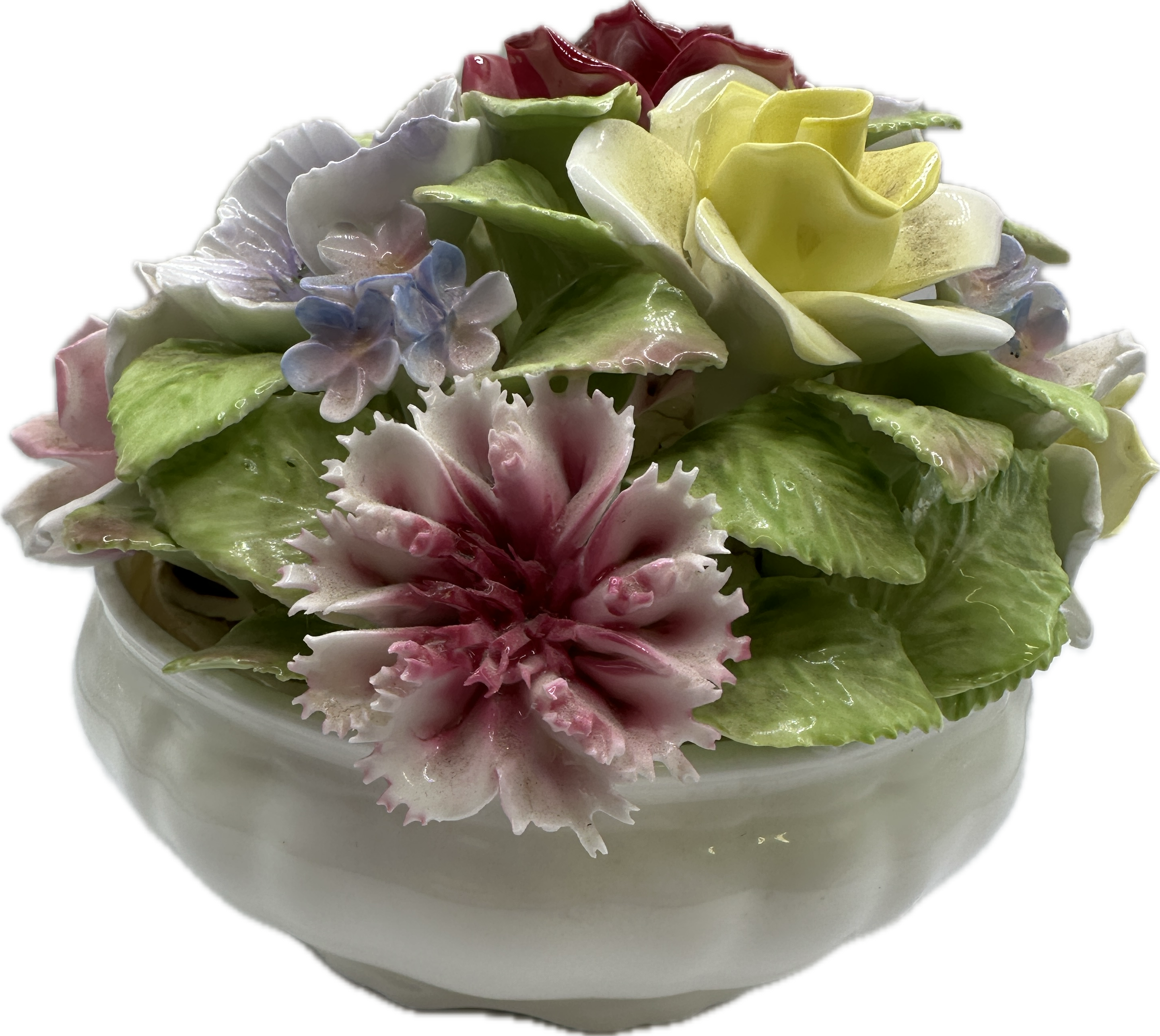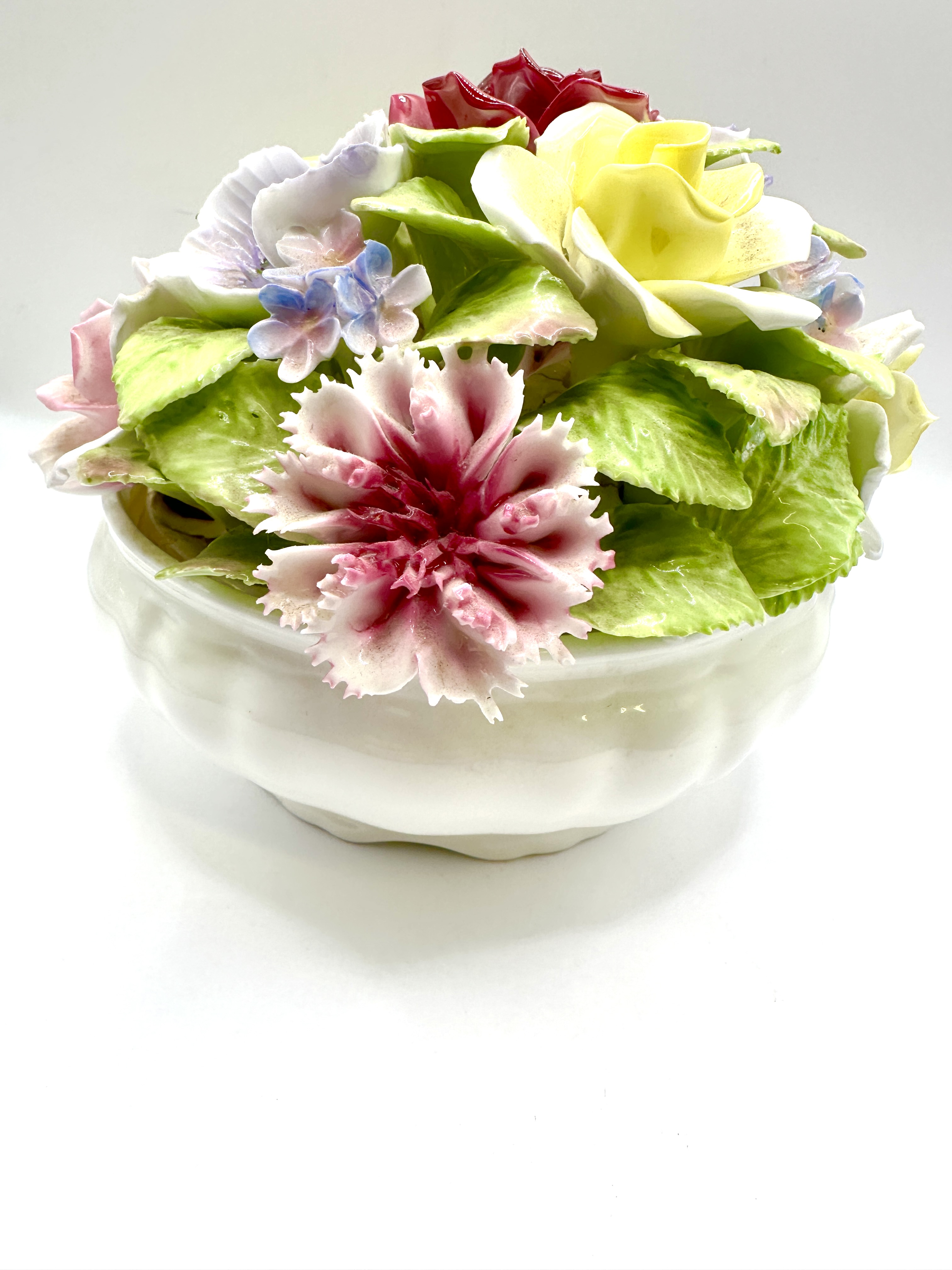 A Coalport bone china floral centrepiece featuring a hand-modelled arrangement of polychrome flowers. The composition includes roses, a carnation, and various smaller blossoms set within green foliage. The arrangement is housed in a white lobed bowl. The underside of the base is marked with a blue underglaze crown stamp for Coalport, Bone China, Made in England, and Est. 1750. A small green hand-painted mark is also present on the base.