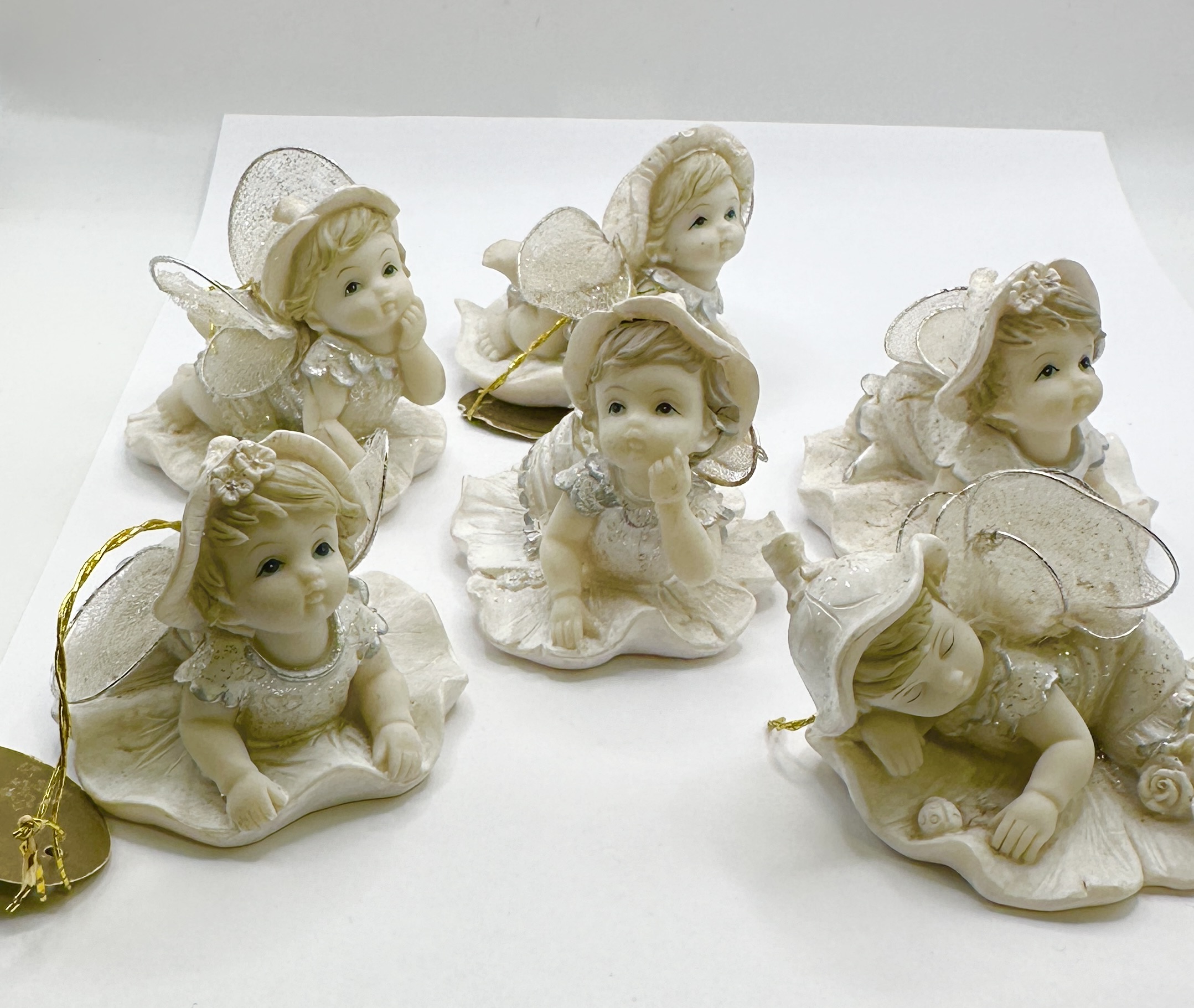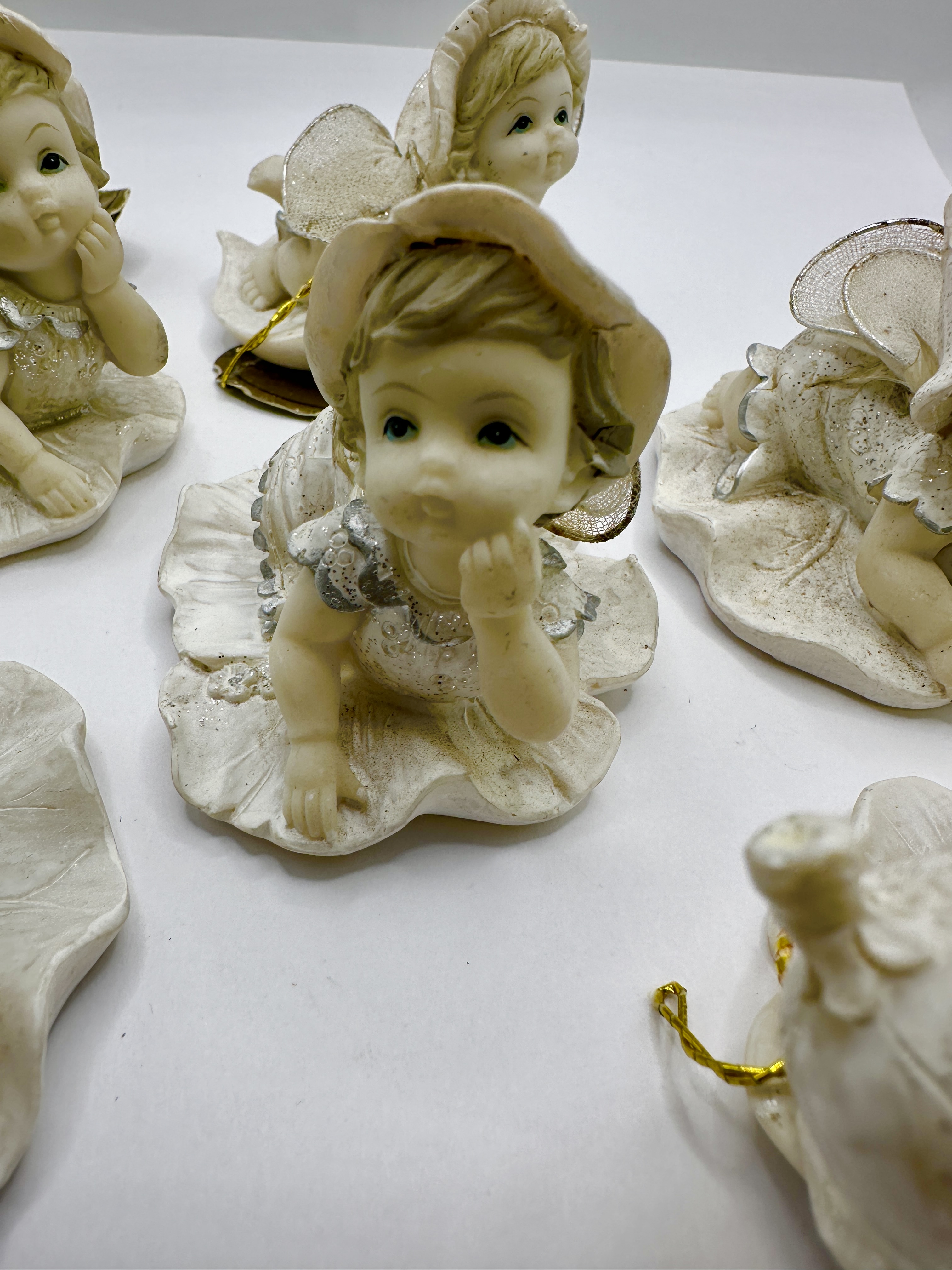 A collection of decorative baby fairy and angel figurines, crafted from resin with cold-cast details. Each figure is depicted in a whimsical pose, featuring wings accented with glitter and constructed from a fine mesh material. The figurines are dressed in ruffled clothing with silver-tone highlights and wear wide-brimmed hats or floral headpieces. The faces are finished with soft painted features. Several items in the group retain gold-toned hanging cords and circular tags, suggesting their function as hanging ornaments or decorative statues.