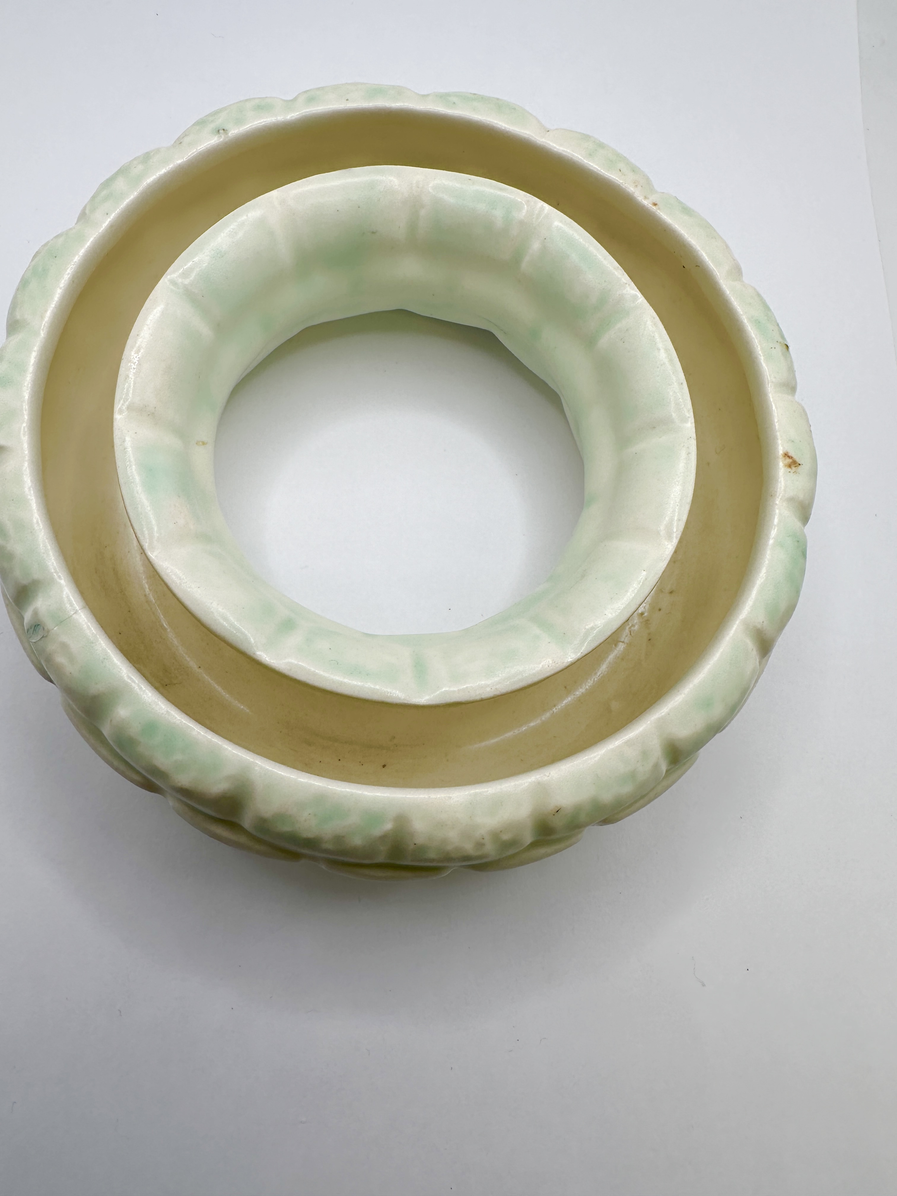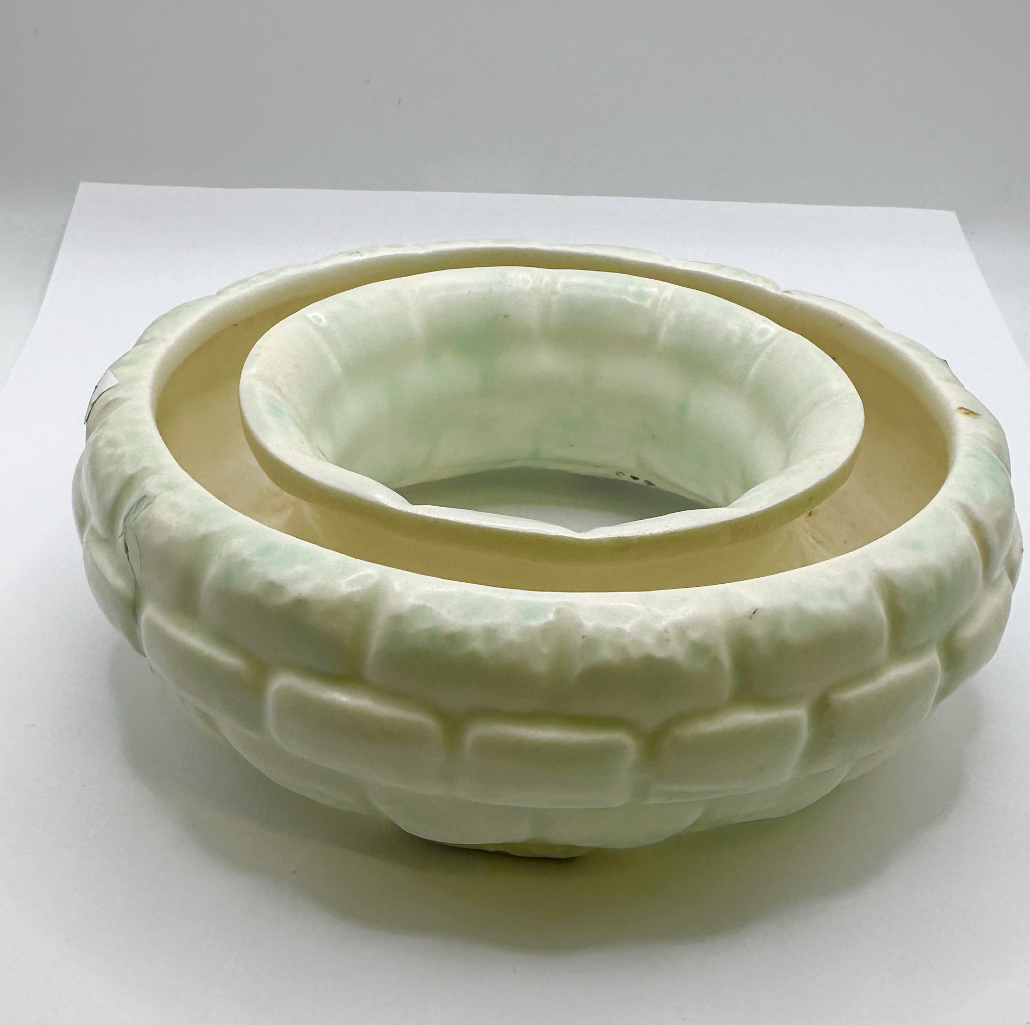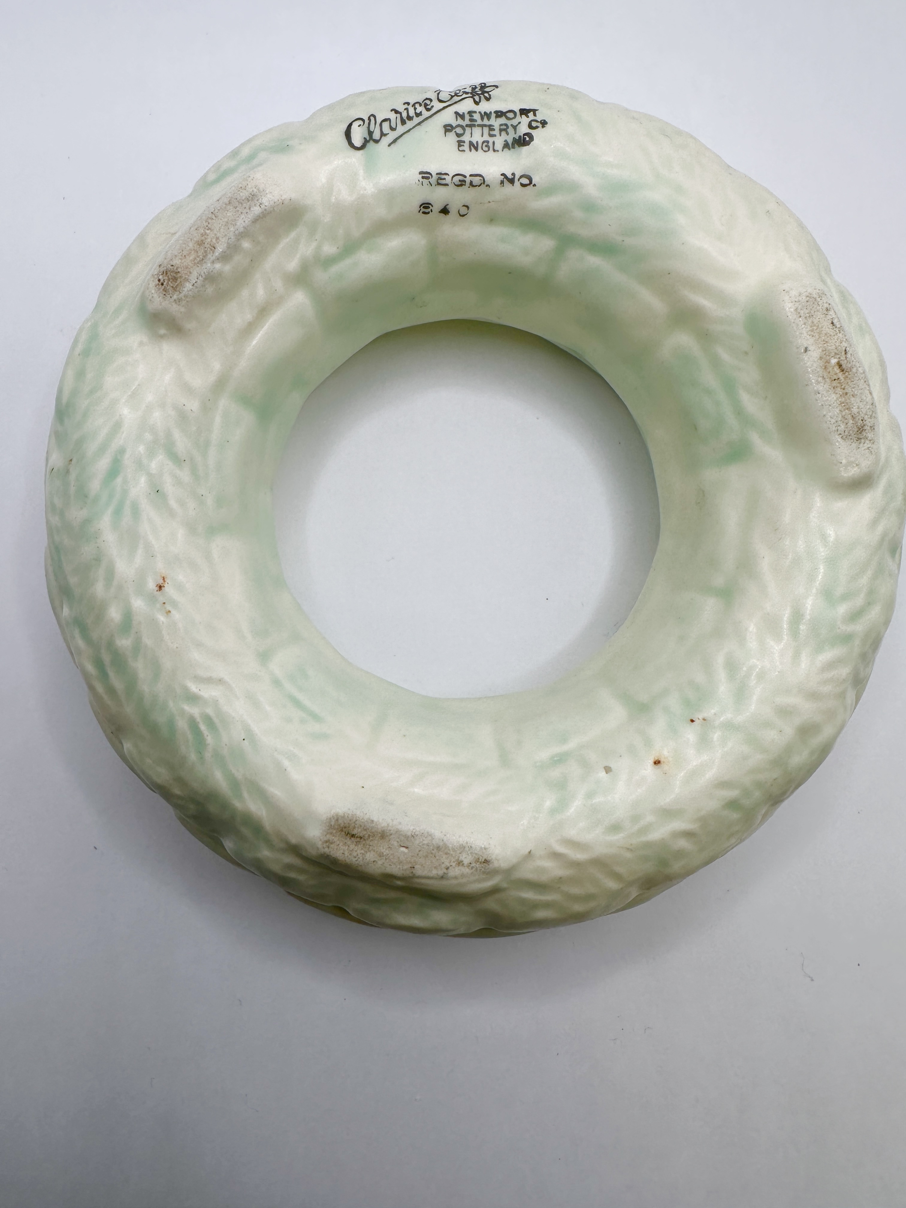A Clarice Cliff ceramic ring-shaped planter or posy trough produced by Newport Pottery Co. The piece is finished in a pale cream glaze with light green accents and features an embossed texture resembling masonry or brickwork. The underside is marked with the designer’s facsimile signature, the manufacturer’s stamp for Newport Pottery Co England, and the model number 840.