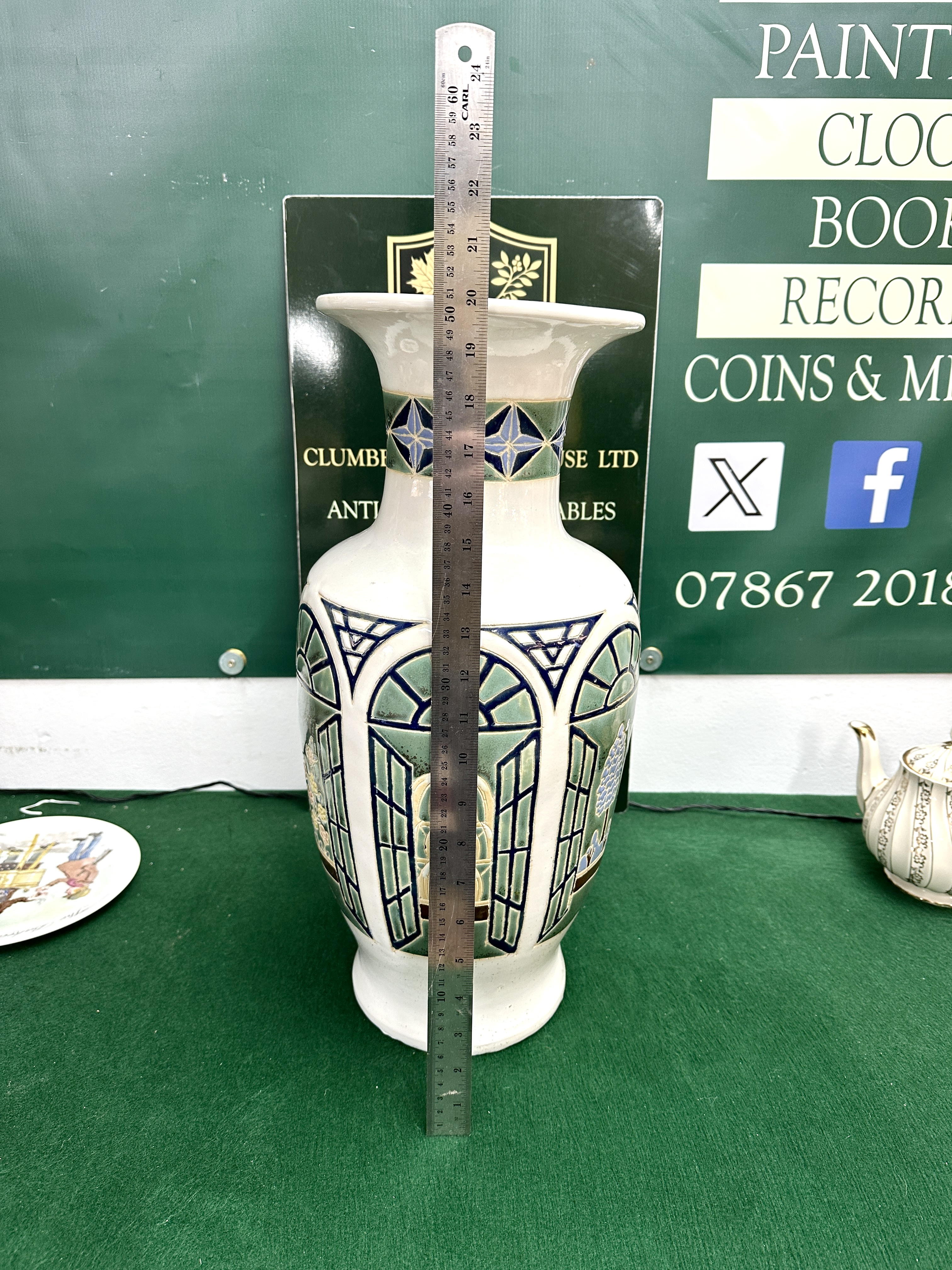 A large ceramic baluster-form vase attributed to Amphora, Czechoslovakia. The vessel features a tubelined architectural decorative scheme depicting arched conservatory or orangerie-style windows, executed in a palette of muted greens, blues, and pale yellows against a cream-coloured ground. A geometric band comprising diamond and star motifs encircles the neck beneath a widely flared rim. The underside bears hand-incised marks including the initials TL, CH, and the numeral 2H.