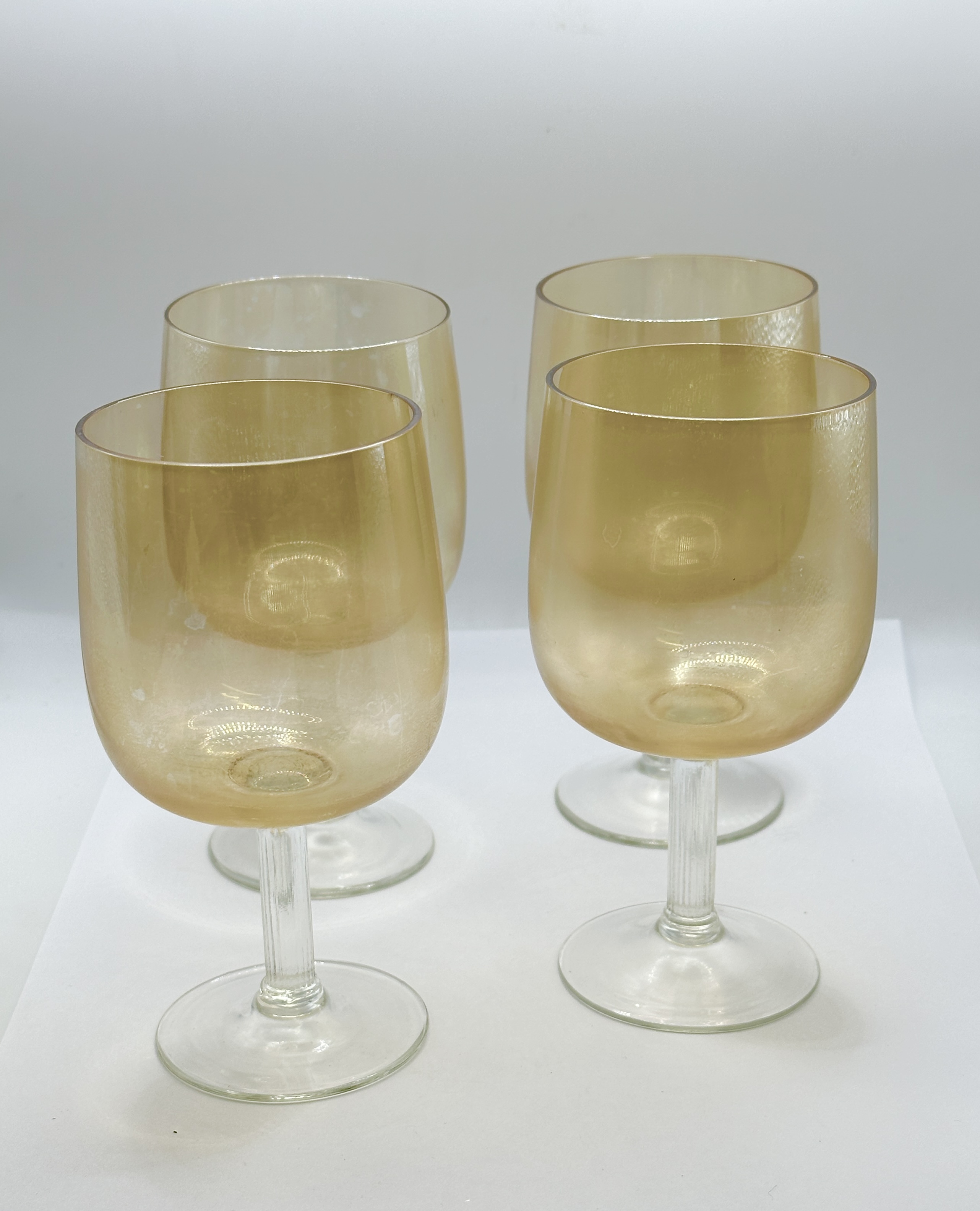 A set of stemware glasses featuring tulip-shaped bowls with a vibrant amber-toned iridescent lustre finish. The bowls are supported by clear glass stems with vertical ribbing, terminating in flat, circular bases. No manufacturer markings are visible. The construction features a contrast between the coloured bowls and the clear, textured stems.