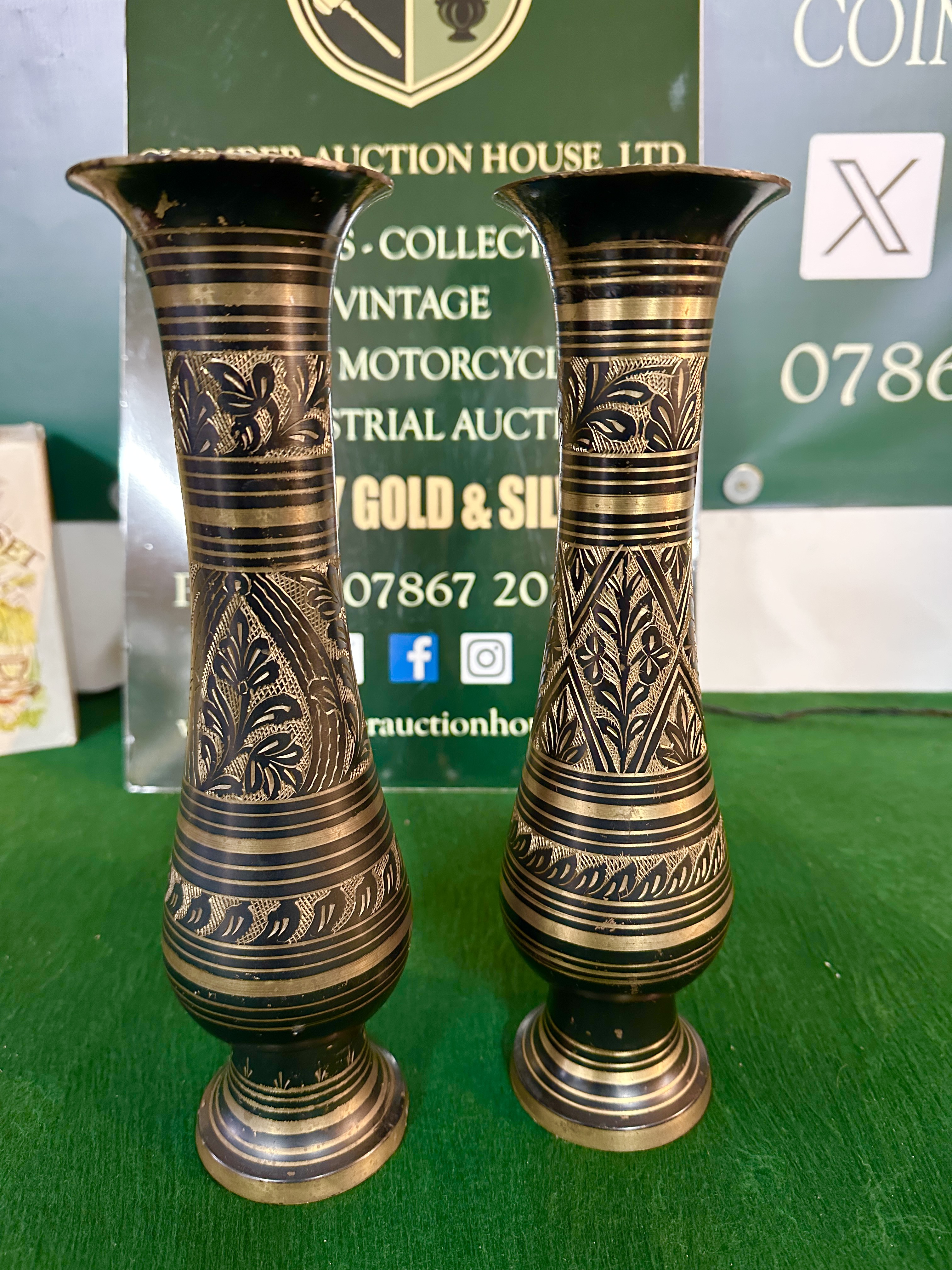 A pair of vintage Indian Nakkashi brass vases. Each vessel features a slender, elongated neck with a flared rim and a bulbous lower body resting on a circular pedestal base. The decorative scheme consists of intricate hand-etched foliate and geometric patterns. The recessed etched areas are filled with a dark black lacquer or enamel inlay to create a high-contrast design against the metallic ground.