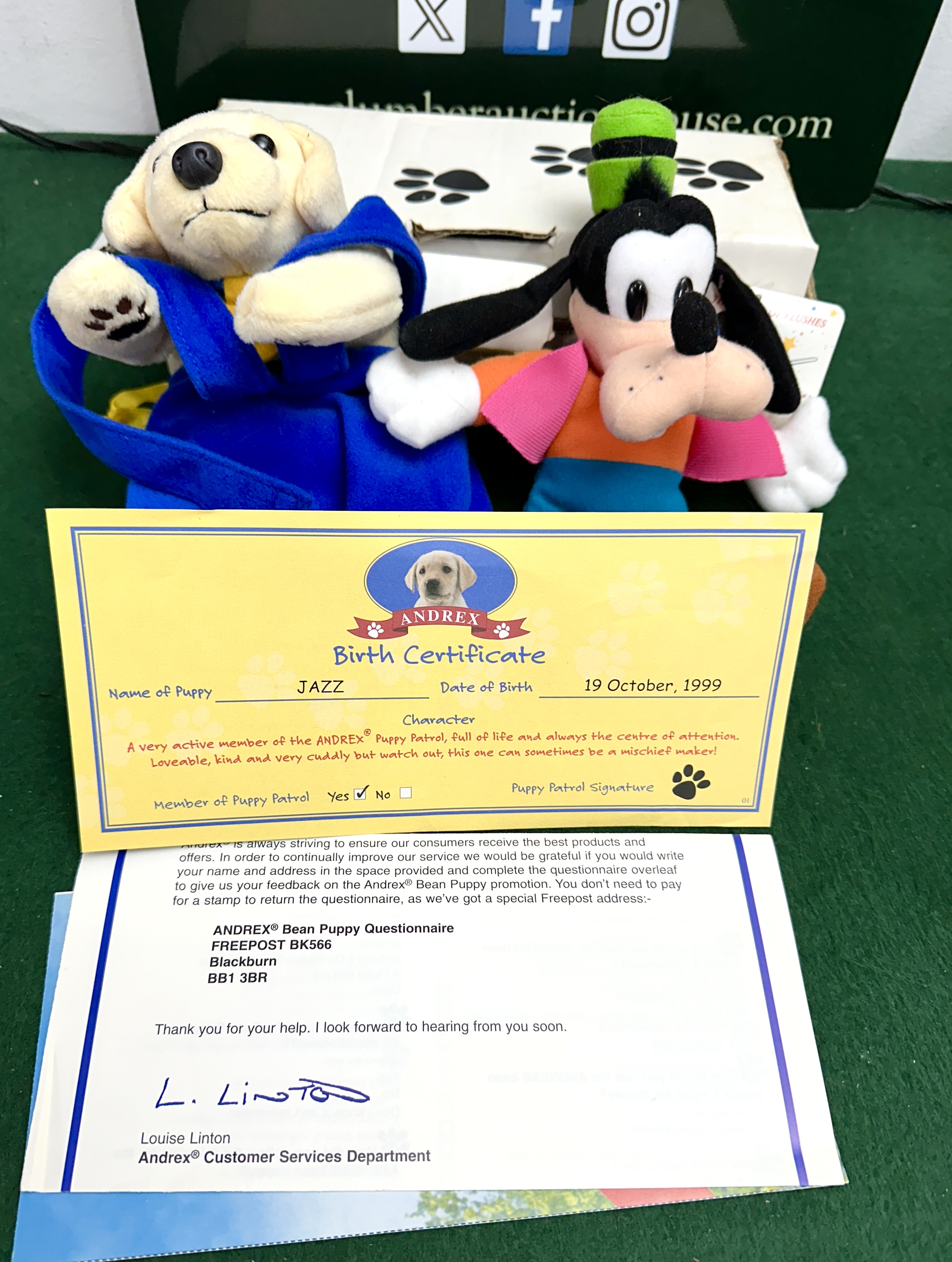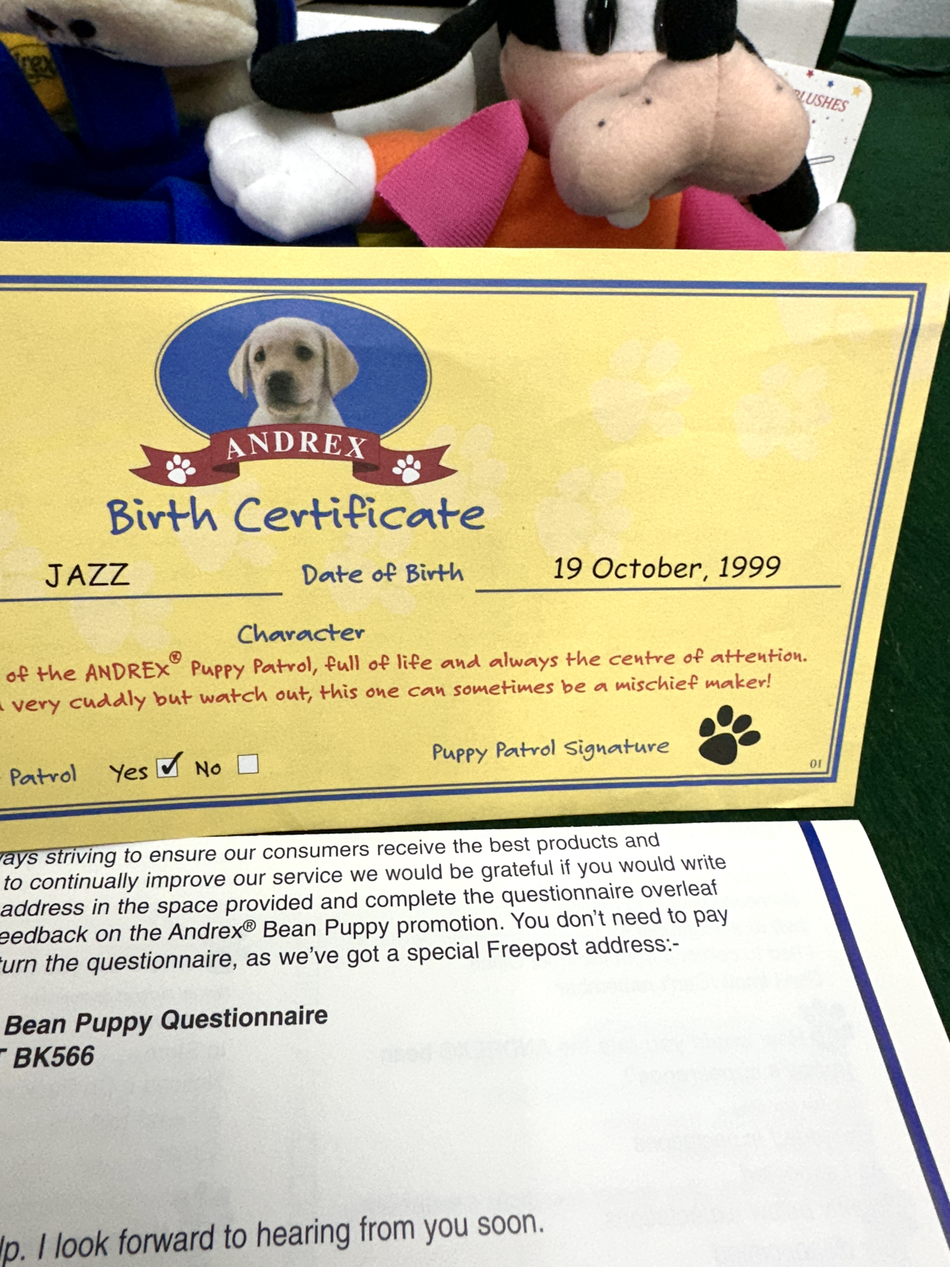 A collection of promotional plush toys and ephemera, featuring a Disney Store Goofy plush and an Andrex Puppy Patrol bean puppy. The Disney Store Goofy is a medium soft toy constructed from plush fabric and depicted in his classic attire of a green hat, orange shirt, and blue trousers. The Andrex yellow Labrador puppy is a bean-filled plush toy dressed in a blue hooded garment and is accompanied by its original printed paper Andrex Birth Certificate for a puppy named Jazz, dated 19 October 1999. The documentation identifies the item as part of the Andrex Puppy Patrol promotion and includes a customer service letter and questionnaire regarding the Bean Puppy series. The collection is presented with a white cardboard mailing box featuring a black paw print motif.