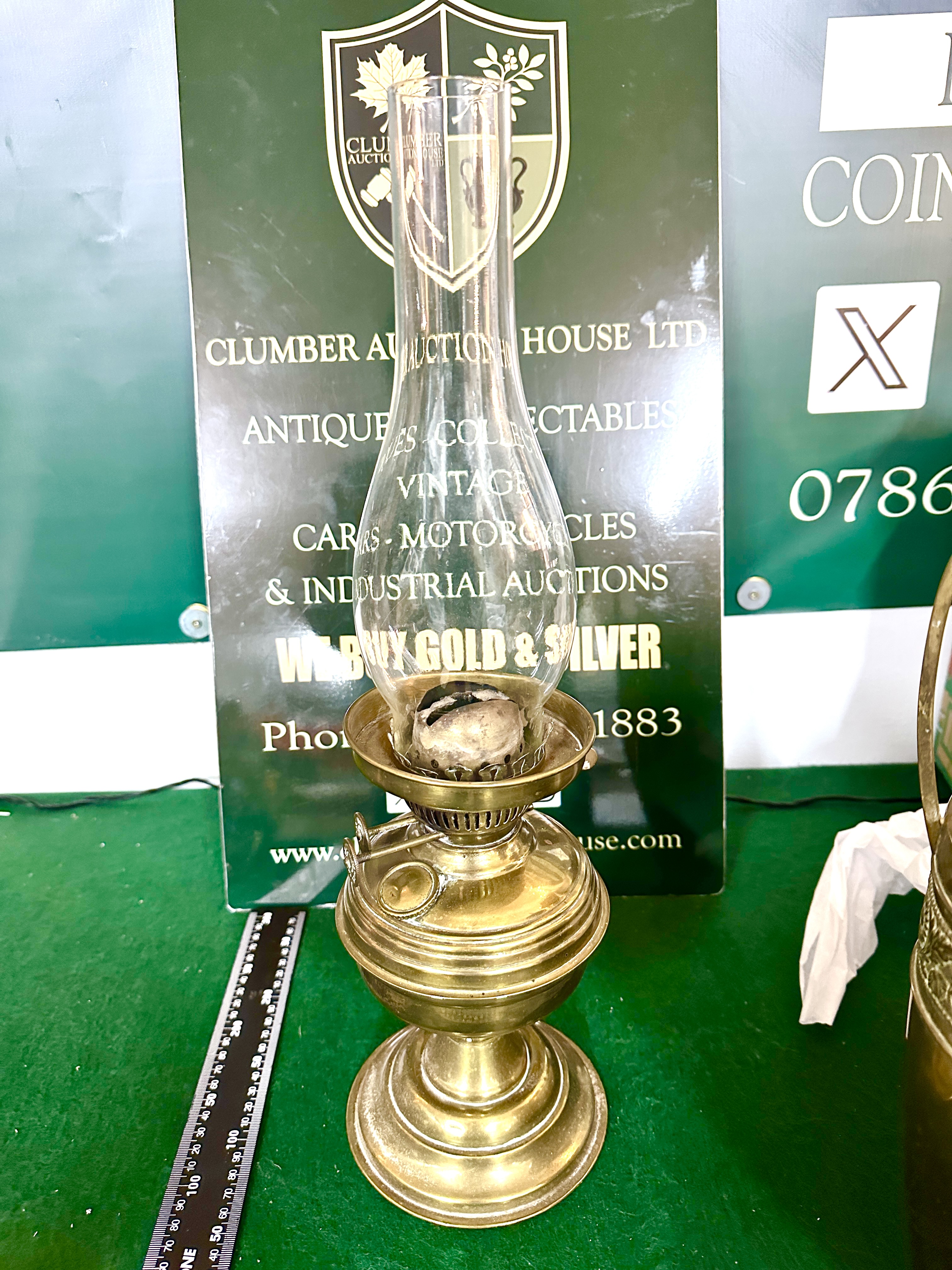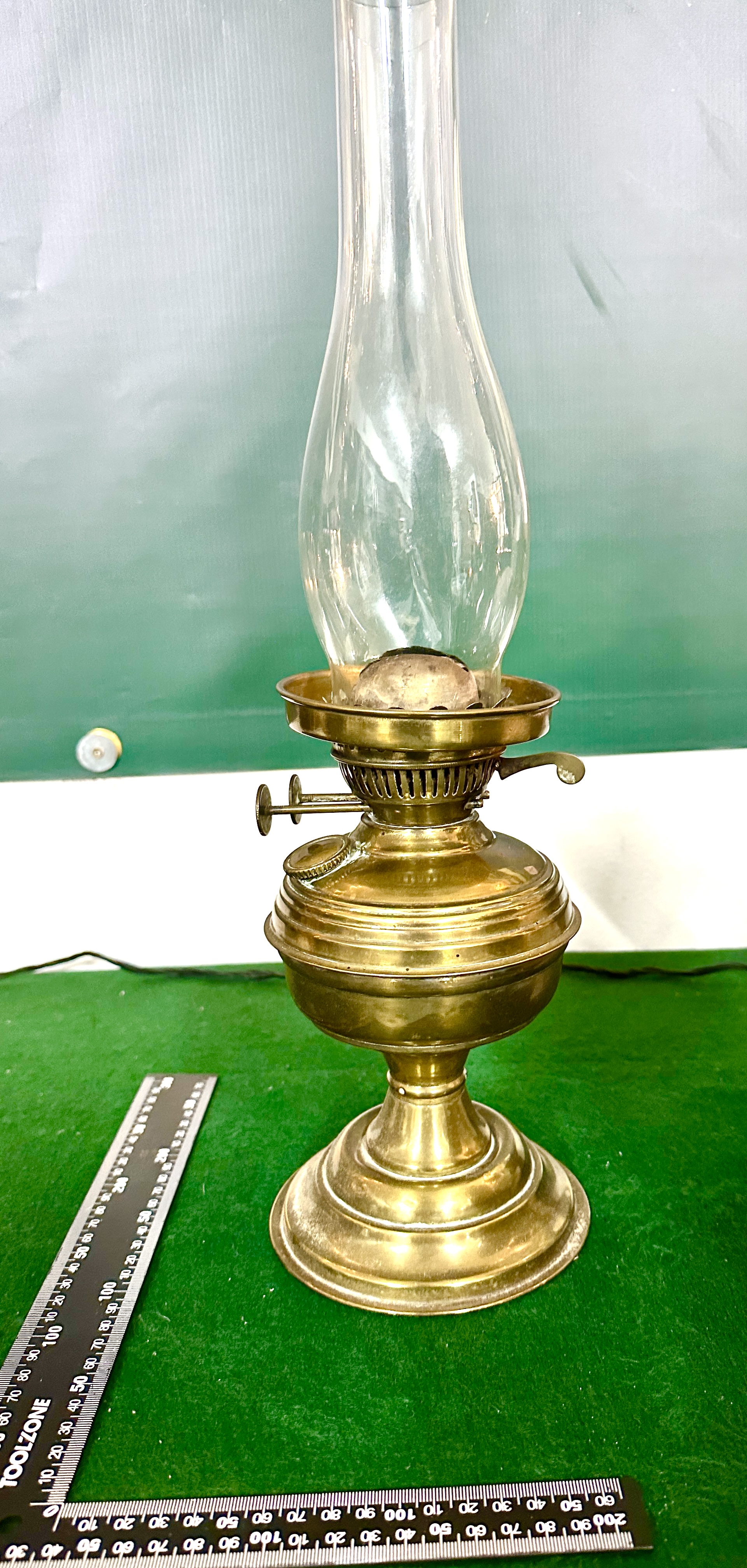 The piece exhibits a natural aged patina with areas of surface tarnish and minor abrasions consistent with age. The glass chimney is in good structural condition with no observed chips or cracks. The burner mechanism appears functional.