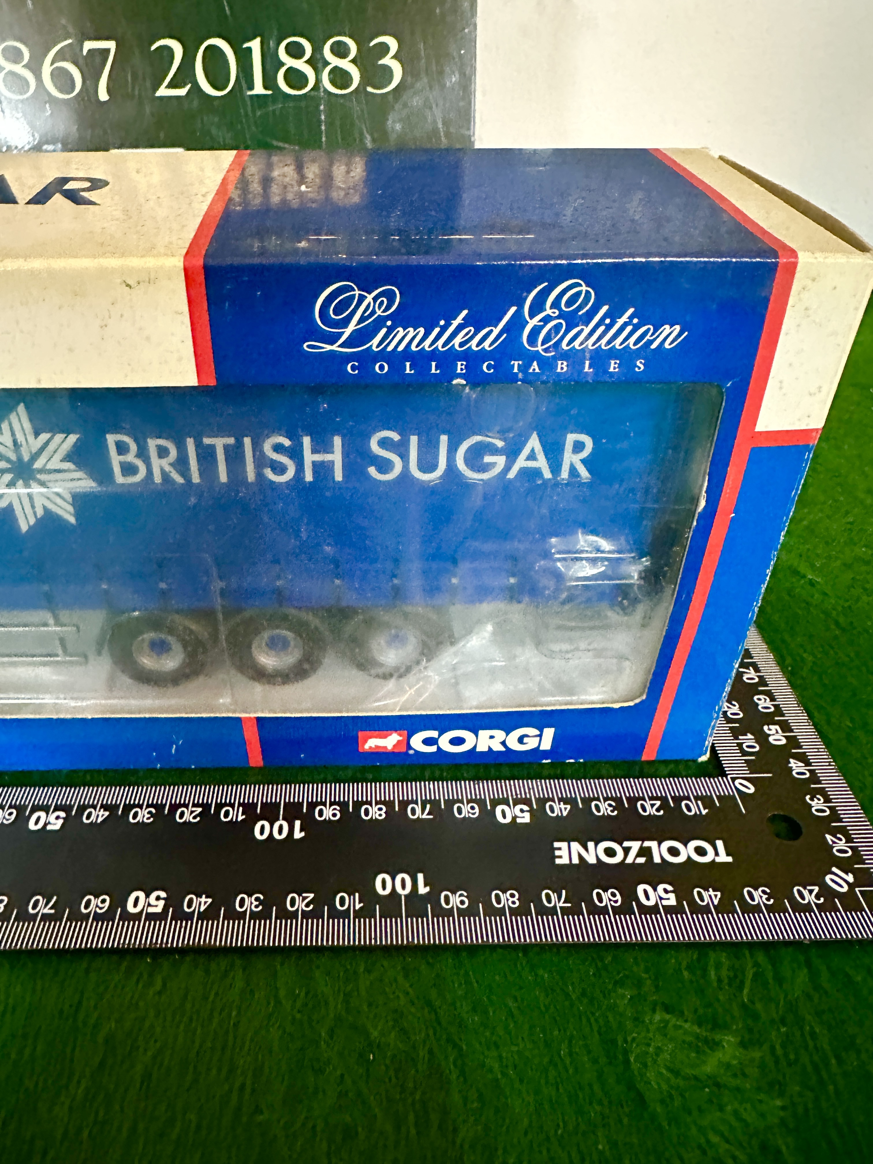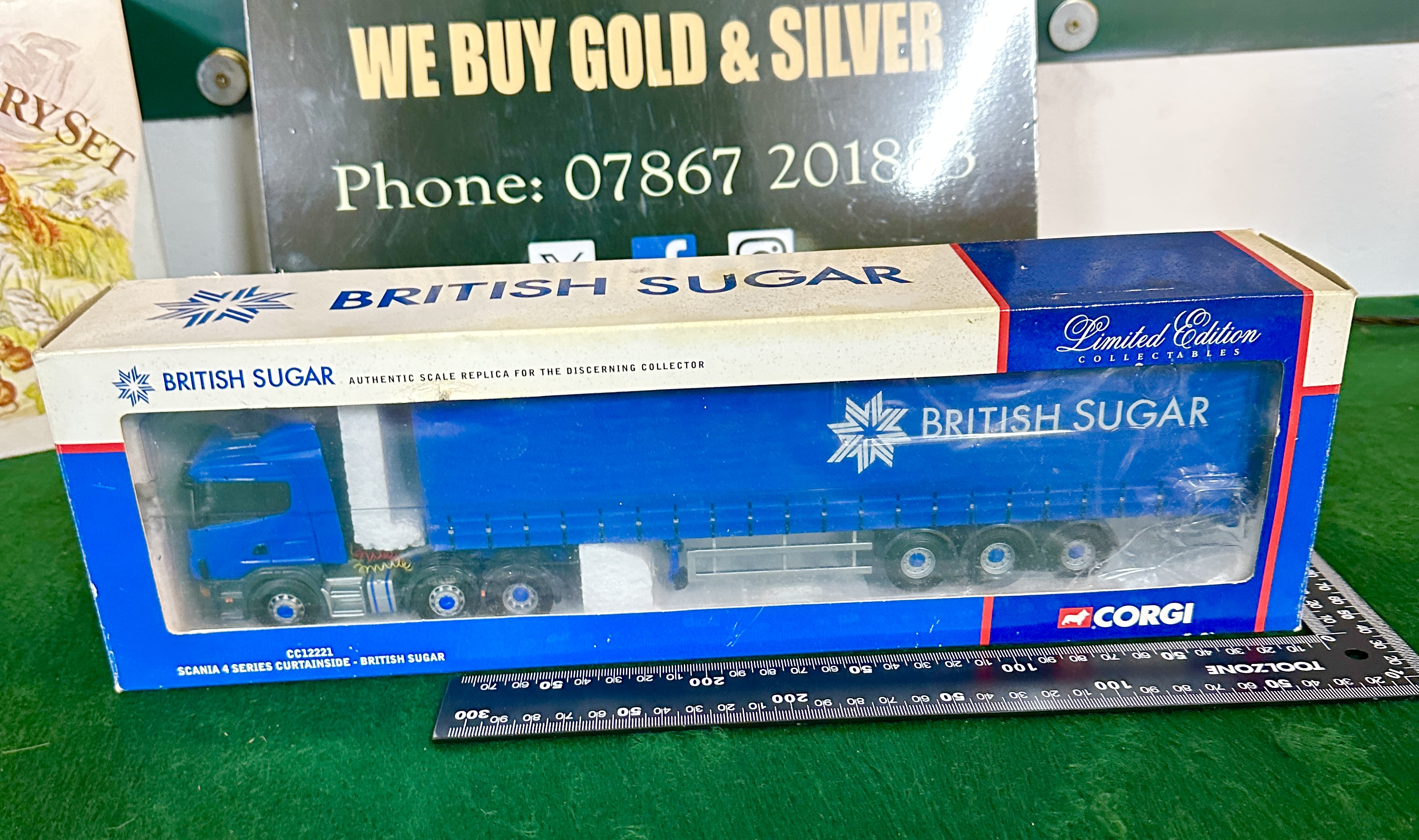A Corgi Limited Edition die-cast model truck, Scania 4 Series Curtainside, featuring British Sugar livery, reference CC12221. This model is part of the Limited Edition Collectables series and consists of a blue cab and matching curtainside trailer. The trailer and cab are finished with white British Sugar branding and snowflake logos. The model is presented in its original cardboard window display box.