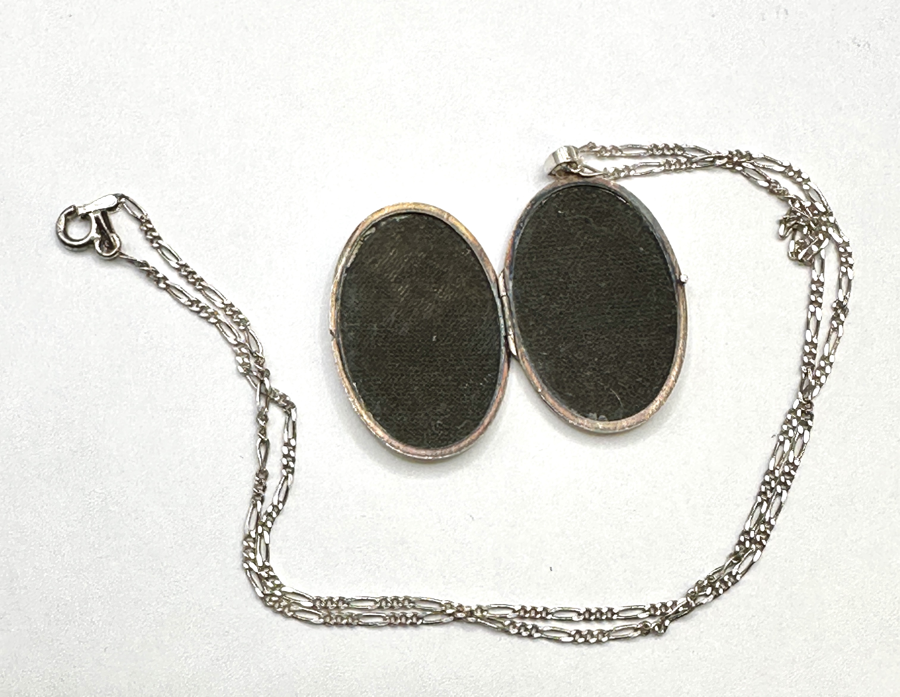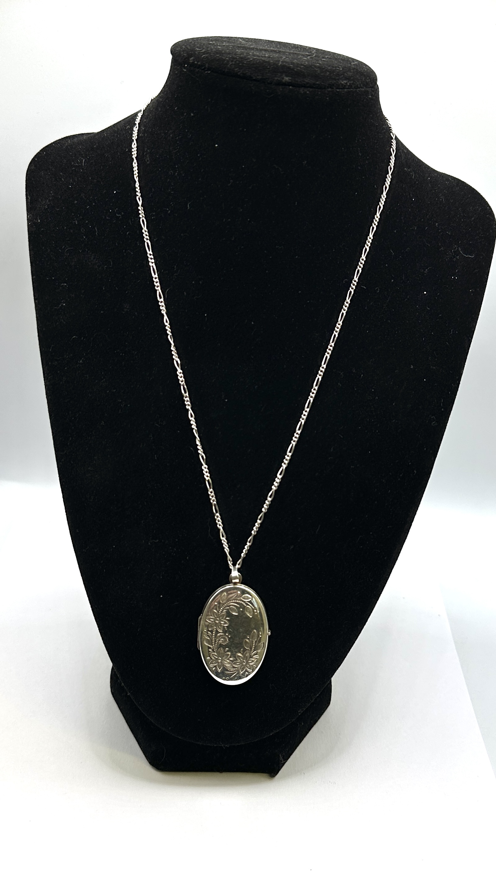 An ornate 925 silver locket necklace. The oval pendant features an engraved foliate and floral motif to the front and a plain brushed finish to the reverse. The locket opens on a side hinge to reveal two internal recessed compartments lined with dark textured fabric. The pendant is suspended from a 925 silver Figaro-style chain secured with a lobster claw clasp.