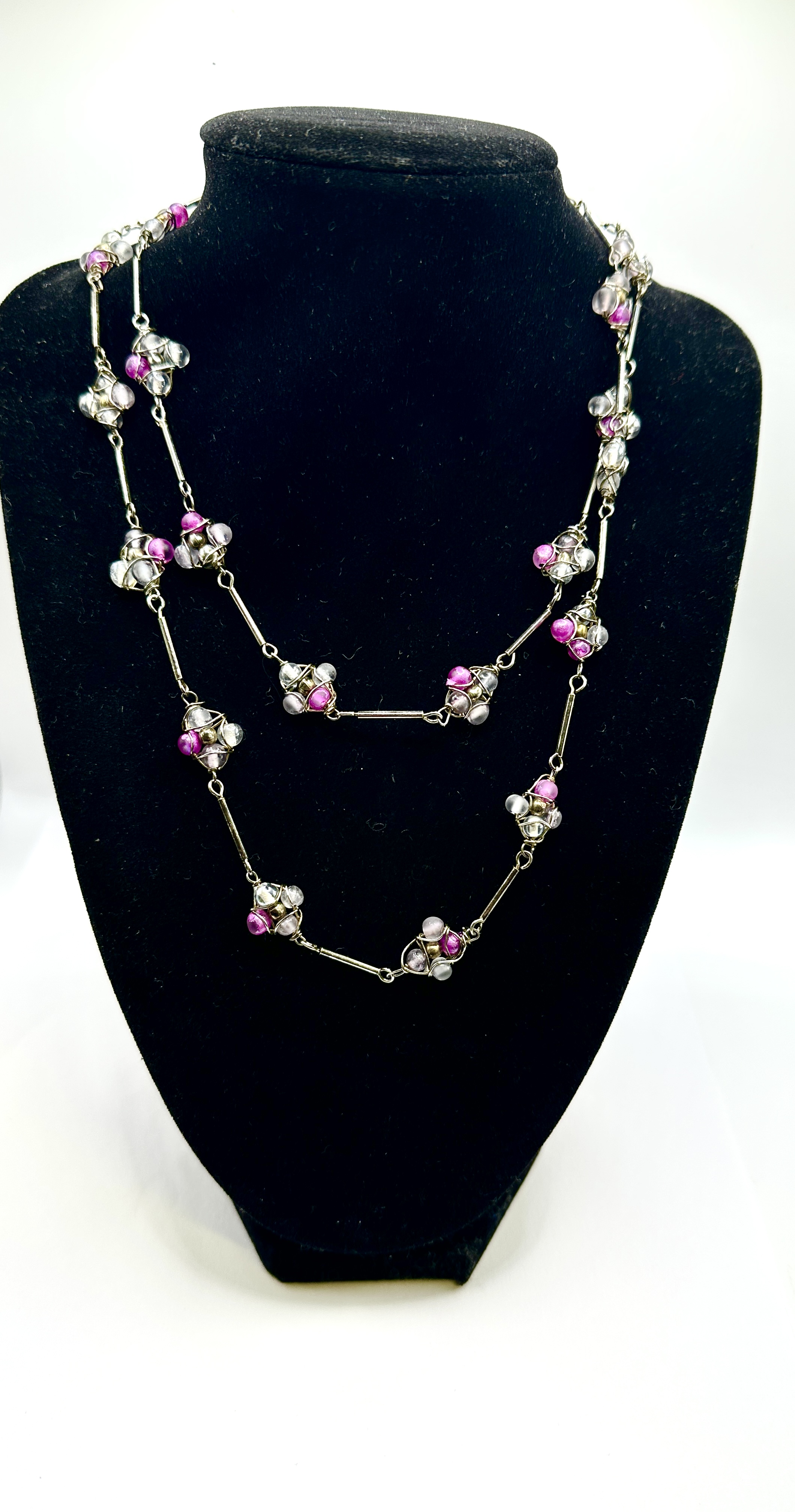 This long-form station-style necklace is composed of 925 silver. The design features a series of elongated 925 silver bar links connected by wire-wrapped bead clusters. These decorative clusters incorporate a mix of fuchsia-pink, clear, and small gold-toned beads. The necklace is constructed as a continuous chain of alternating metal bars and bead stations.