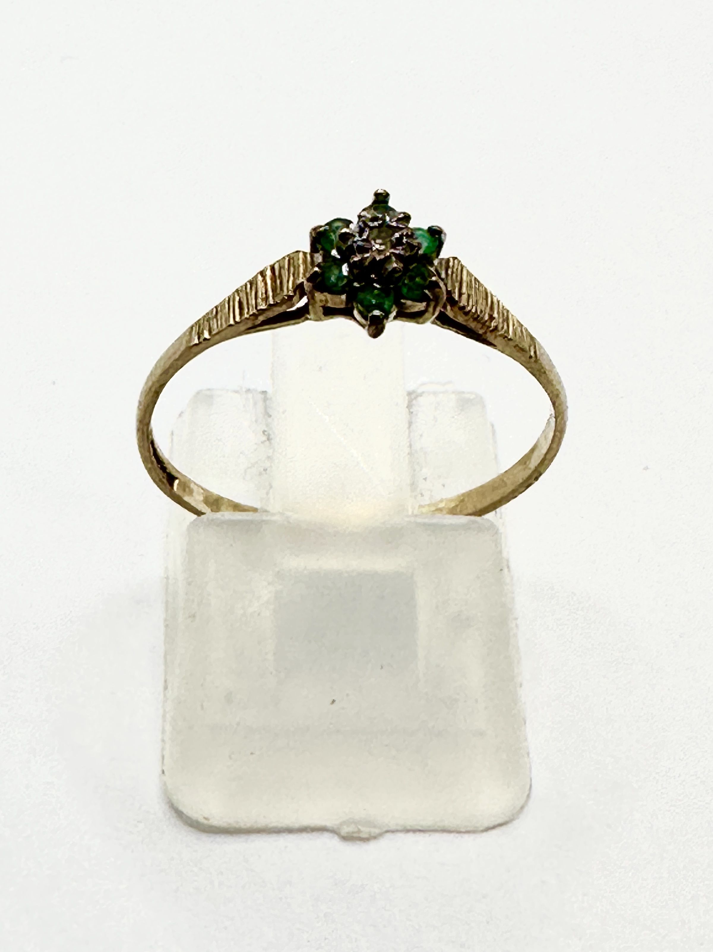 A 9k gold ring featuring a floral cluster head. The central faceted diamond is surrounded by a halo of six faceted emeralds, all claw-set in a white metal mount. The 9k yellow gold band features tapering shoulders with a decorative bark-effect textured finish.