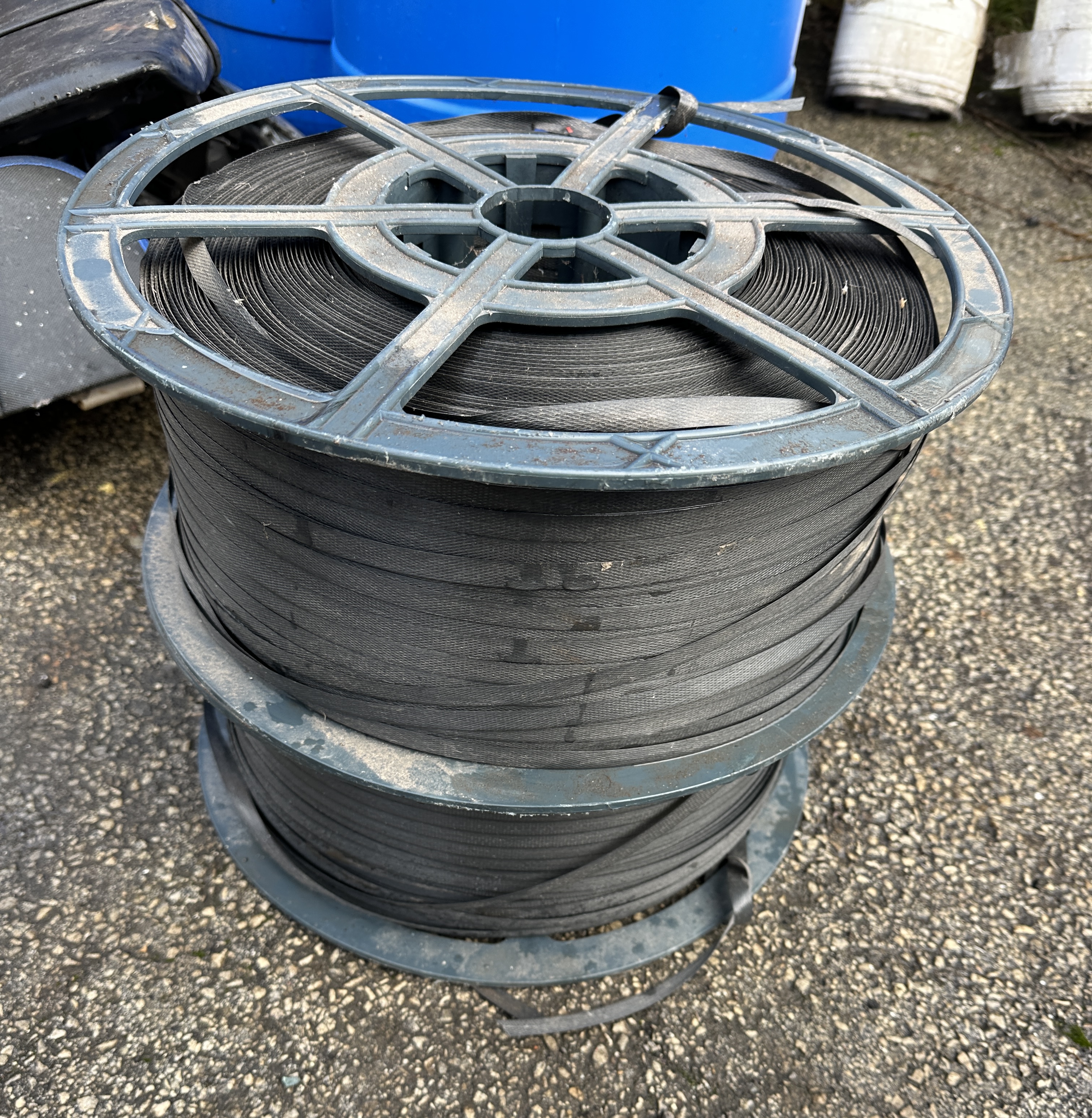 A duo of industrial reels wound with black strapping, designed for palletising and securing cargo. The strapping is constructed from a flat, woven plastic material, identified as polypropylene. Each coil is mounted onto a dark grey moulded plastic spool featuring a reinforced spoke design. The items lack visible manufacturer markings or specifications.