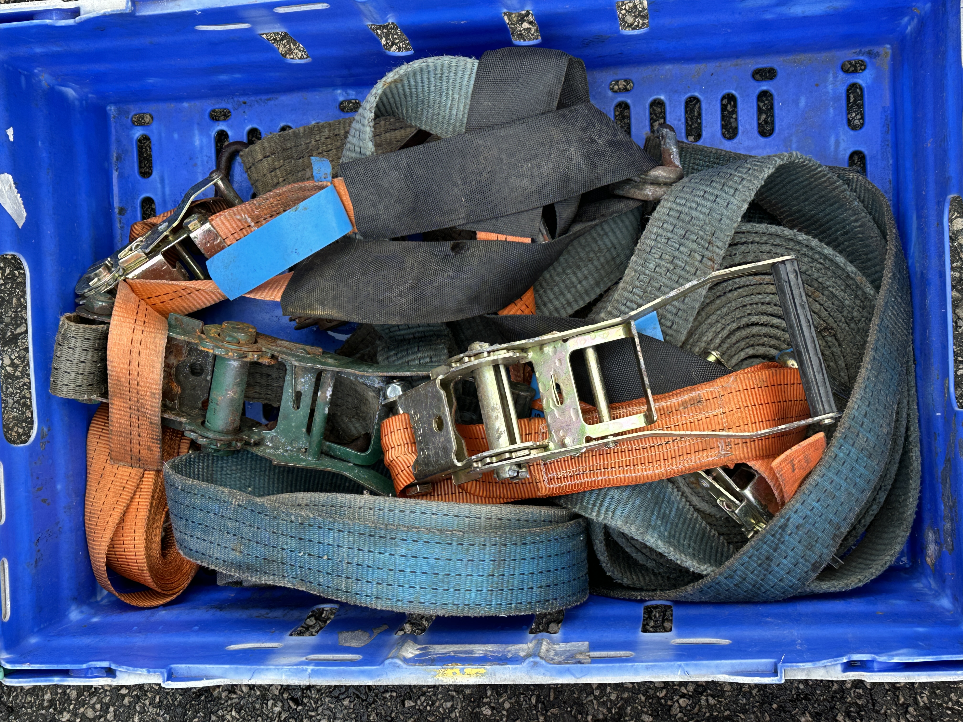 A collection of heavy-duty ratchet tie-down and lashing straps, including components stamped with the SAFESET brand. The lot comprises various widths and lengths of synthetic webbing in orange, blue, black, and grey. The straps are paired with metal ratcheting mechanisms, some featuring a zinc-plated finish and others with a green-painted finish. The hardware includes integrated metal hooks for cargo securing. The collection is housed within a ventilated blue plastic crate.