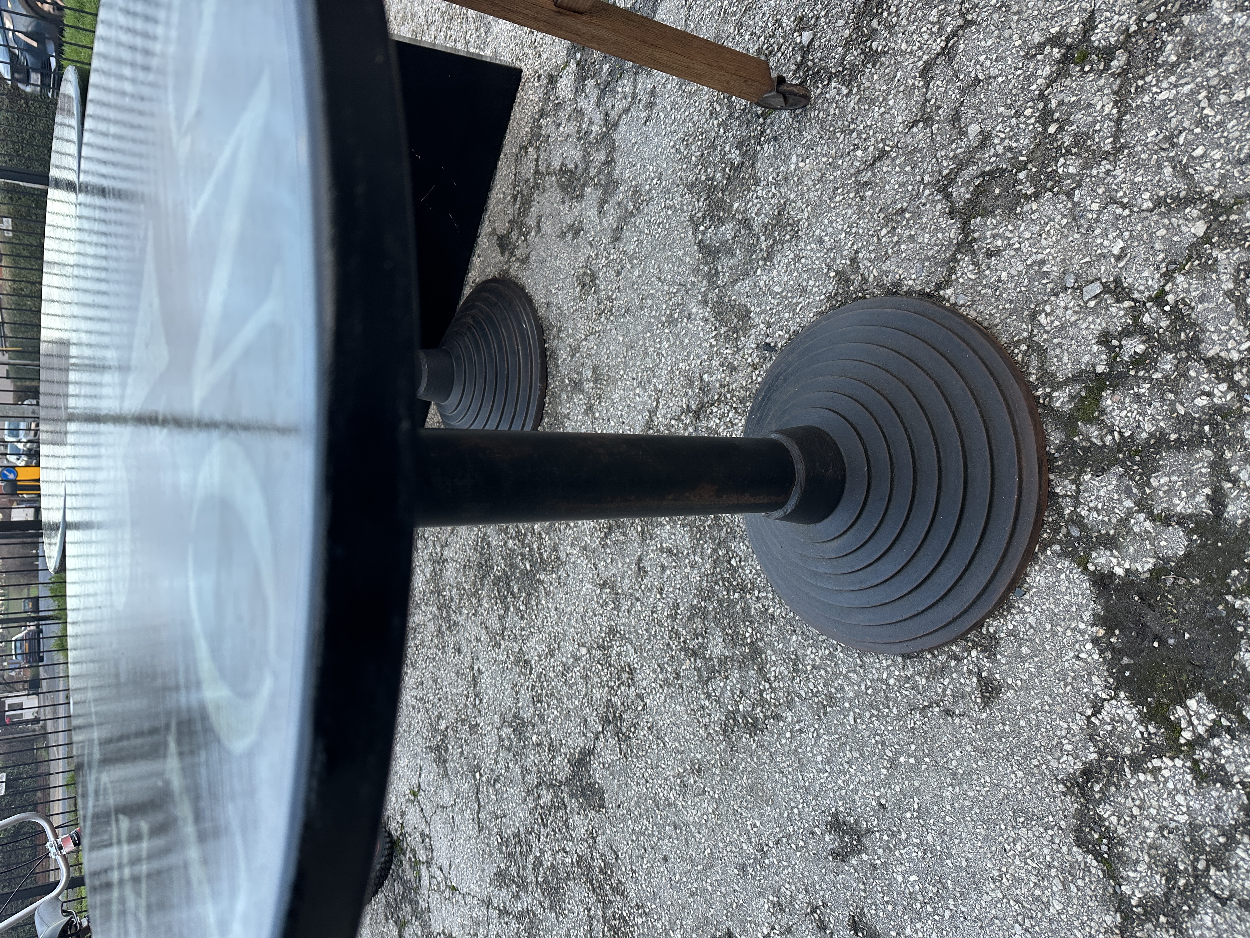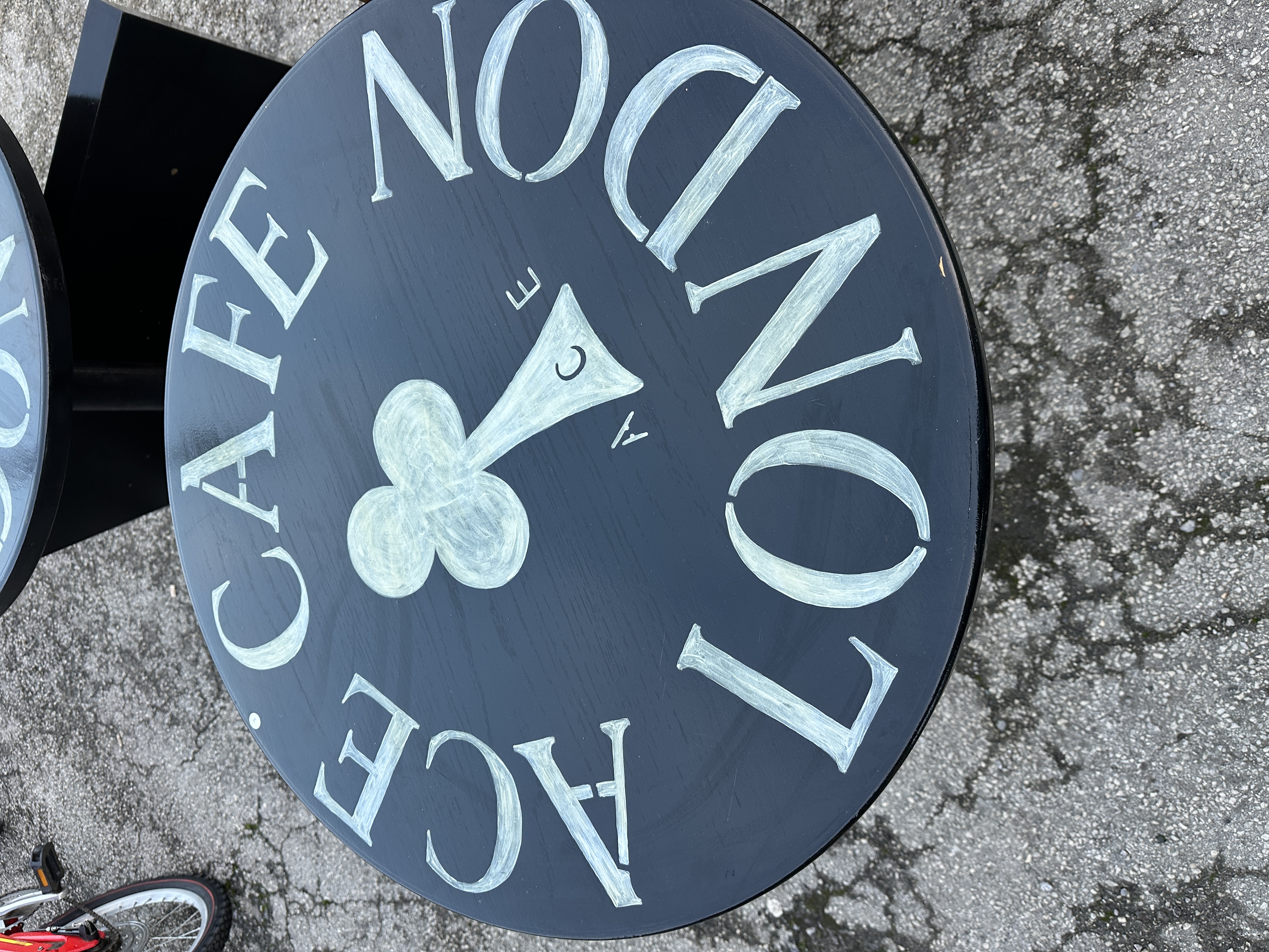 2 (TWO) pedestal cafe tables featuring the branding of Ace Cafe London. Each table comprises a circular tabletop with a black finish, decorated with hand-painted style white lettering and graphics. The perimeter of the surface is inscribed with the text ACE CAFE LONDON, while the centre displays a club suit motif incorporating the letters A, C, and E. The tops are supported by dark-toned metal pedestal columns terminating in stepped, circular weighted bases. These items are characteristic of the furniture used at the iconic North London transport cafe and its international franchises.