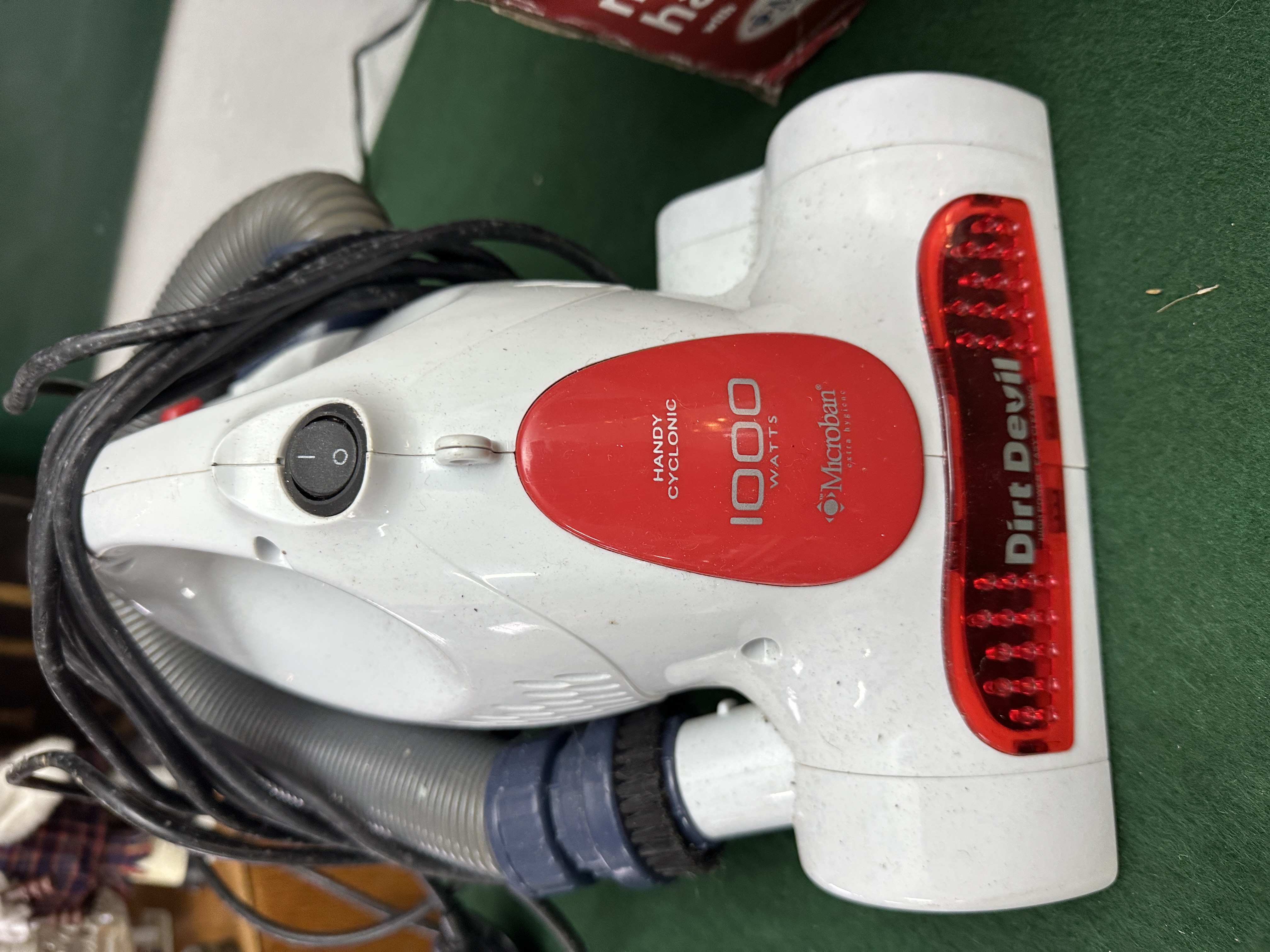 A Dirt Devil Handy Cyclonic mains-powered handheld vacuum cleaner. The unit is constructed from white and red plastic and features a 1000-watt motor. It is marked with Microban extra hygiene branding. The vacuum includes an integrated power cord and a flexible hose attachment fitted with a brush tool. The item is accompanied by its original retail cardboard packaging.