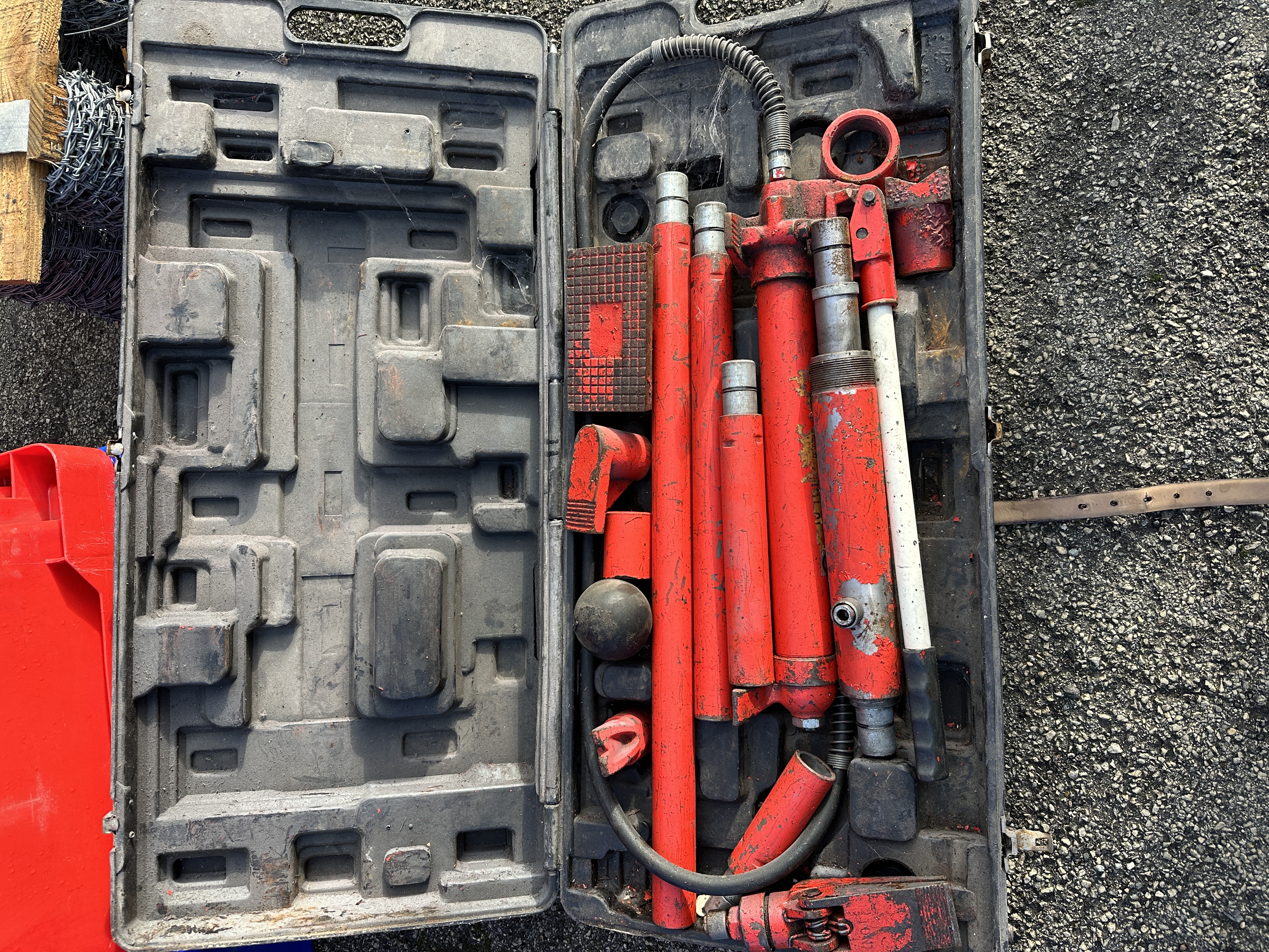 A Pittsburgh hydraulic body repair kit, commonly referred to as a porta-power set. The collection is comprised of various red-painted metal components including a hydraulic ram, a hand pump assembly fitted with a high-pressure hose, and several extension tubes of varying lengths. The set includes multiple specialised attachments such as a spreader tool, flat bases, and a rubber head. One component features a visible cast TON marking. The entire assembly is housed within a black moulded plastic carrying case.