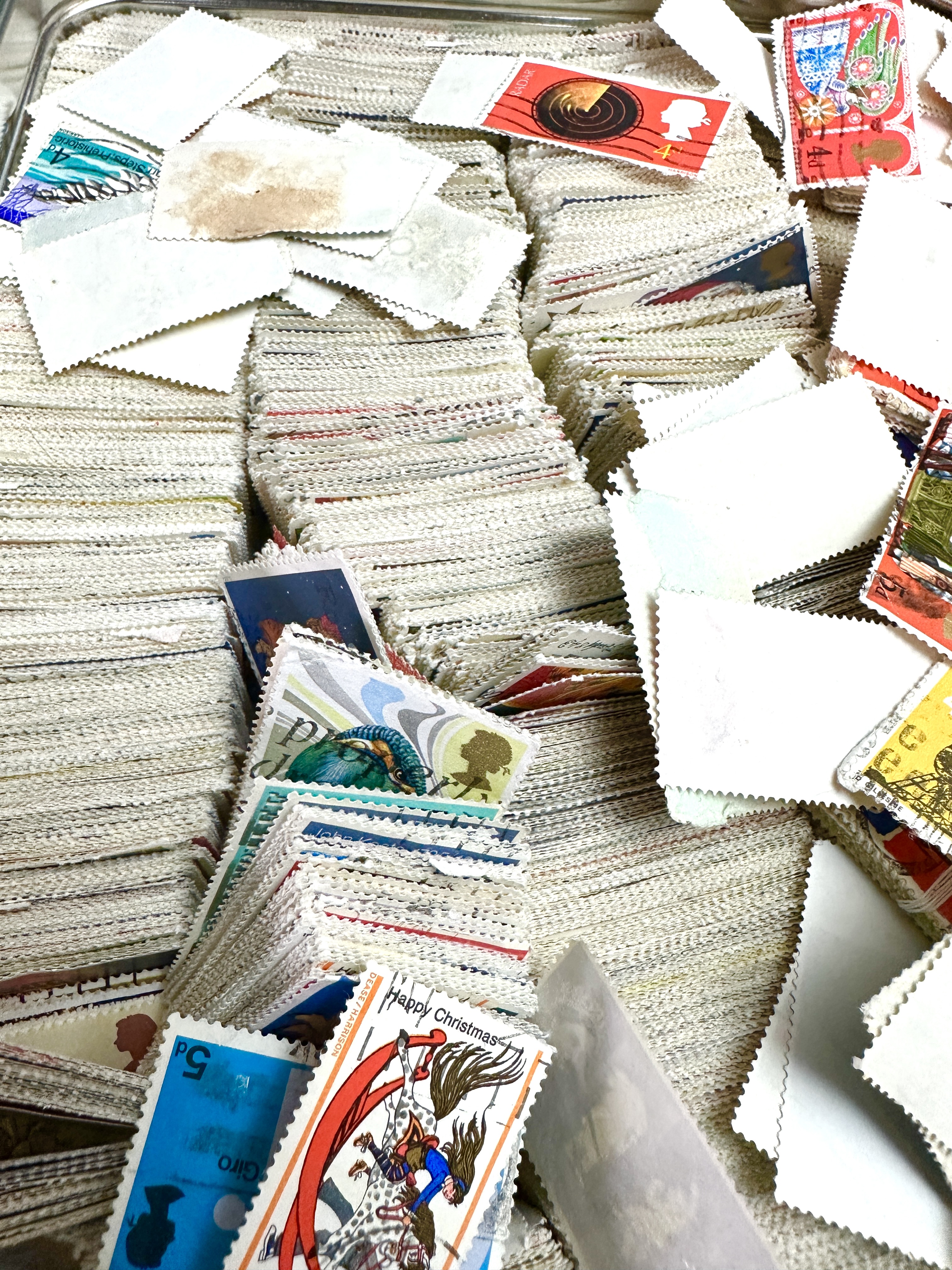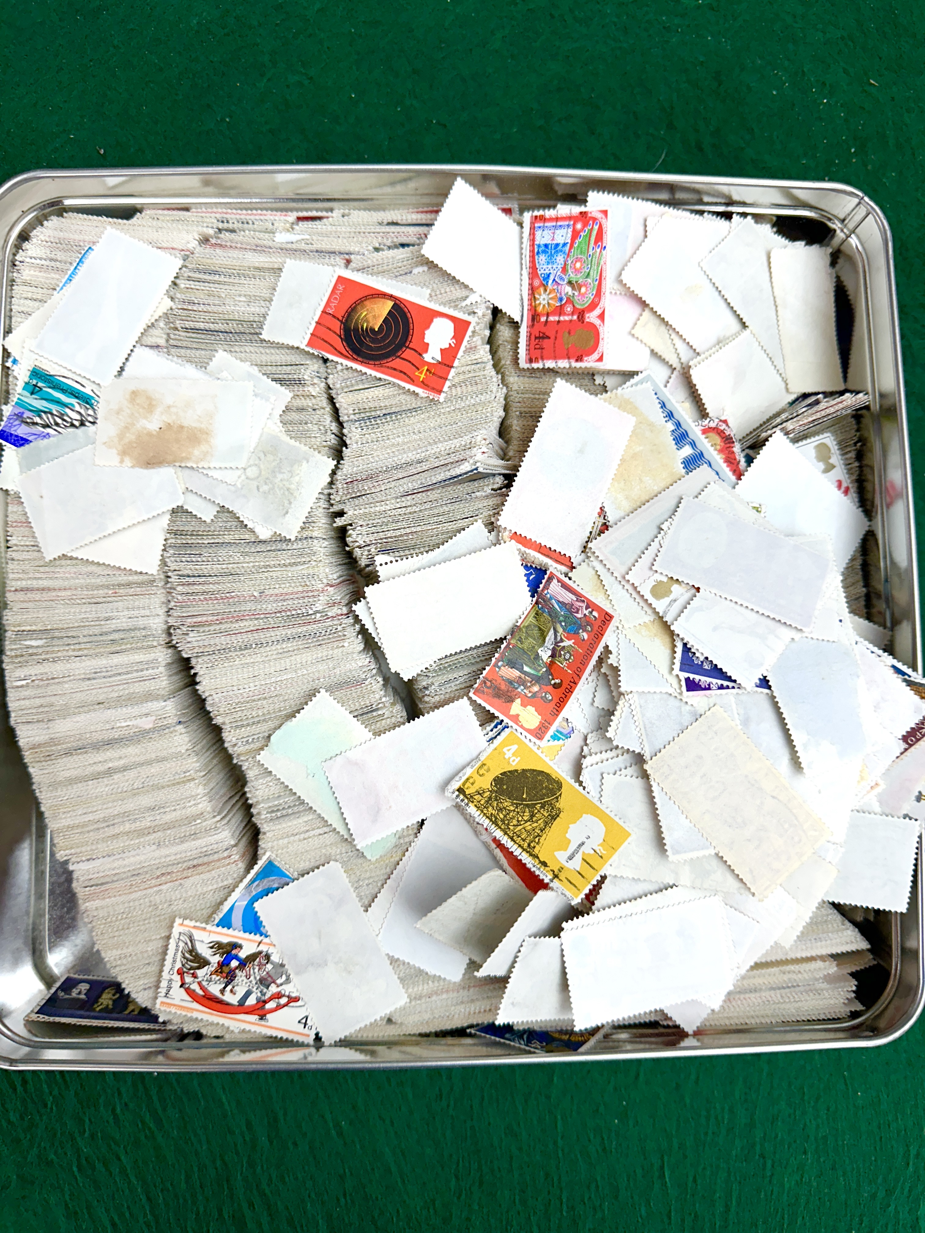 A collection of United Kingdom postage stamps housed in a rectangular, blue-labelled Jacob’s Savoury Biscuits tin. The accumulation includes numerous bundles and loose examples, primarily featuring commemorative and definitive issues from the mid-20th century. Visible denominations are in pre-decimal currency, including 4d and 5d. Notable designs include a 1970 Radar anniversary issue, a Declaration of Arbroath 1320 commemorative, and various Christmas-themed stamps, most displaying the silhouette of Queen Elizabeth II. The stamps are largely off-paper. The decorative tin lid is marked with a handwritten label reading MULTIPLE UK STAMPS.