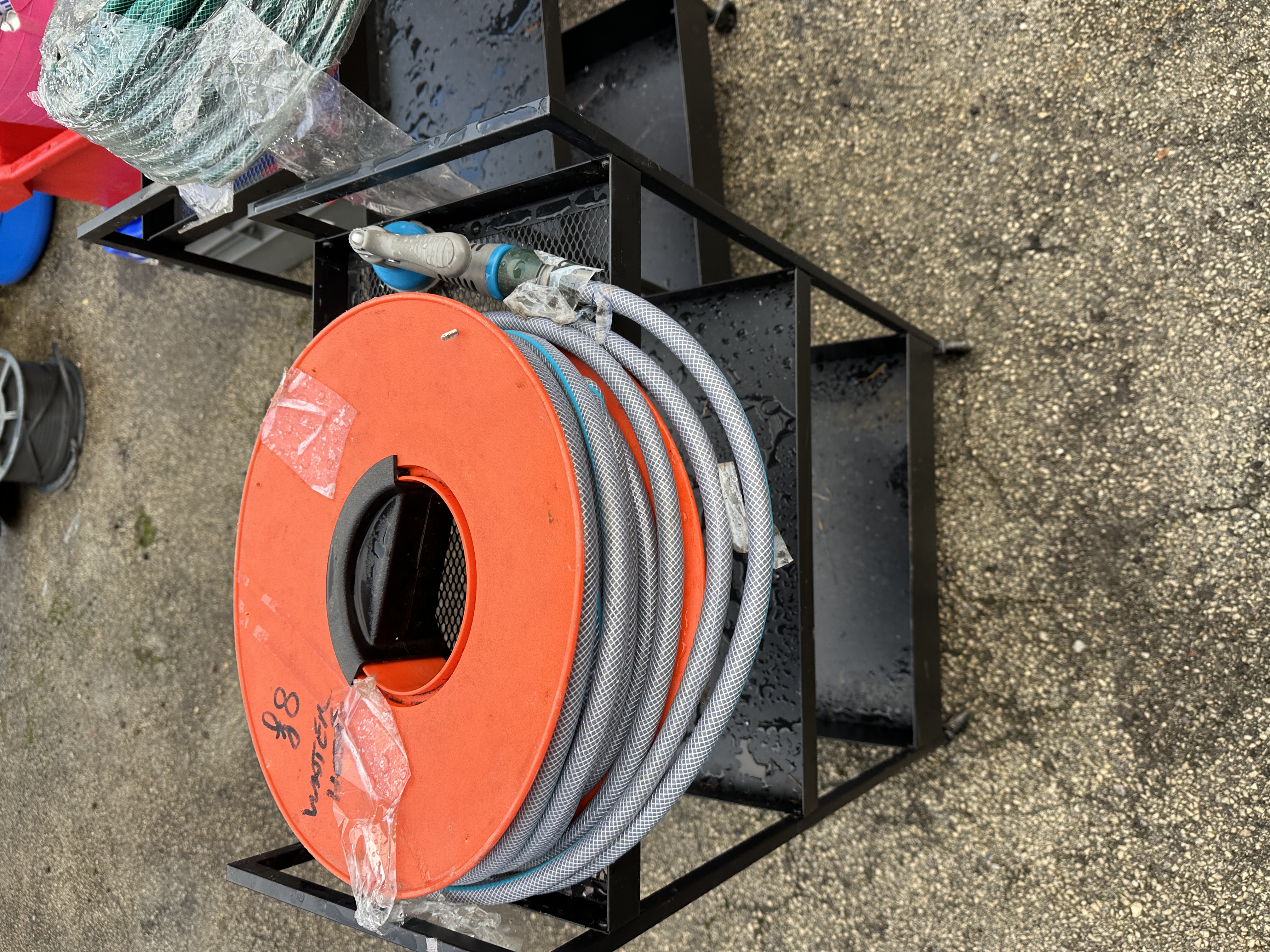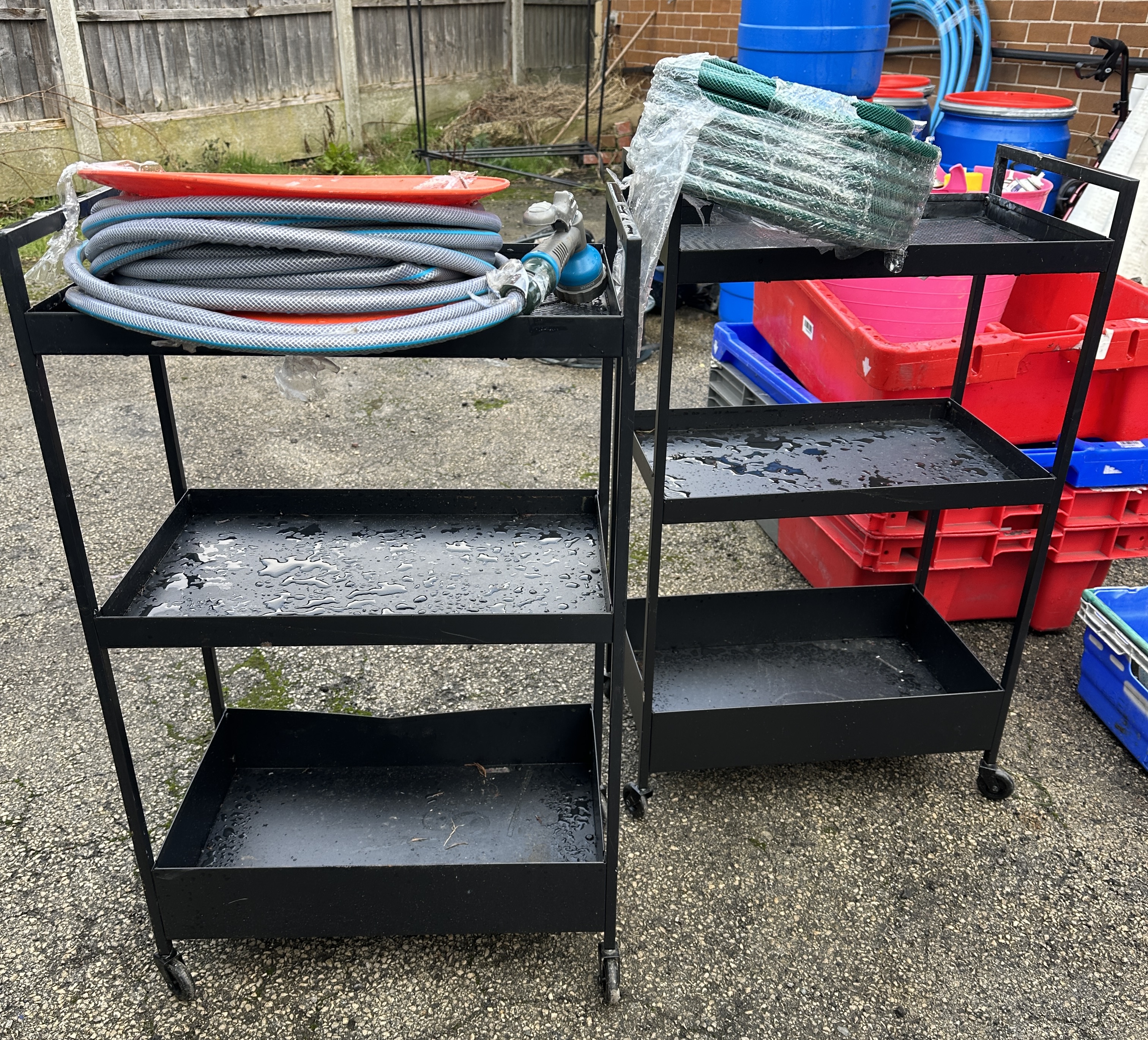 A collection of IKEA NISSAFORS black utility carts and garden maintenance equipment. The carts are constructed from powder-coated steel, each featuring a three-tier design with a deep base bin and two upper shelves, all mounted on swivel castors. The garden maintenance equipment includes a grey hose with blue accents wound onto a circular orange plastic reel, which features the handwritten inscription 88 WATER and an attached spray nozzle. The lot also contains a coiled green garden hose partially wrapped in clear plastic film.
