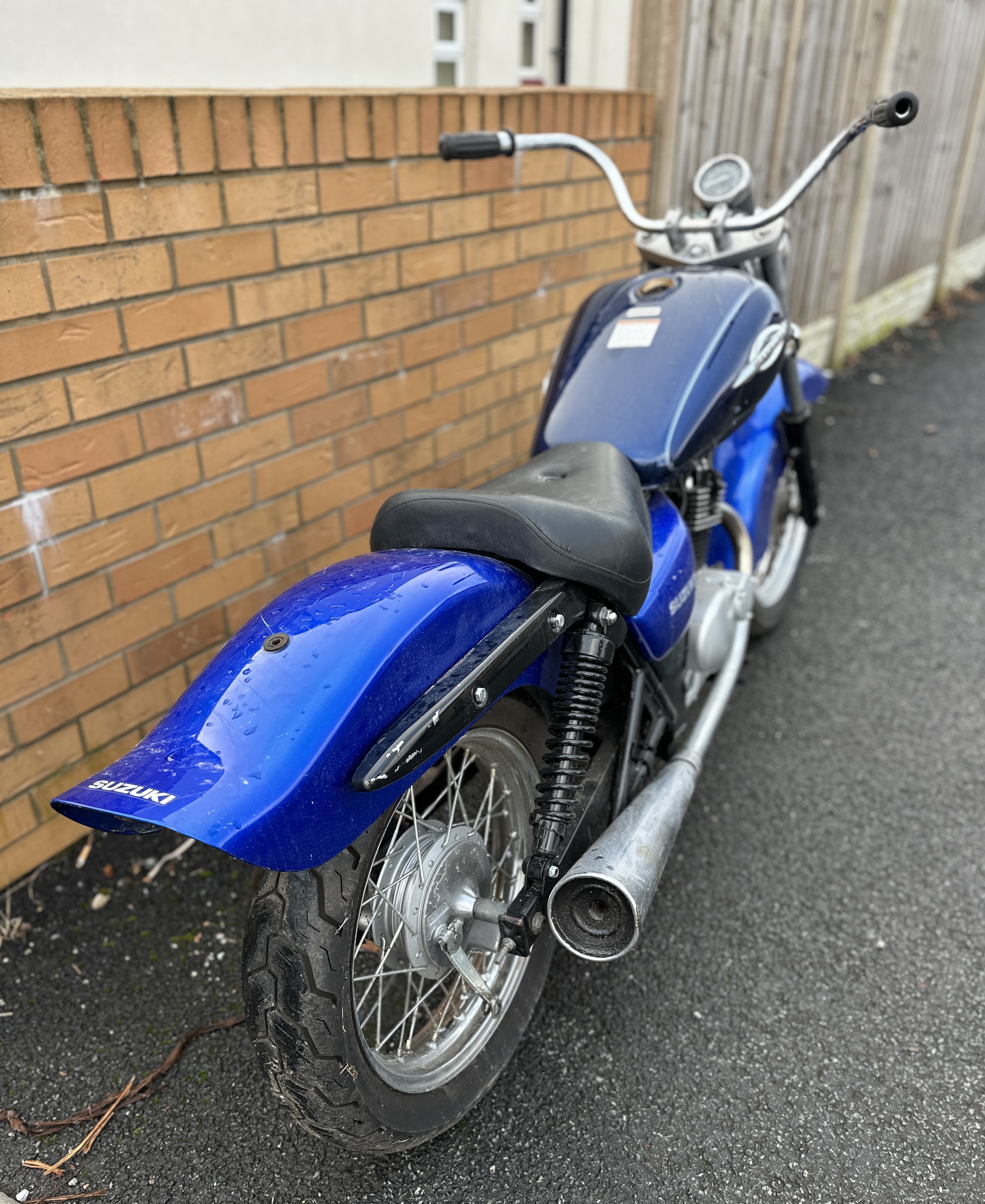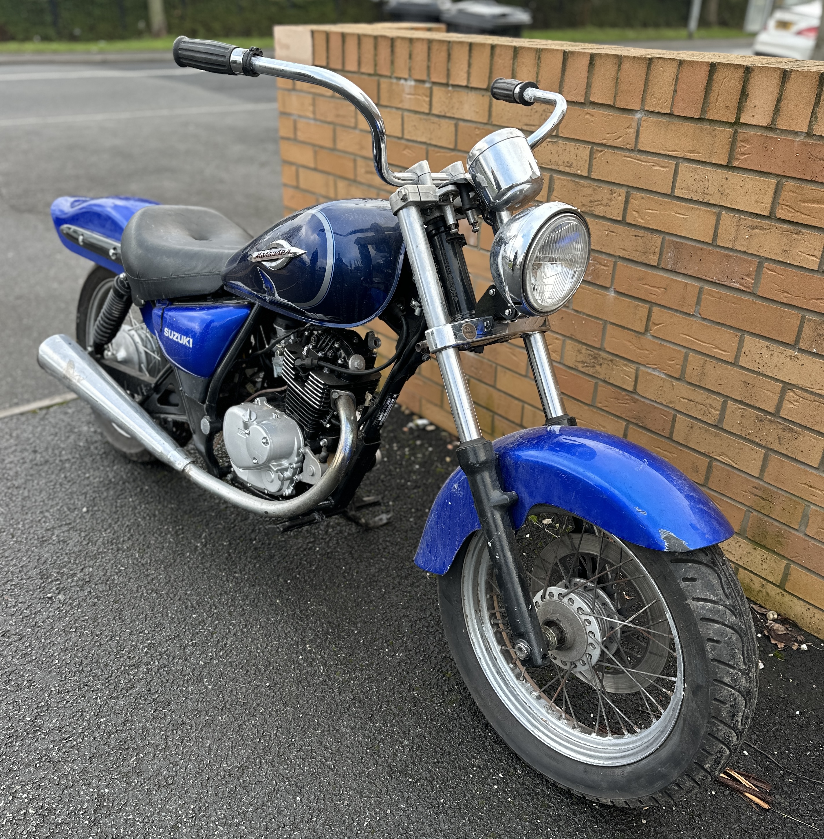 A Suzuki Marauder GZ125 cruiser-style motorcycle, finished in metallic blue with a black upholstered seat. The vehicle is powered by a single-cylinder engine and features chrome handlebars, a single circular headlight, and a long, upswept chrome exhaust pipe. The fuel tank, side panels, and rear mudguard bear the SUZUKI and Marauder identifiers. The motorcycle is equipped with wire-spoke wheels and a front disc brake.