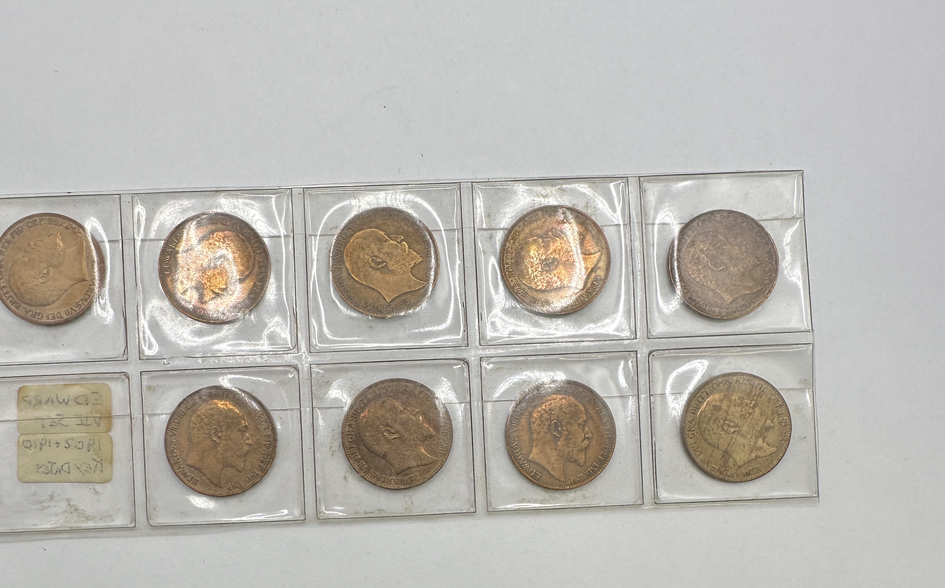 A collection of British bronze pennies dating from the reign of King Edward VII, spanning the years 1902 to 1910. Each coin is struck in bronze and features the uncrowned profile of the monarch on the obverse, surrounded by the inscription EDWARDVS VII DEI GRA: BRITT: OMN: REX FID: DEF: IND: IMP:. The reverse of each piece depicts the seated figure of Britannia with a trident and shield. The group is presented in a clear plastic multi-pocket protective sleeve and includes a handwritten paper insert identifying the lot as an Edward VII Set 1902-1910 Key Dates.