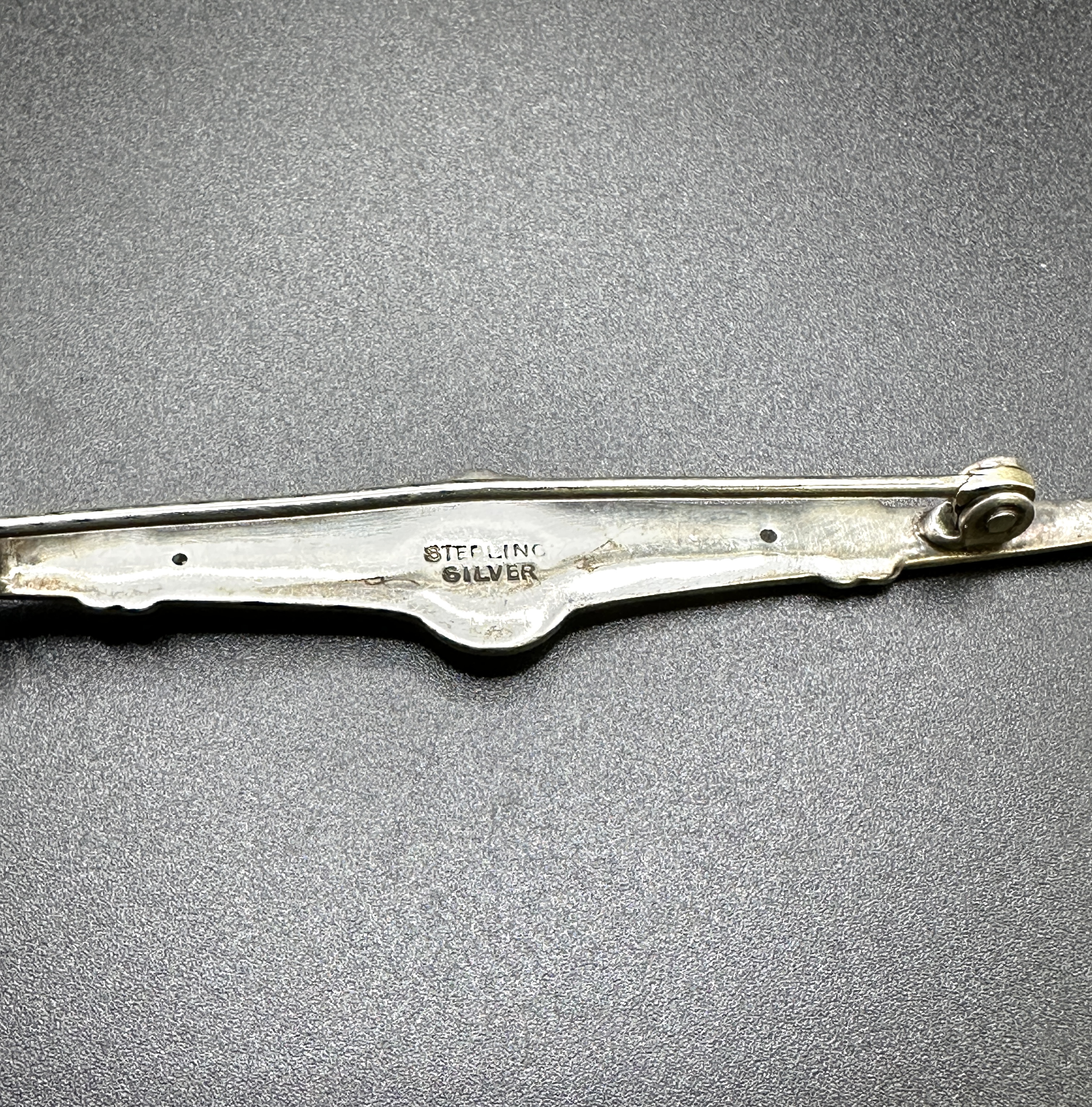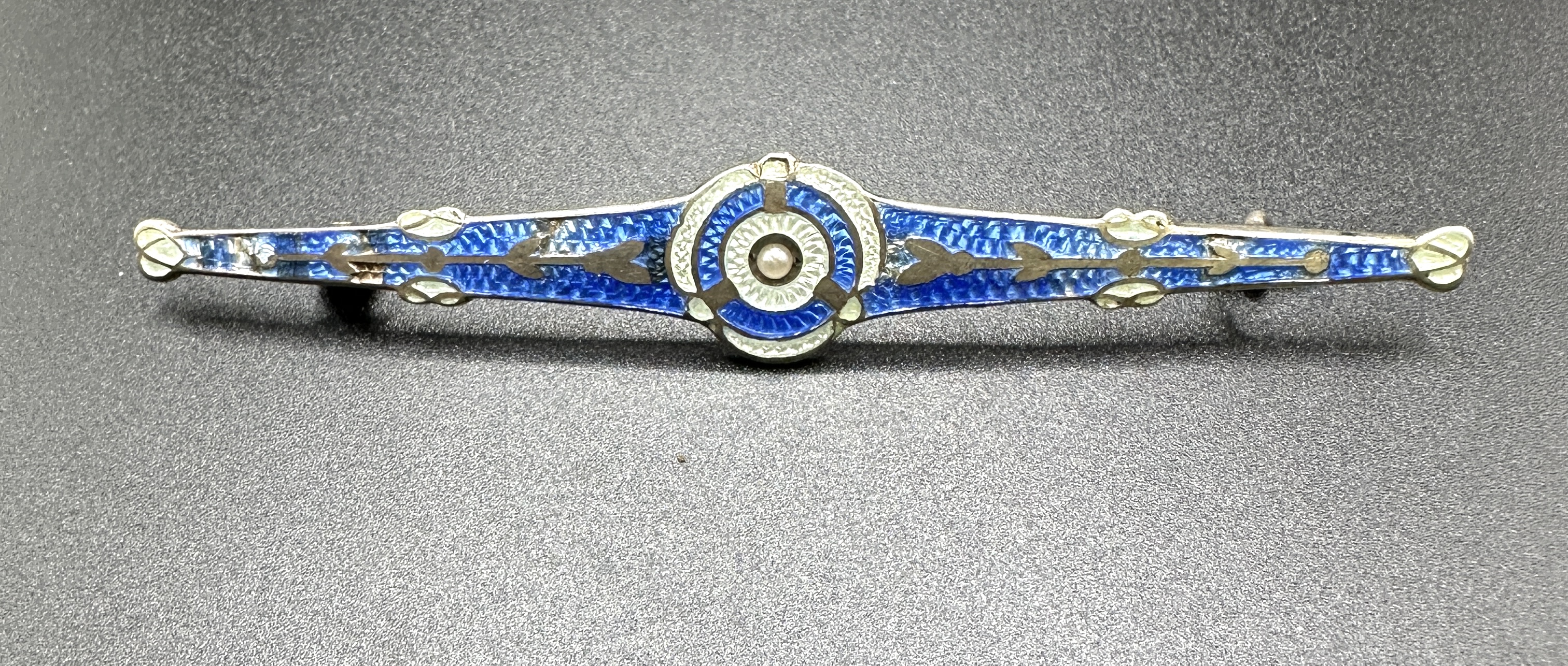 An Art Deco style bar brooch constructed from 925 silver featuring blue and white guilloché enamel. The piece is designed as an elongated, tapered bar with a central circular motif. The blue enamel is applied over a fine engine-turned pattern, accented by white enamel details at the centre and along the length of the bar. A single small seed pearl is set to the centre of the circular motif. The reverse of the brooch is stamped STERLING SILVER and is fitted with a pin and safety clasp.