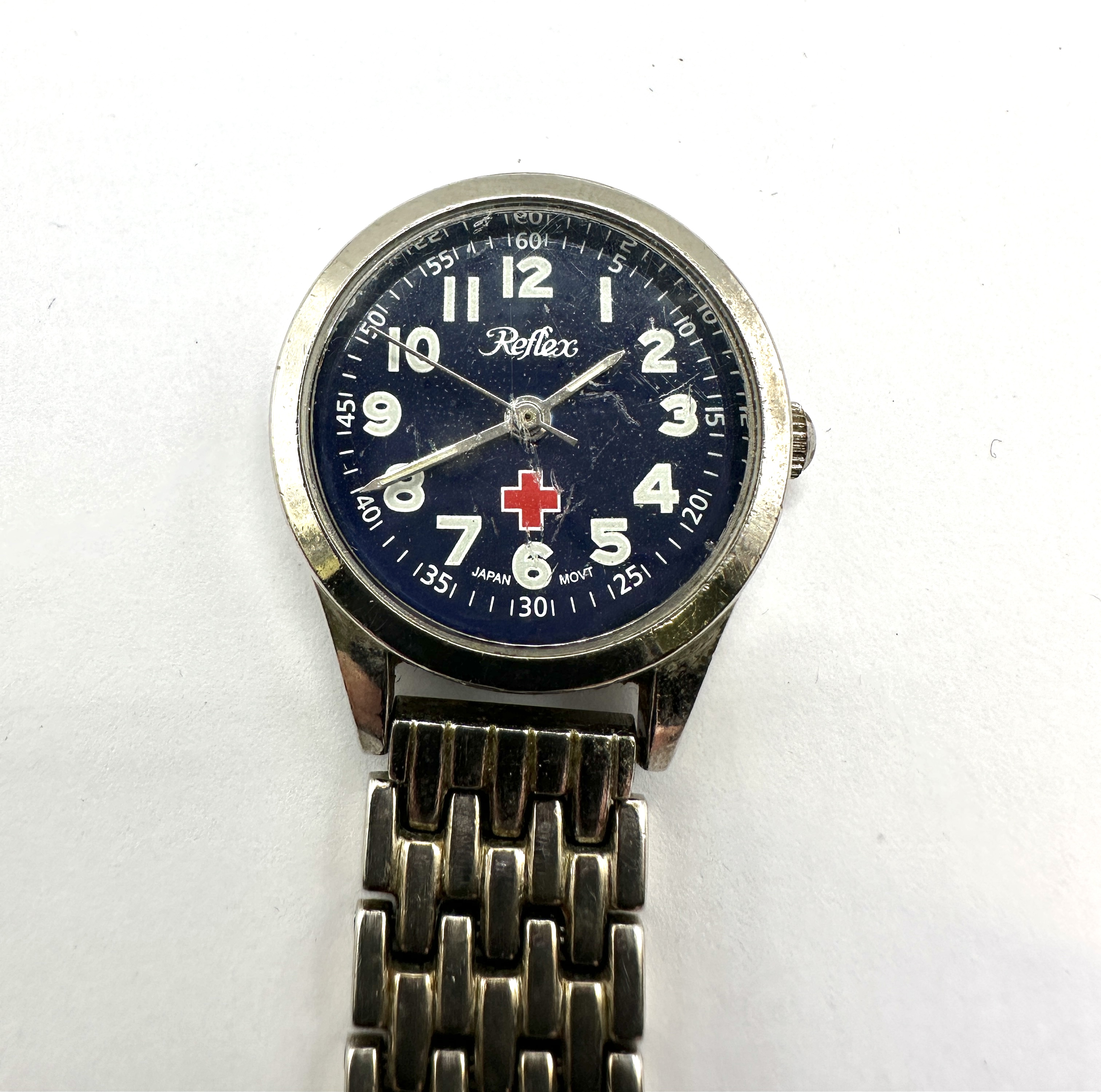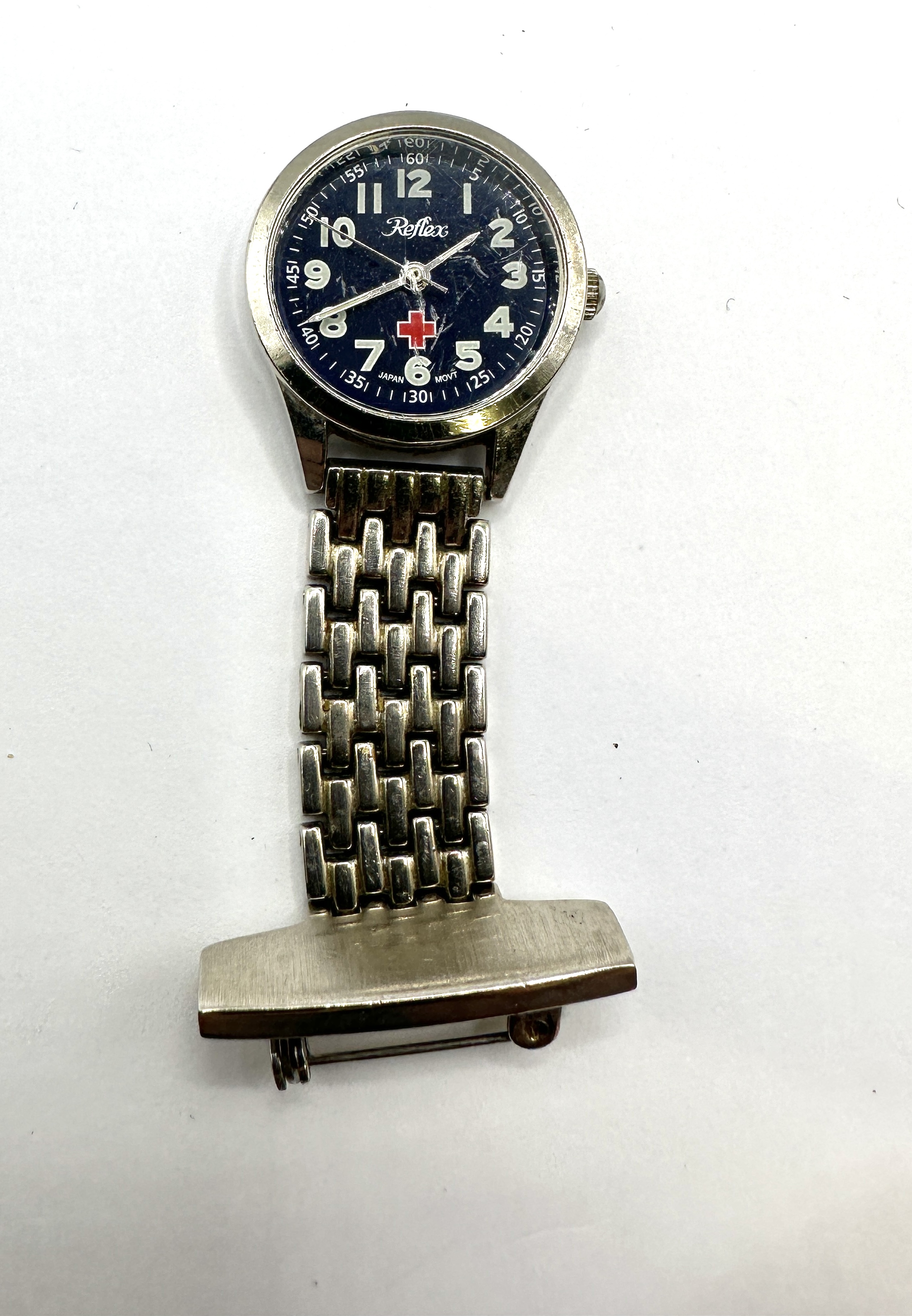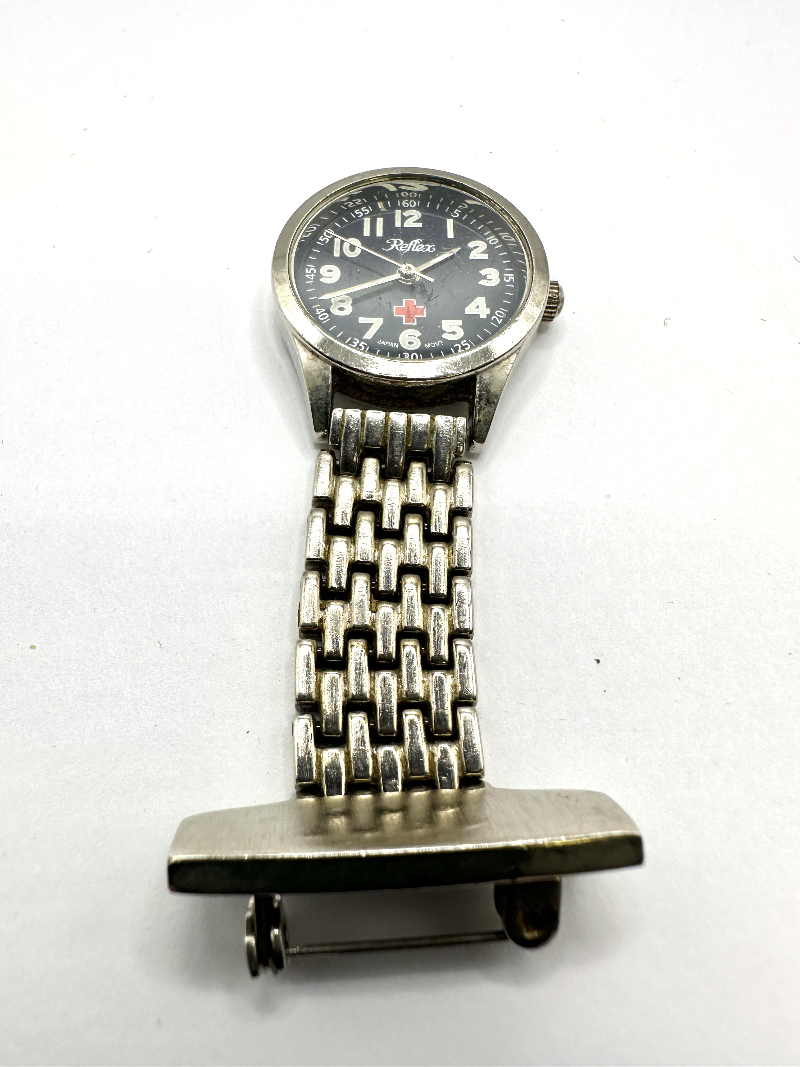 A Reflex nurse fob watch featuring a circular silver-tone metal case. The timepiece is attached to a matching link-style fob chain and a pin-back bar for lapel attachment. The black dial displays white Arabic numerals, a red cross symbol above the six o’clock position, and the brand name Reflex below the twelve o’clock position. The dial is further marked JAPAN MOVT at the bottom and includes an outer track showing sixty-second and minute increments in five-unit intervals. The watch is powered by a quartz movement.