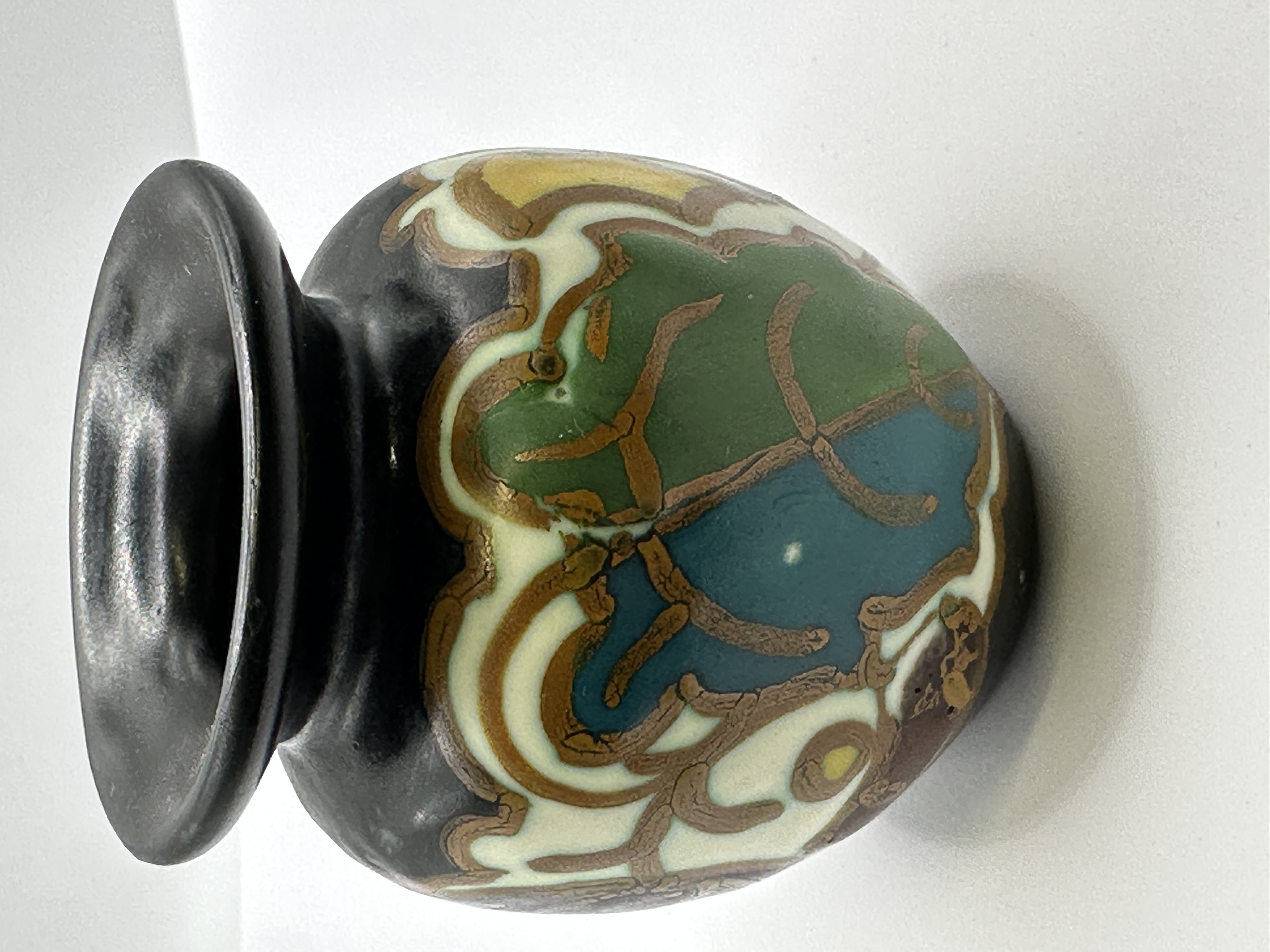 A Dutch Gouda art pottery vase featuring an ovoid body, short neck, and flared rim. The exterior is decorated in the Peli pattern, characterised by abstract Art Nouveau-inspired foliate designs in matte shades of green, blue, and yellow. The decoration is set against a cream-coloured ground and outlined with raised brown linework. The upper section and neck are finished in a matte black glaze. The base bears handwritten markings in a gold-coloured glaze, including Hvt. 253, PL: B., and GOUDA, identifying the maker and pattern.