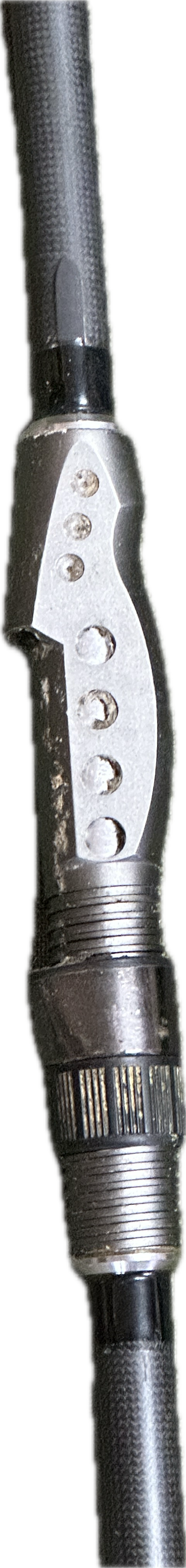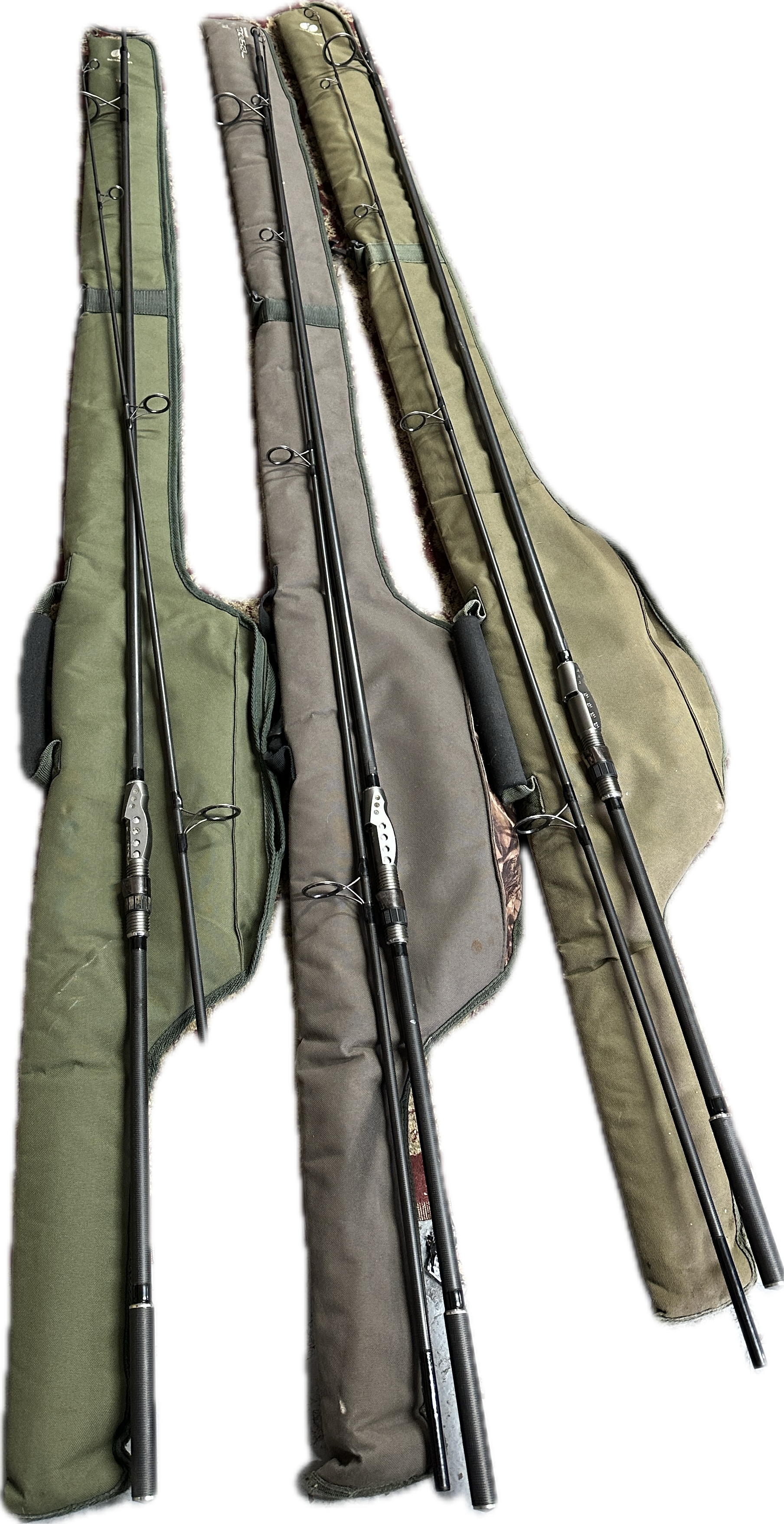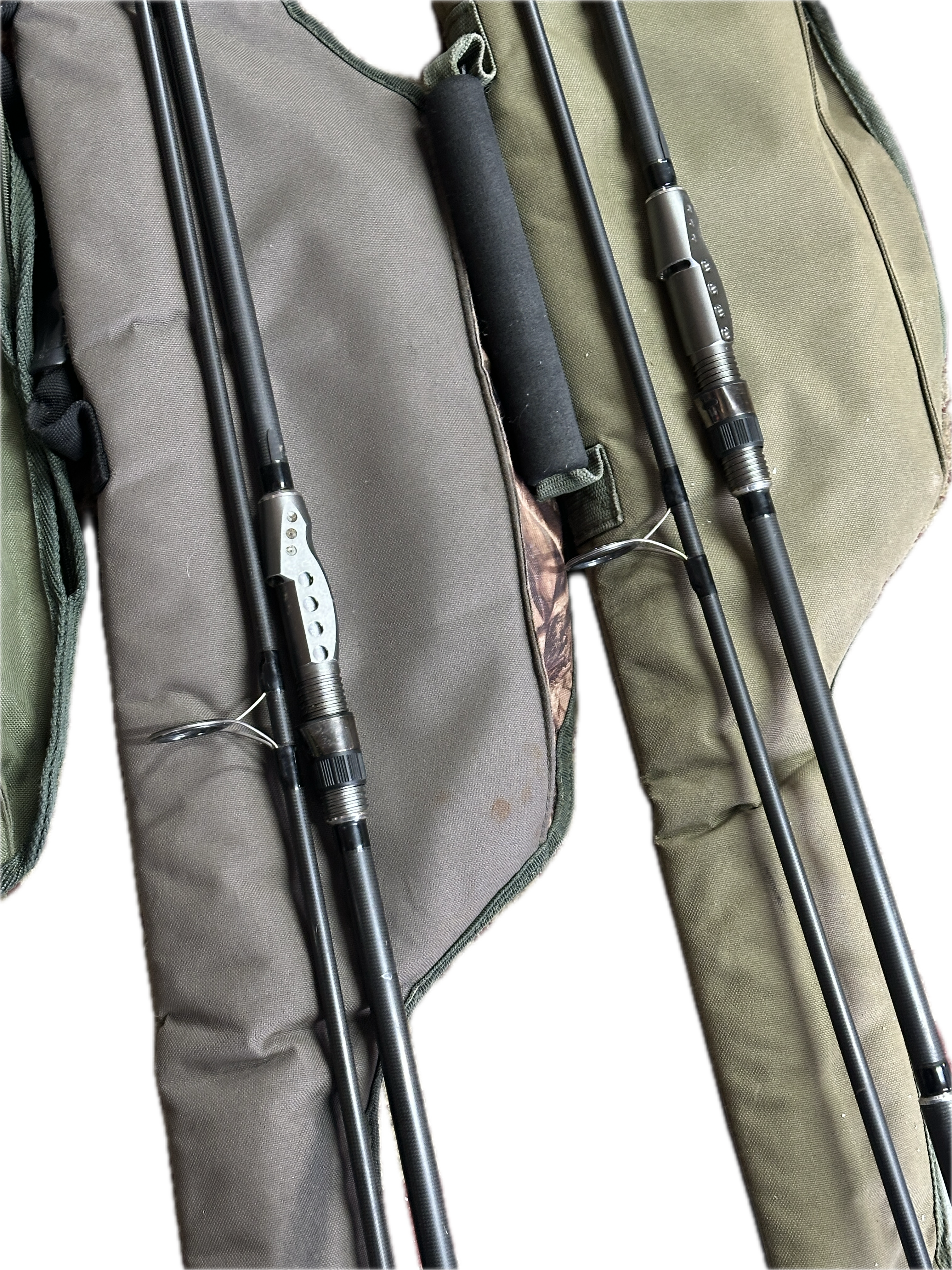 A trio of contemporary two-piece fishing rods and associated Speero adjustable rod sleeves. The rods are constructed from a dark-toned composite material and are fitted with silver-finished metal reel seats featuring a series of circular perforations. The accompanying padded fabric sleeves are finished in olive green and taupe. Two of the sleeves are marked with the Shimano brand and a length of 12 feet. The sleeves are designed with adjustable sections and integrated carrying handles.