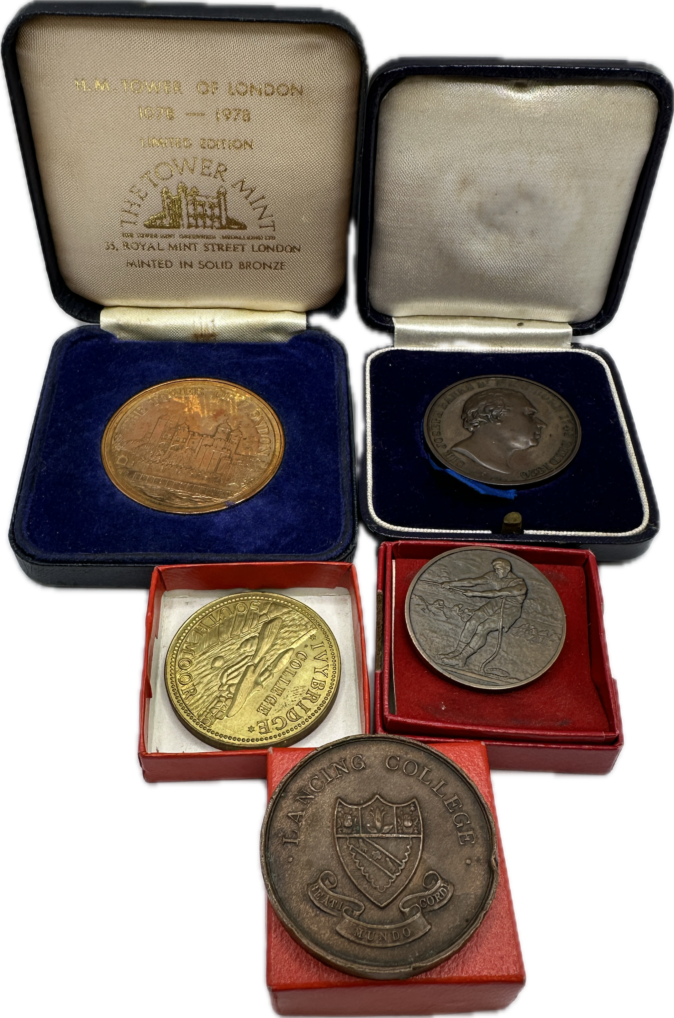 A collection of commemorative and academic medals struck in various metals including bronze, brass, and white metal. The group features a limited edition solid bronze medal from The Tower Mint, London, commemorating the 900th anniversary of the Tower of London (1078-1978), housed in its original blue presentation case with gilt lettering. Also included is a portrait medal of Sir Joseph Banks (1743-1820) in a fitted case. Academic medals comprise a brass Ivybridge College medal and a bronze Lancing College medal featuring the school coat of arms and the motto Beati Mundo Corde. The collection is completed by a medal depicting a tug-of-war strength competition. Several items are accompanied by their original presentation boxes.